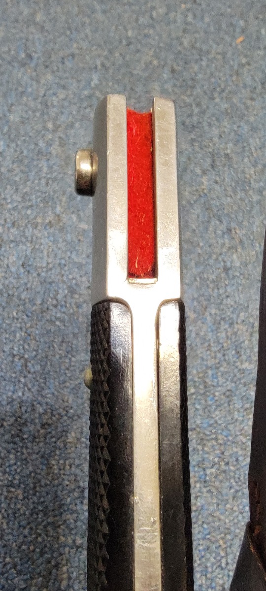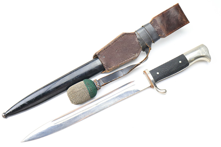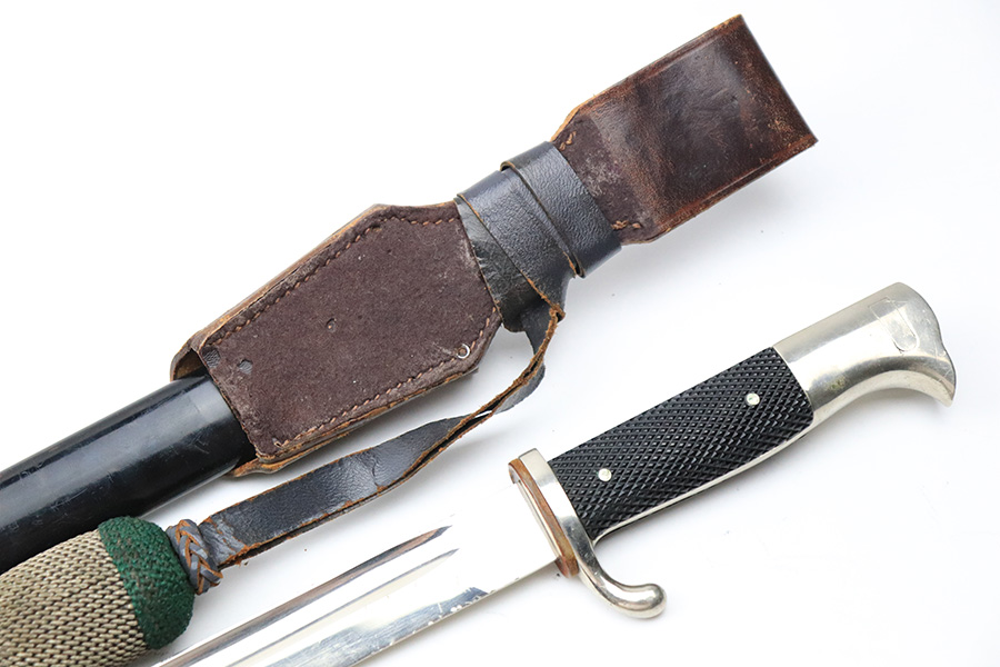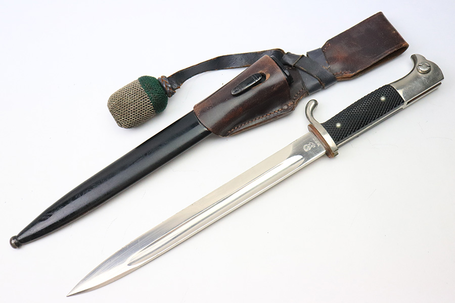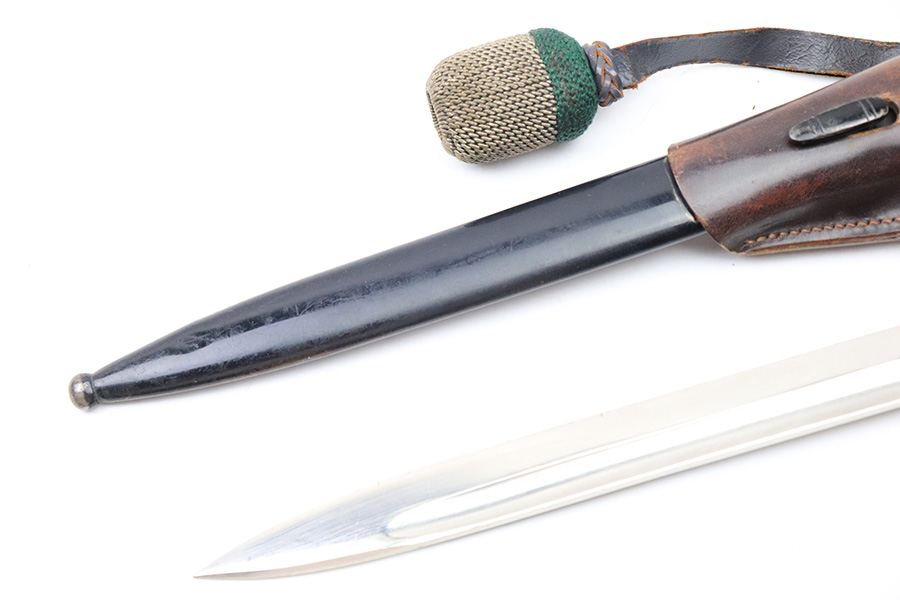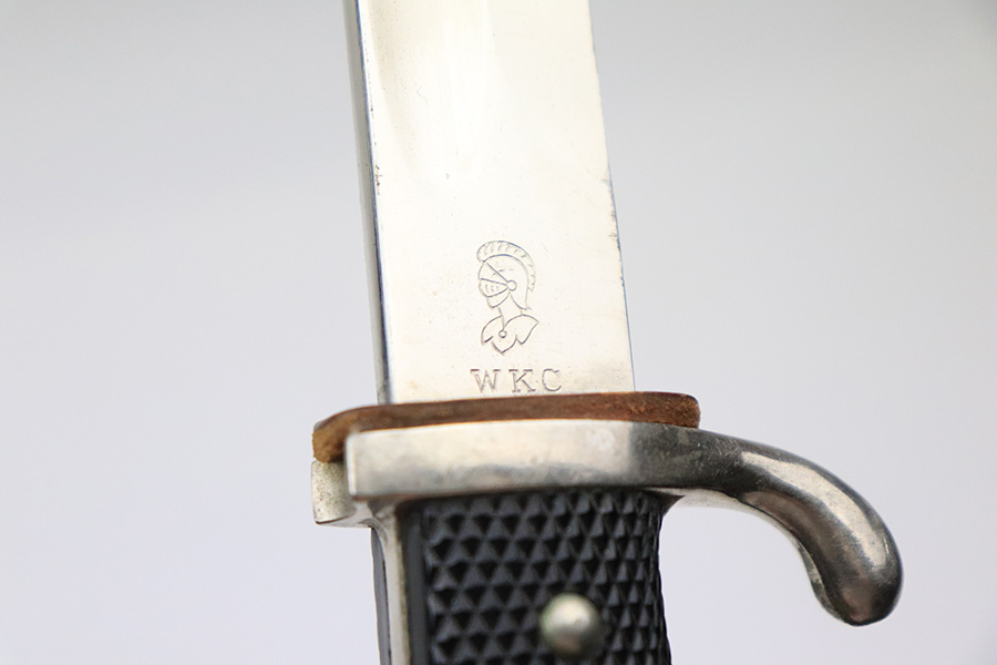 6/15/22 – This is an original WW2 production German K98 dress / parade bayonet. The bayonet comes with a shiny blade, original leather stopper, red felt in the handle groove, original scabbard, leather frog, and portepee. The blade is in great condition with some mild surface scratches and a few small dings along the edge. Maker stamped by WKC on one side. The handle is in excellent condition as is the leather stopper. The scabbard has some minor surface patina but no major issues. The leather frog has no markings or stamps but is in great condition, as is the portepee.