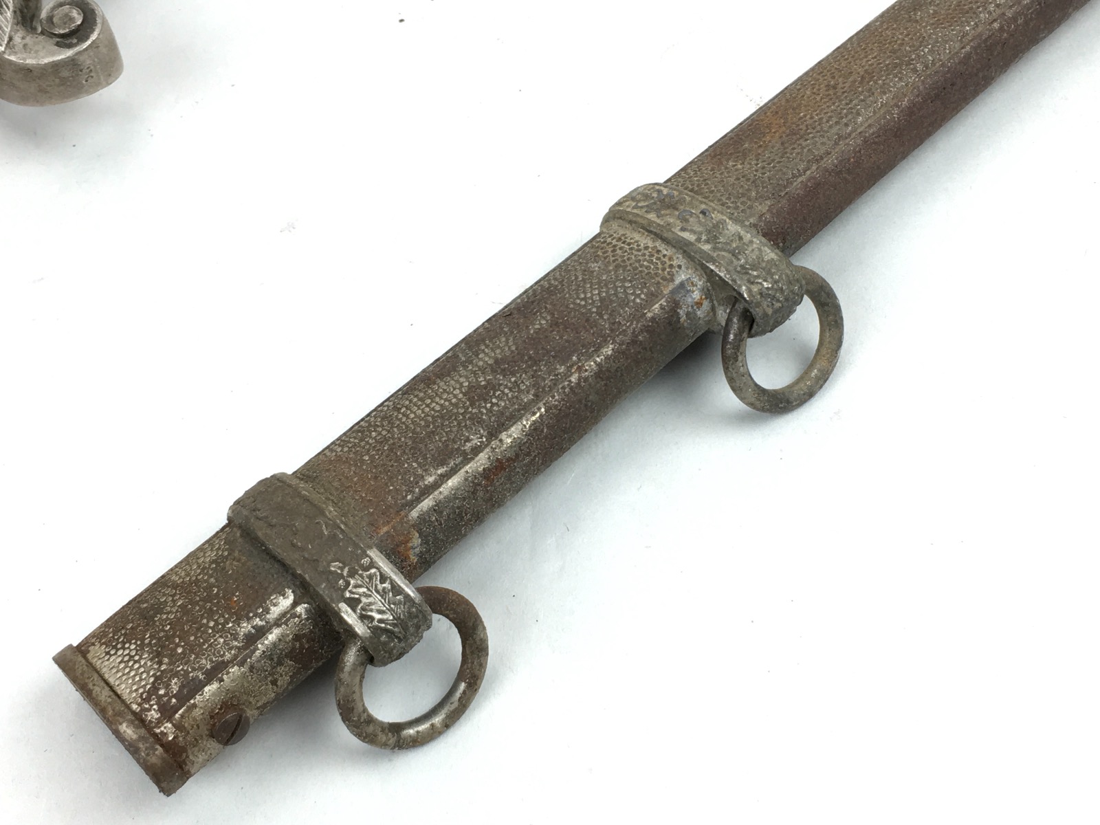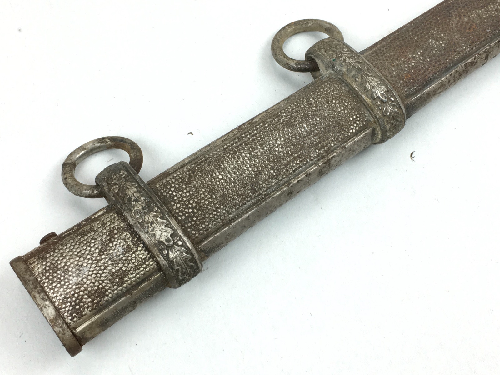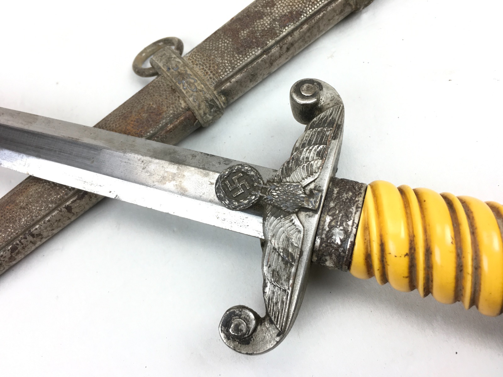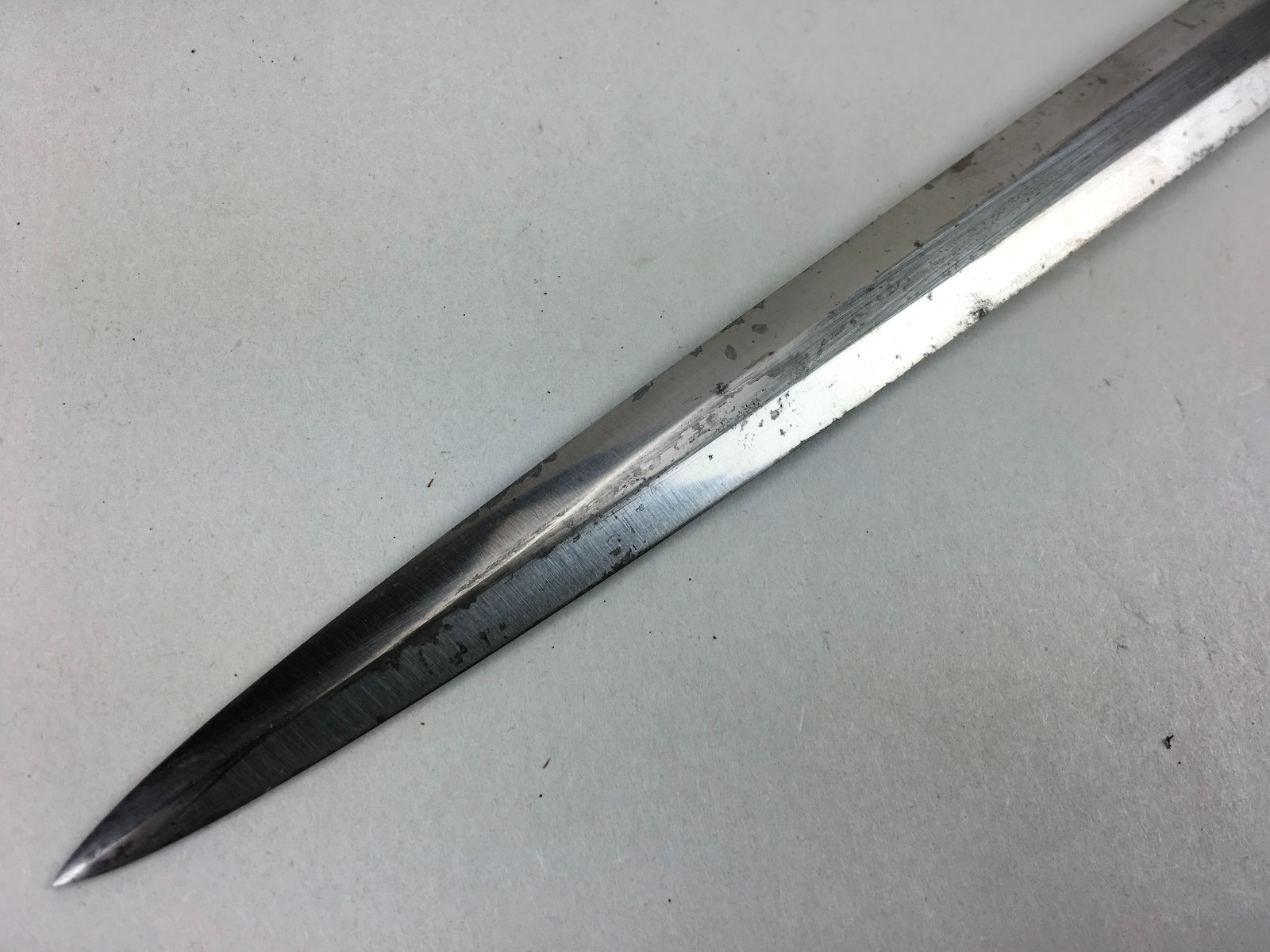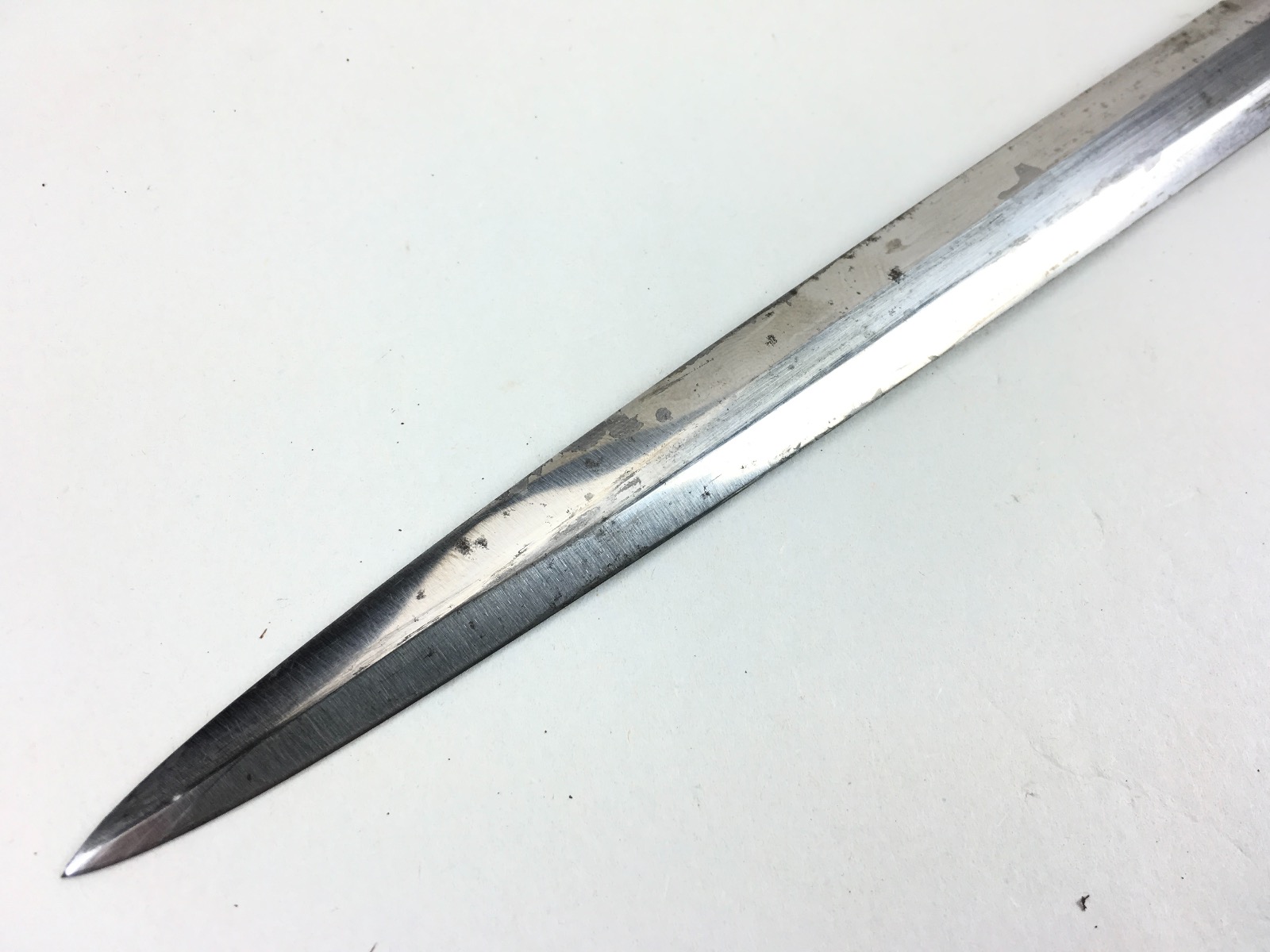 7/30/19 – Original, fair condition WKC Solingen Nazi Army Dress dagger from WWII. The maker logo and named etched in the blade hilt. There is surface corrosion on pretty much all the nickel plate. Blade is stained and has corrosion but no pitting. Handle/grip has nice amber coloring with no cracks. It is secure on the tang. The scabbard has surface corrosion but no dents or cracks. Guaranteed authentic.