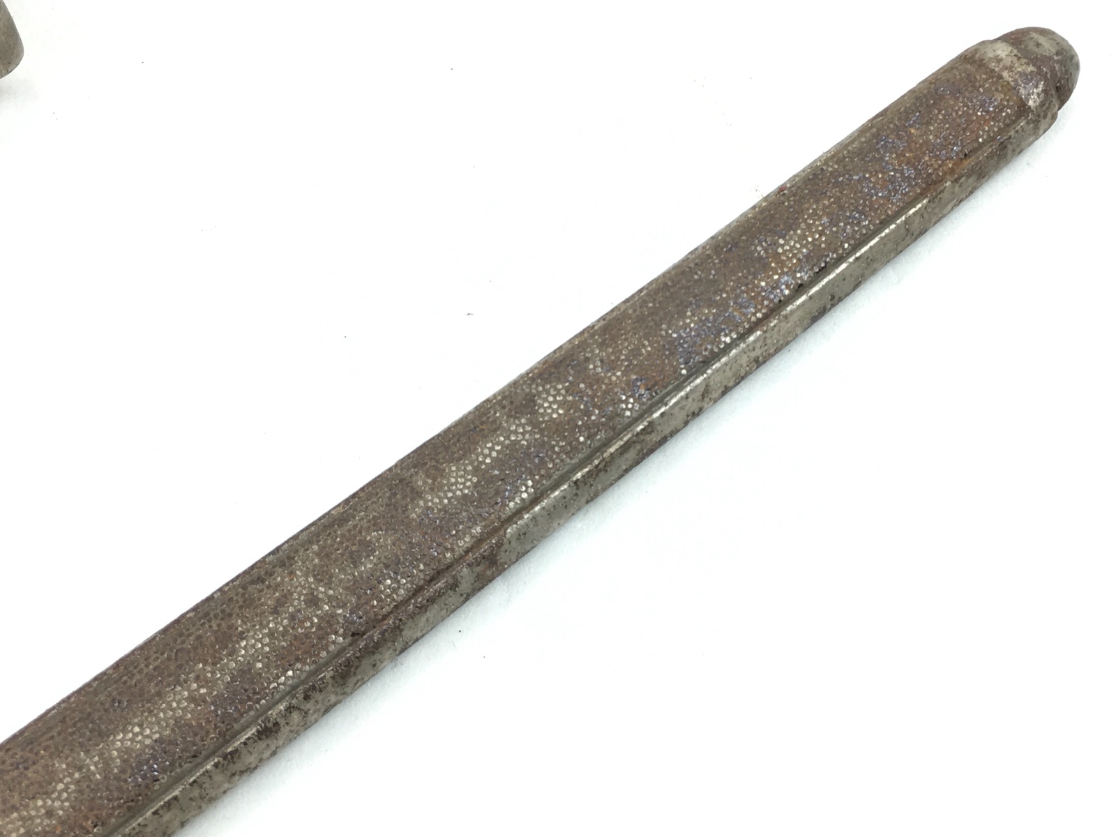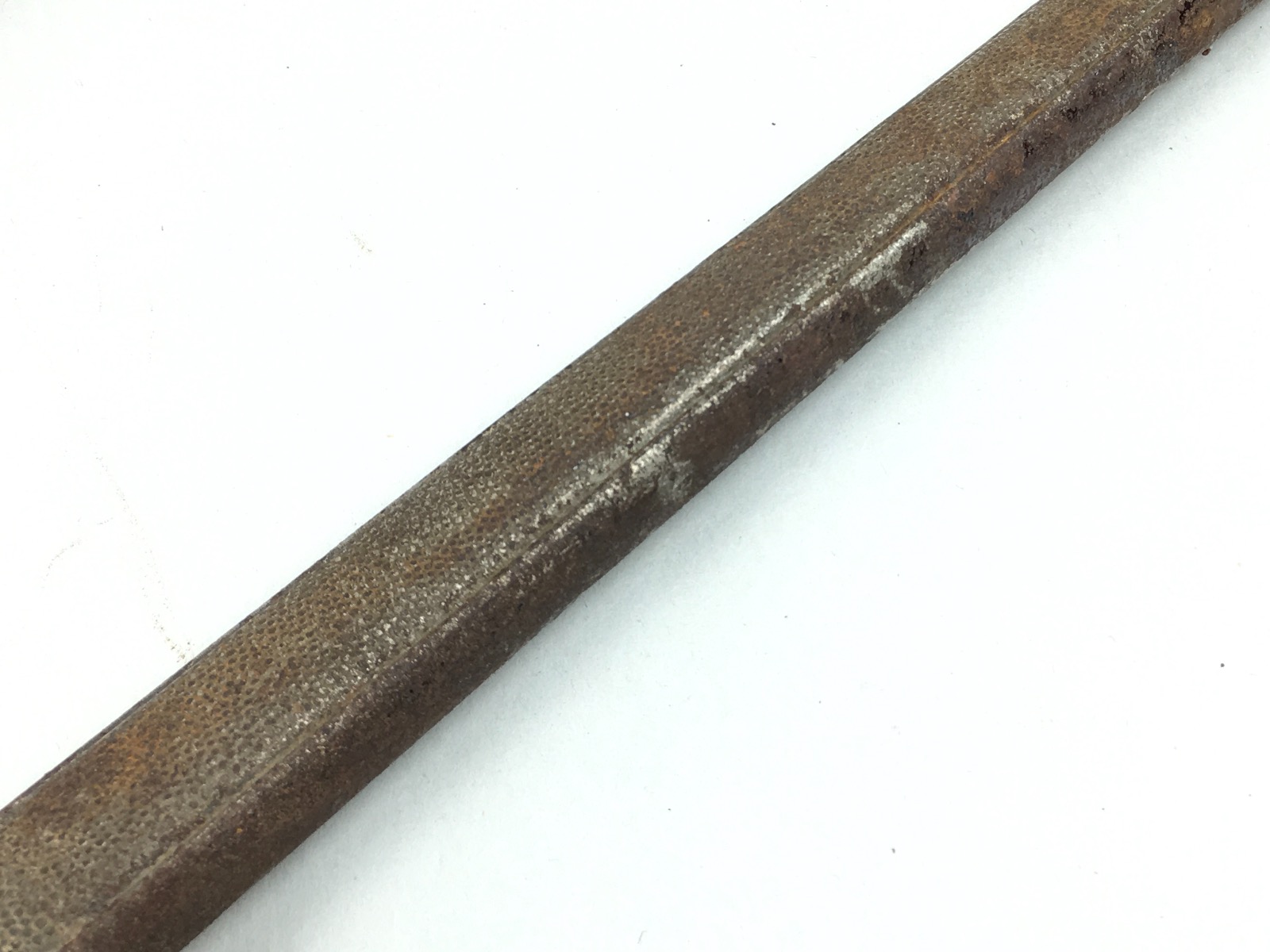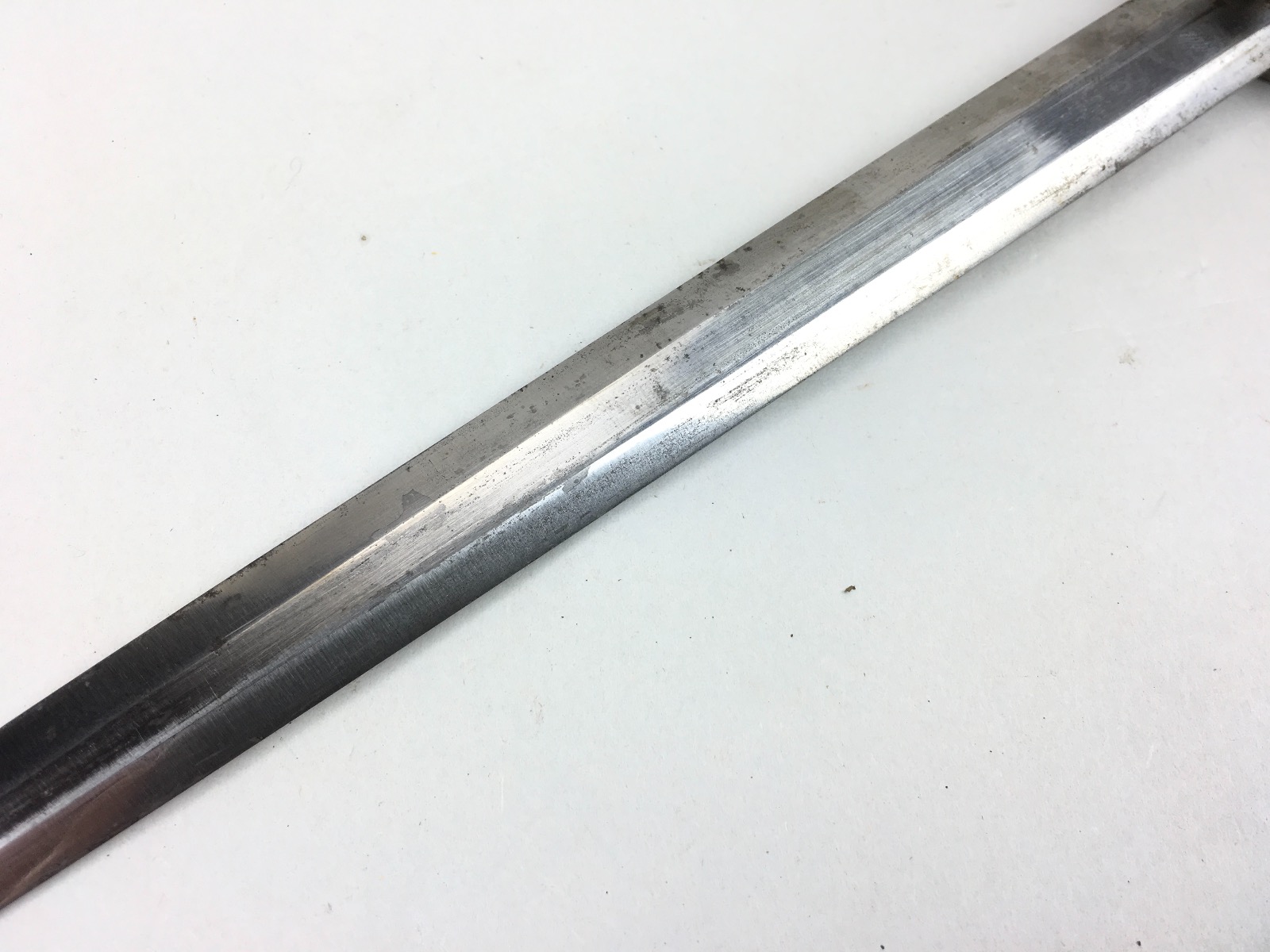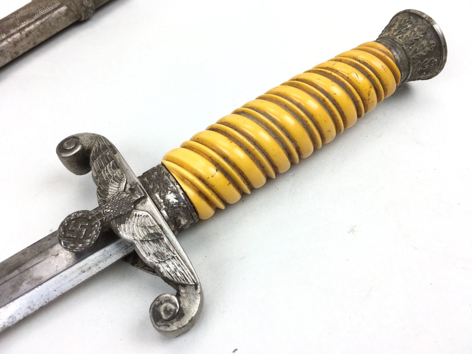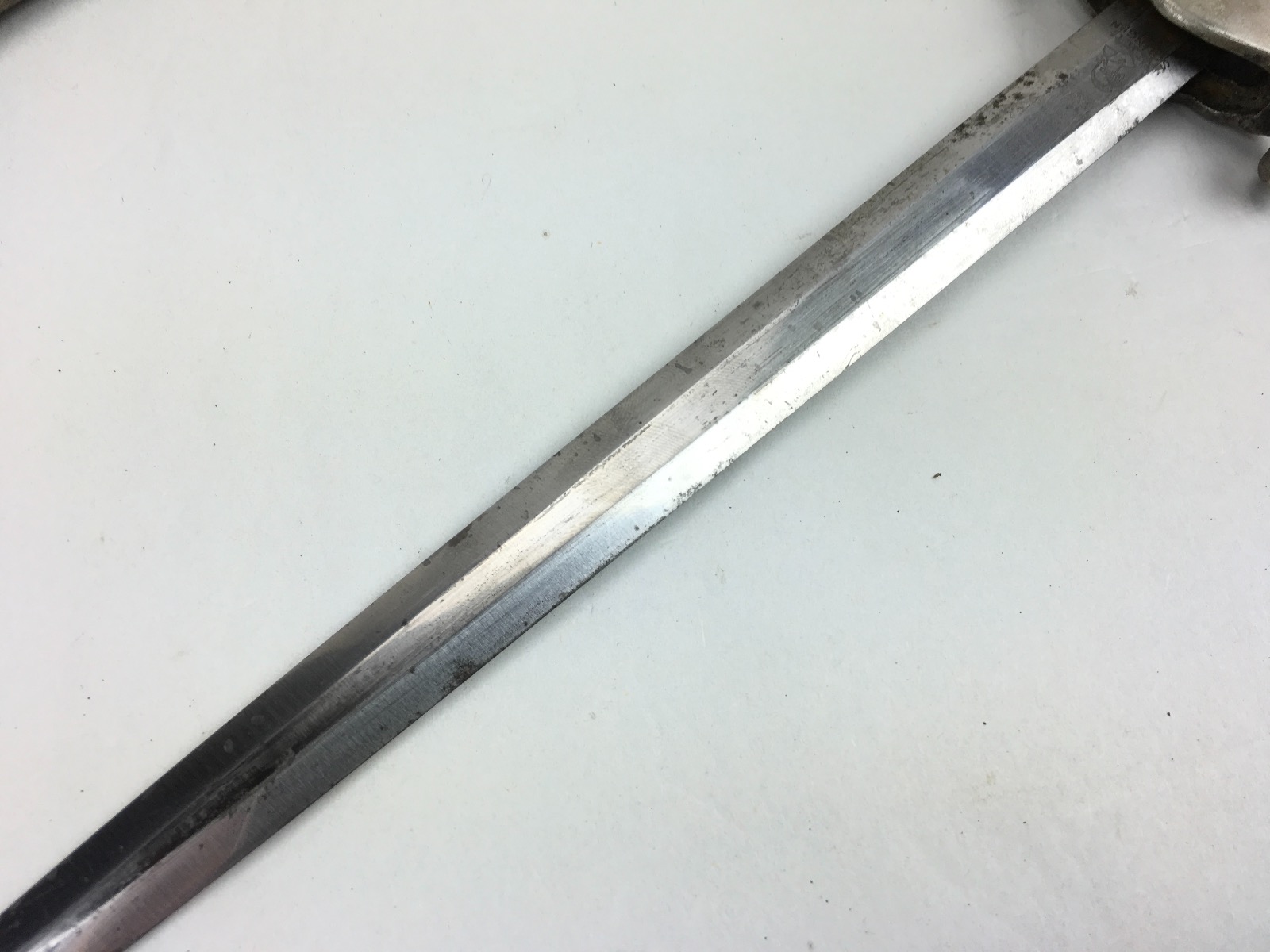 7/30/19 – Original, fair condition WKC Solingen Nazi Army Dress dagger from WWII. The maker logo and named etched in the blade hilt. There is surface corrosion on pretty much all the nickel plate. Blade is stained and has corrosion but no pitting. Handle/grip has nice amber coloring with no cracks. It is secure on the tang. The scabbard has surface corrosion but no dents or cracks. Guaranteed authentic.