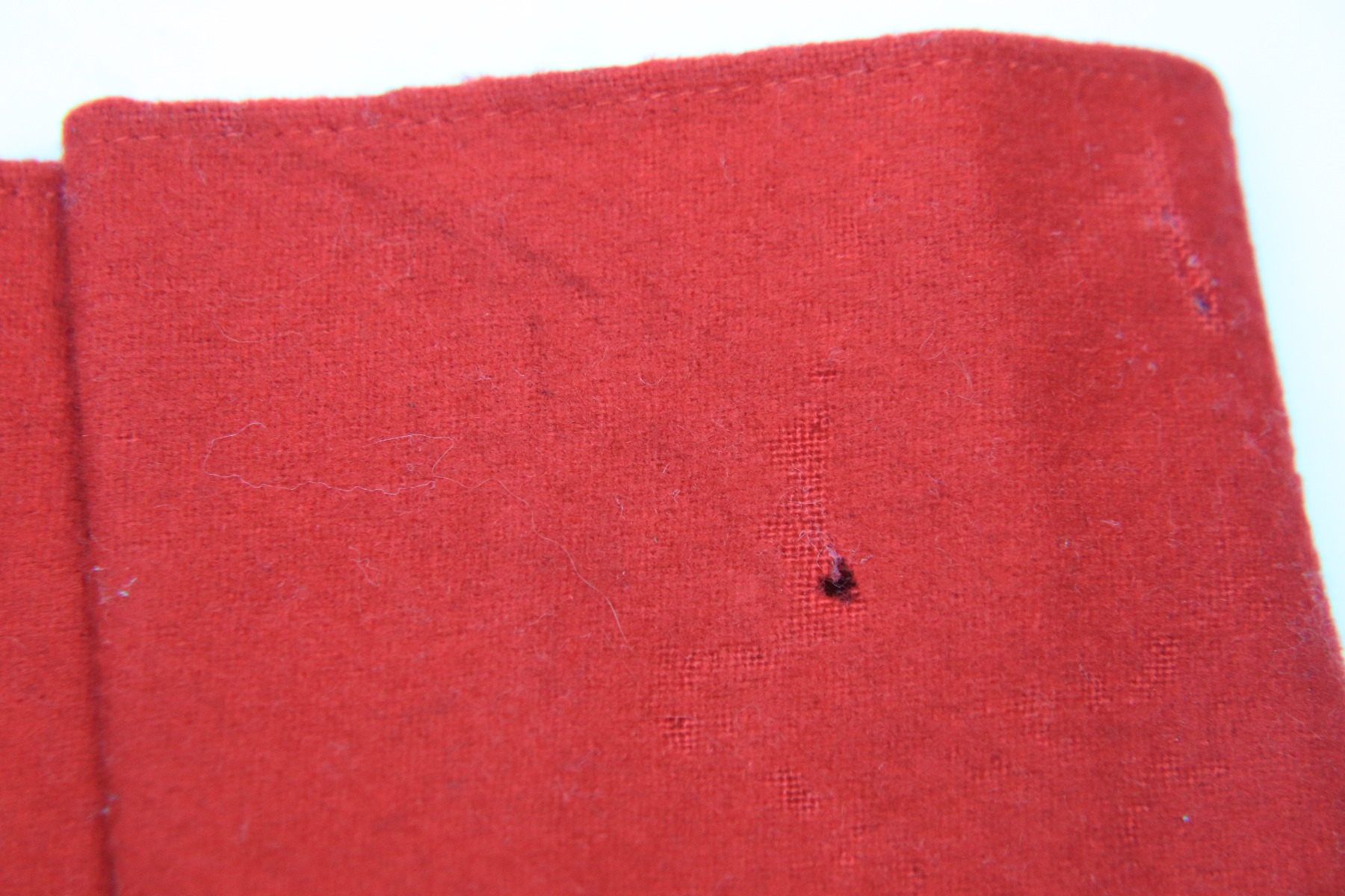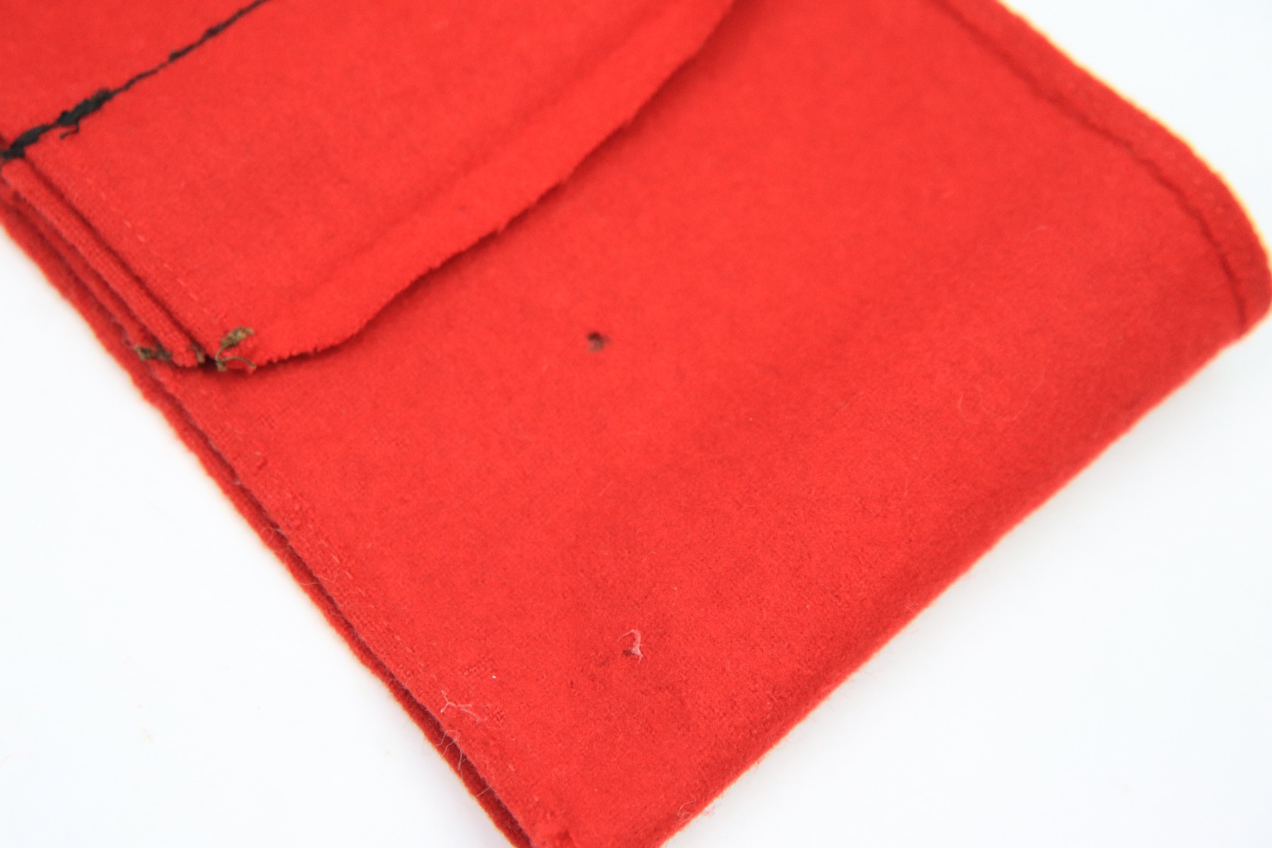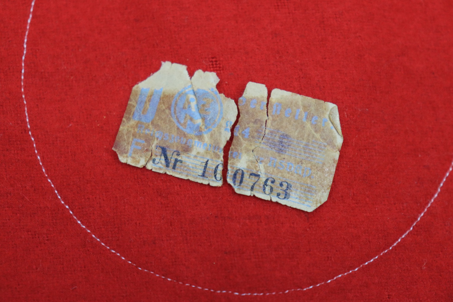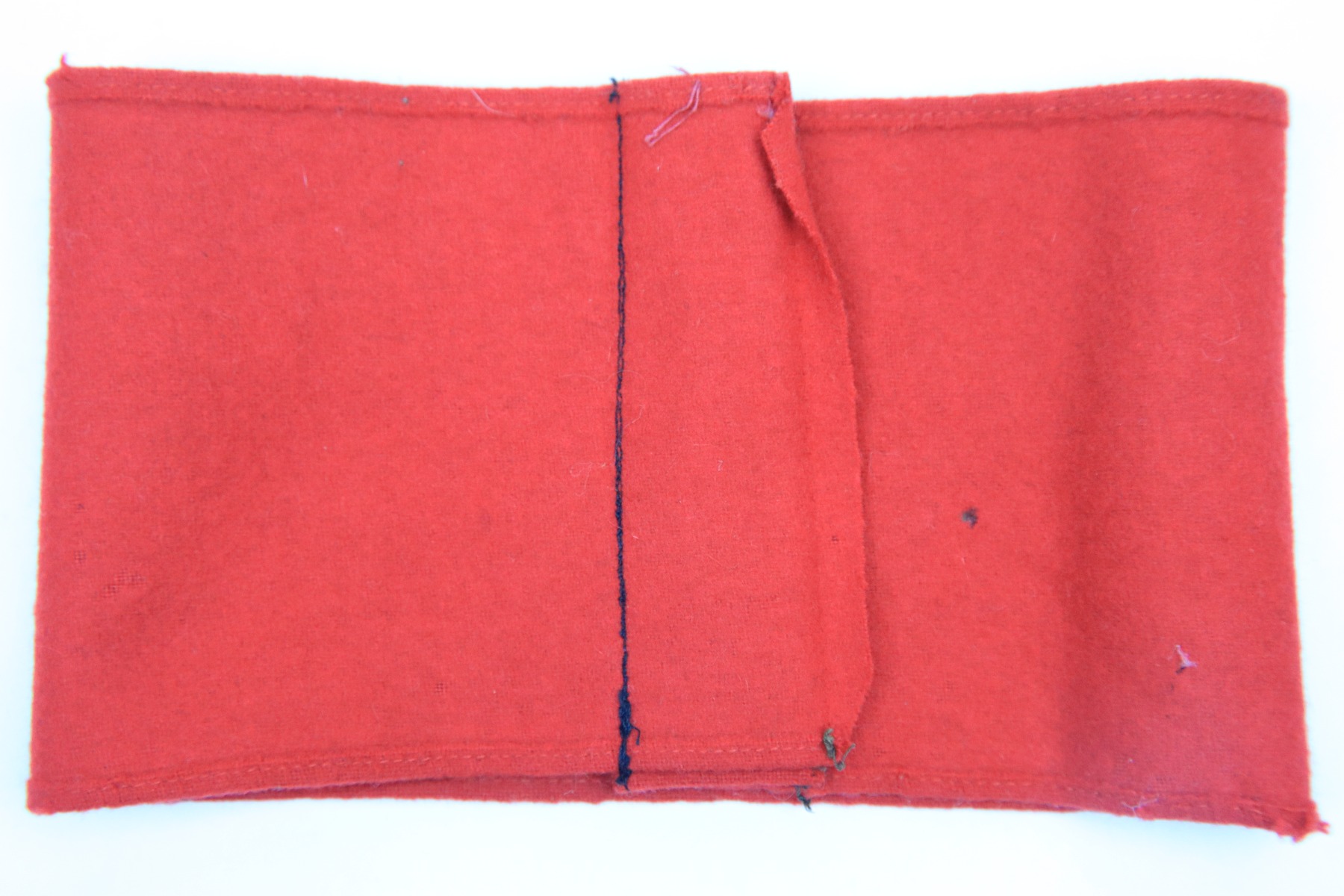 12/1/22 – This is an original wool Nazi uniform armband from WW2. The armband features a sewn-on white circle with a sewn-on swastika in the center. The circle is yellowed with age but the stitching is in excellent condition throughout the armband. The back seam of the armband appears re-stitched with black stitching, which suggests the previous owner made a sizing adjustment. The black stitching doesn’t glow under a black light. The interior of the armband has a tattered RZM tag, as shown. There are a few small moth holes in the wool, but overall in great shape.