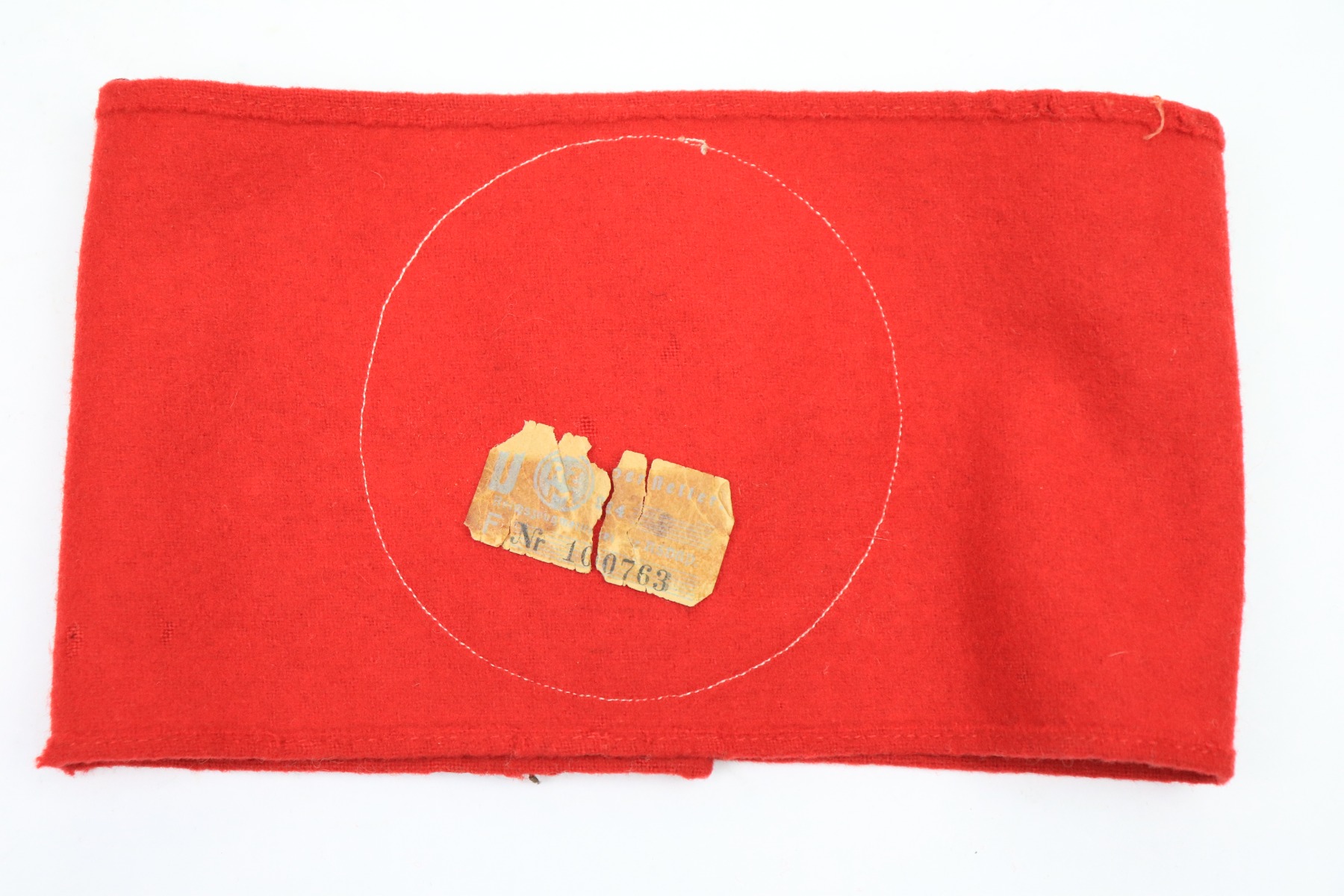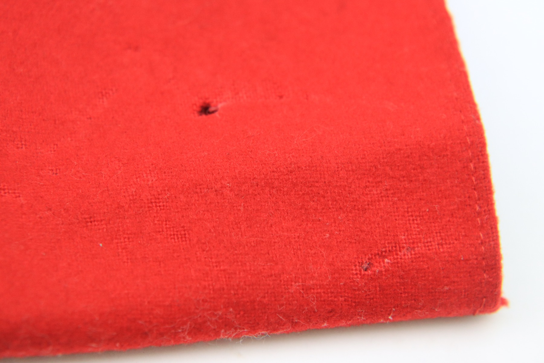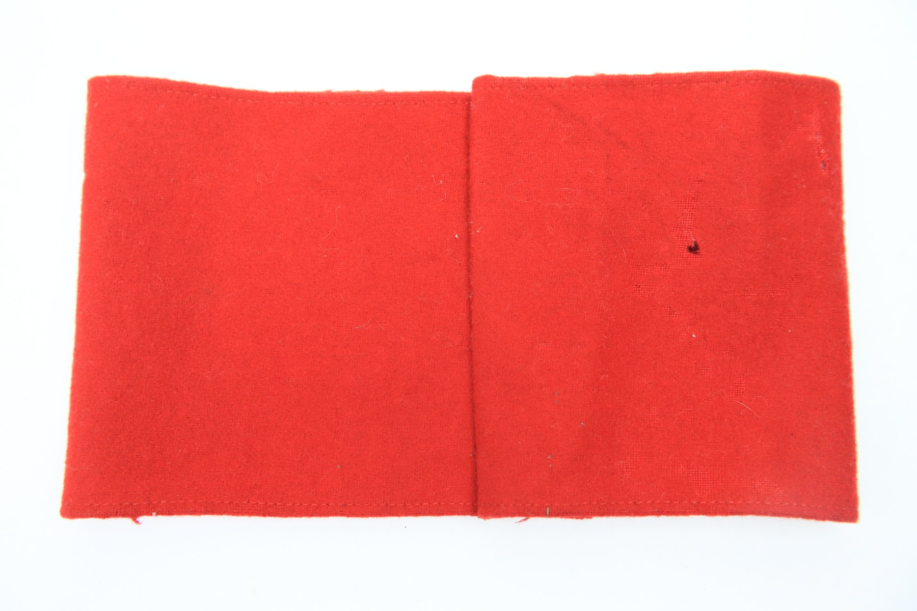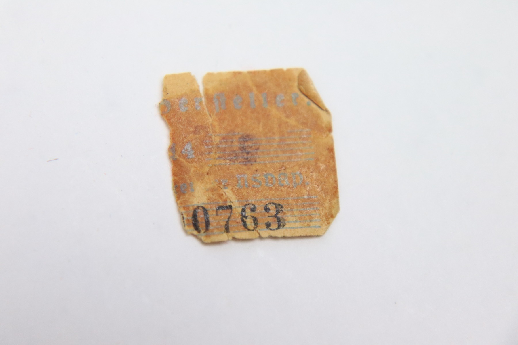 12/1/22 – This is an original wool Nazi uniform armband from WW2. The armband features a sewn-on white circle with a sewn-on swastika in the center. The circle is yellowed with age but the stitching is in excellent condition throughout the armband. The back seam of the armband appears re-stitched with black stitching, which suggests the previous owner made a sizing adjustment. The black stitching doesn’t glow under a black light. The interior of the armband has a tattered RZM tag, as shown. There are a few small moth holes in the wool, but overall in great shape.