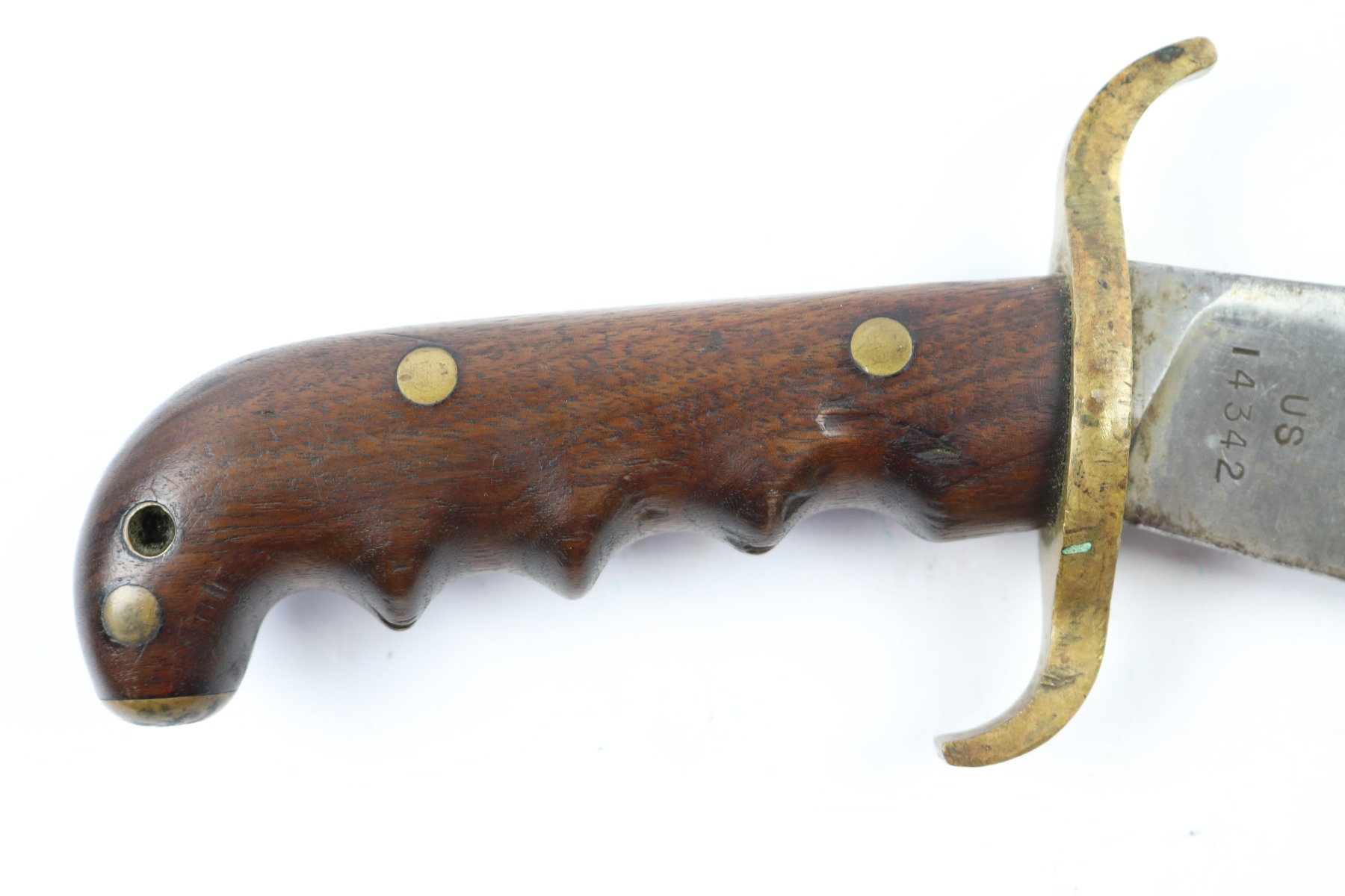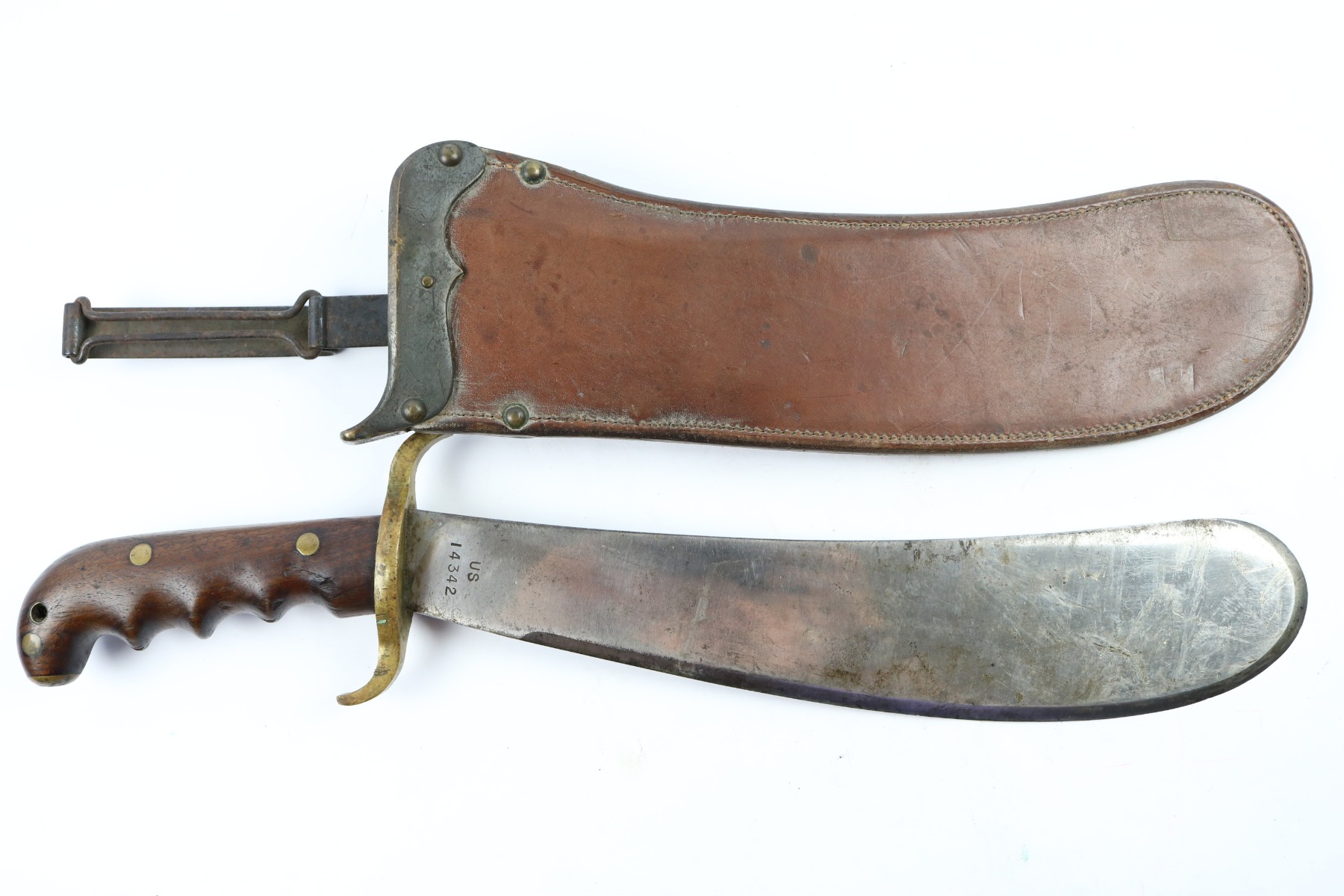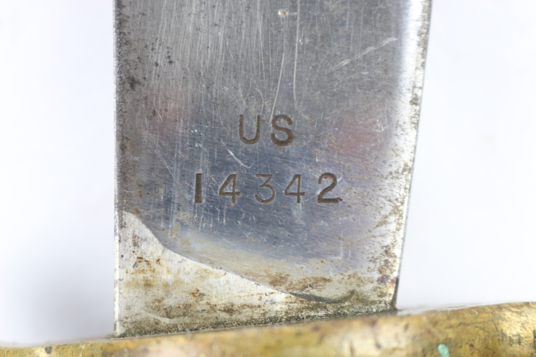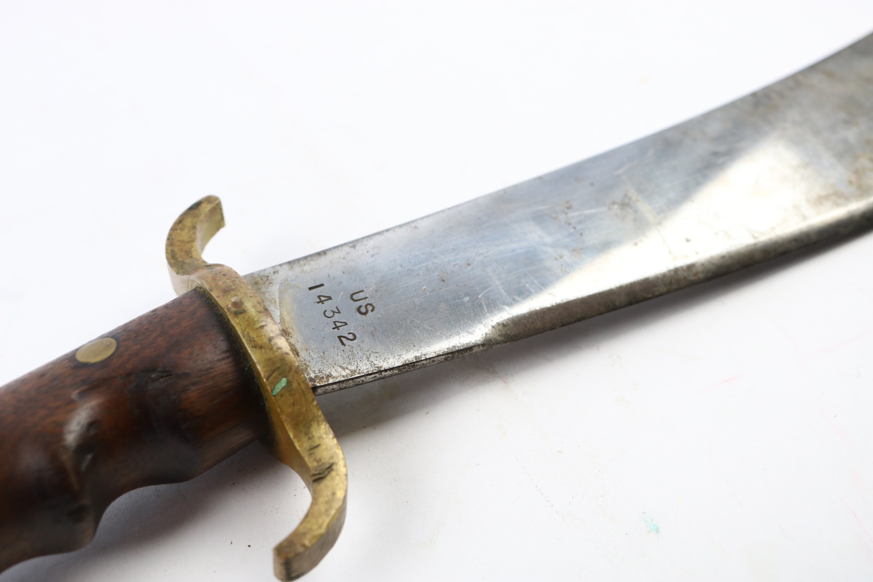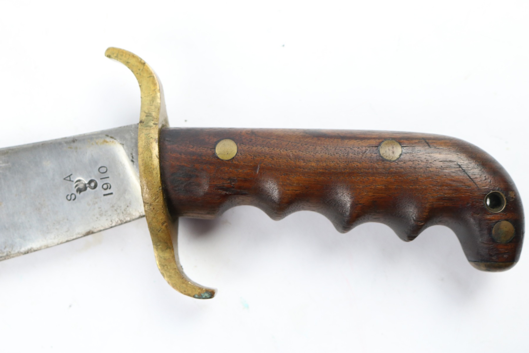 5/23/18 – This is an original WW1 US Bolo knife. The blade is “SA” marked for springfield arsenal and 1910. The reverse side US 14342 stamped. The blade is in great shape but has some light browning discoloration and a few surface scratches. The edge doesn’t appear to be messed with or sharpened. The handle and scabbard are both in excellent condition. The scabbard is 1912 dated made by Rock Island Arsenal. Guaranteed original and authentic.