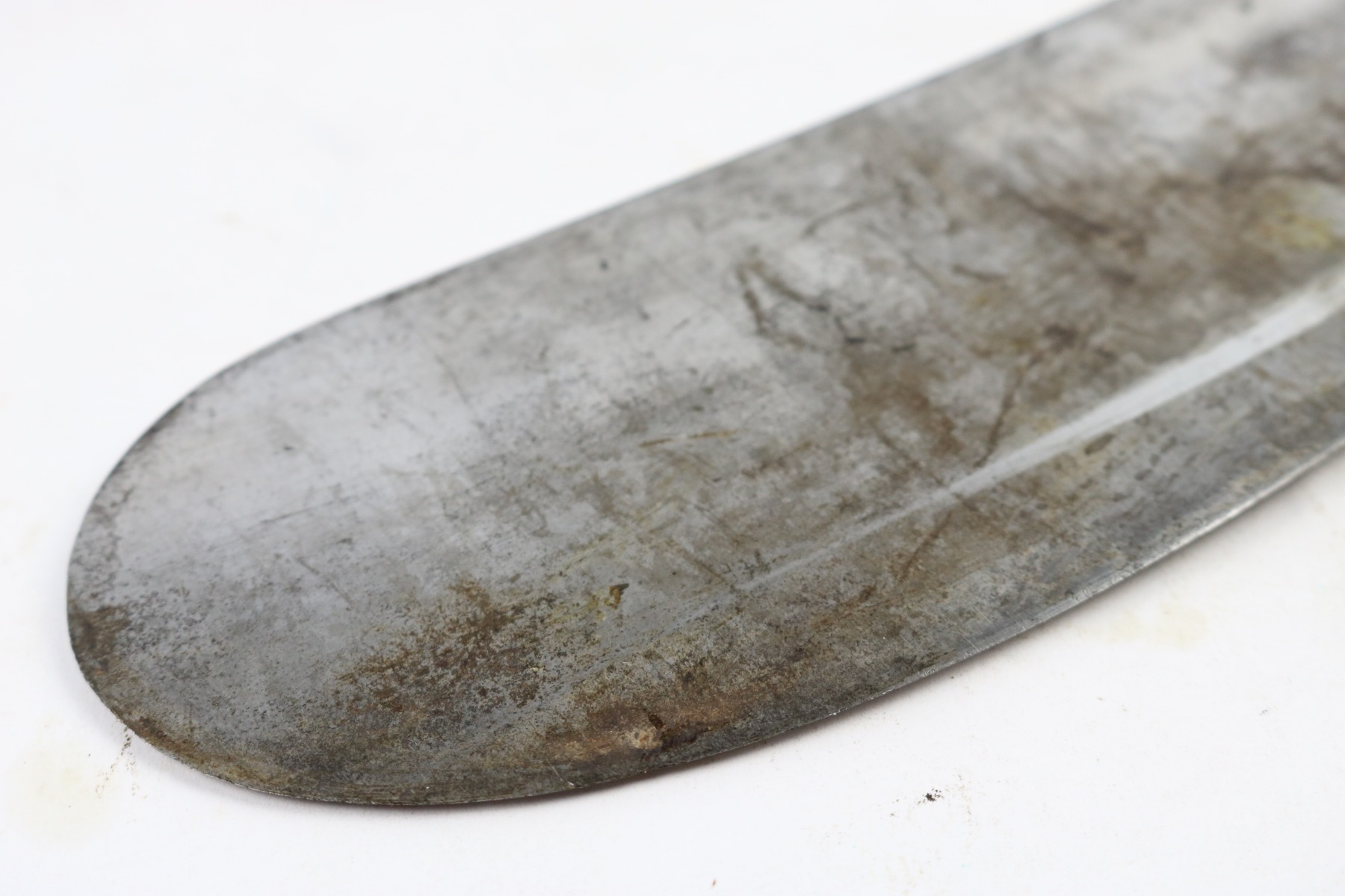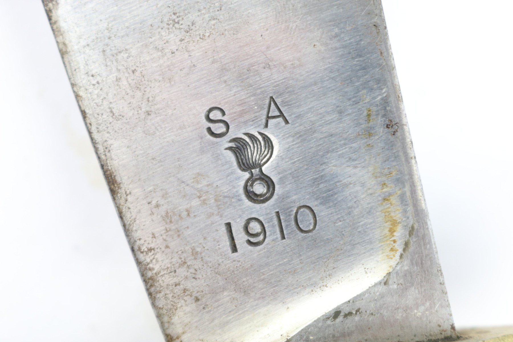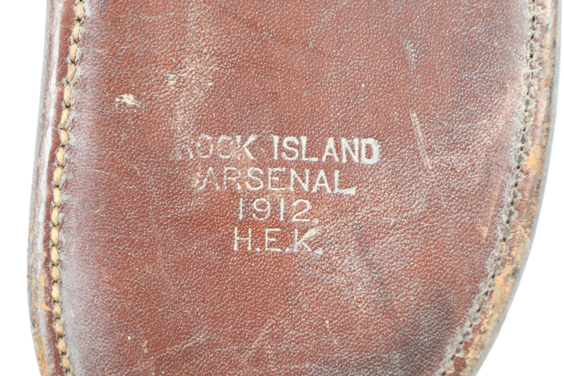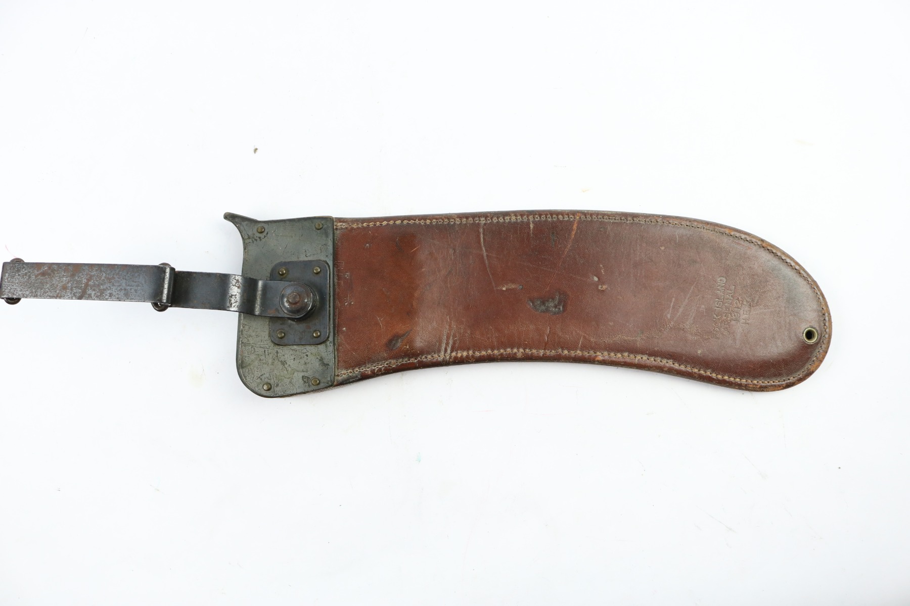 5/23/18 – This is an original WW1 US Bolo knife. The blade is “SA” marked for springfield arsenal and 1910. The reverse side US 14342 stamped. The blade is in great shape but has some light browning discoloration and a few surface scratches. The edge doesn’t appear to be messed with or sharpened. The handle and scabbard are both in excellent condition. The scabbard is 1912 dated made by Rock Island Arsenal. Guaranteed original and authentic.