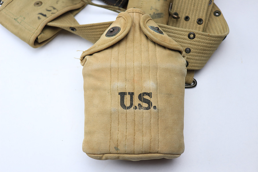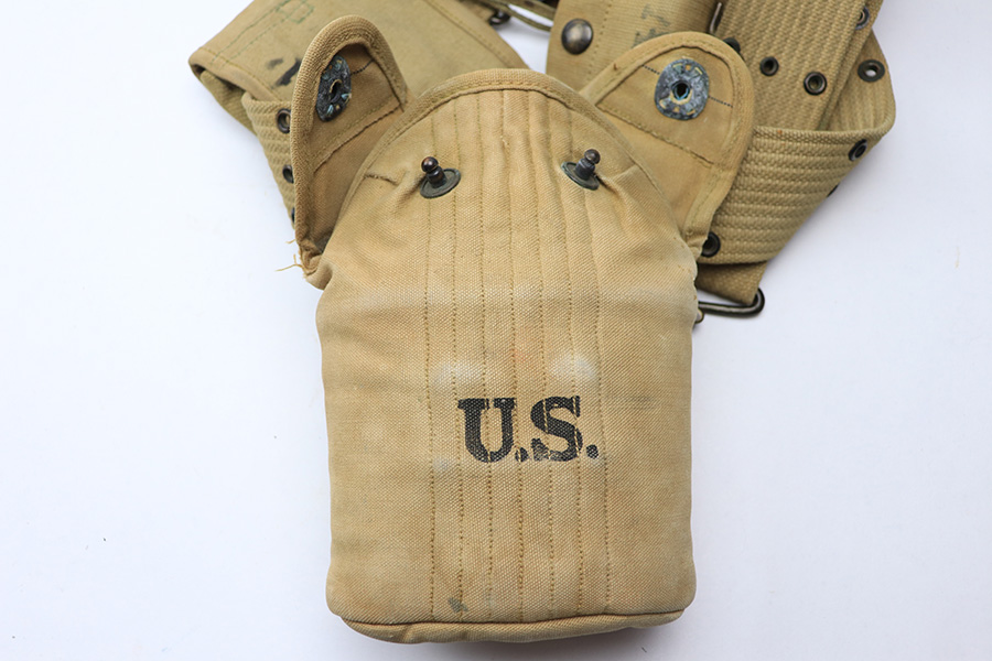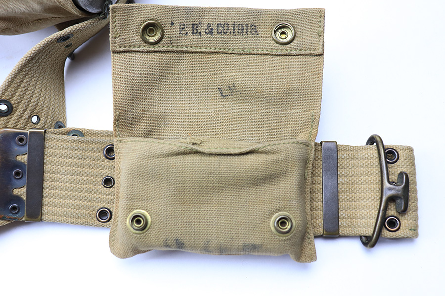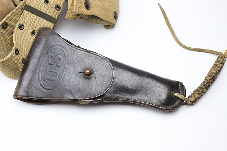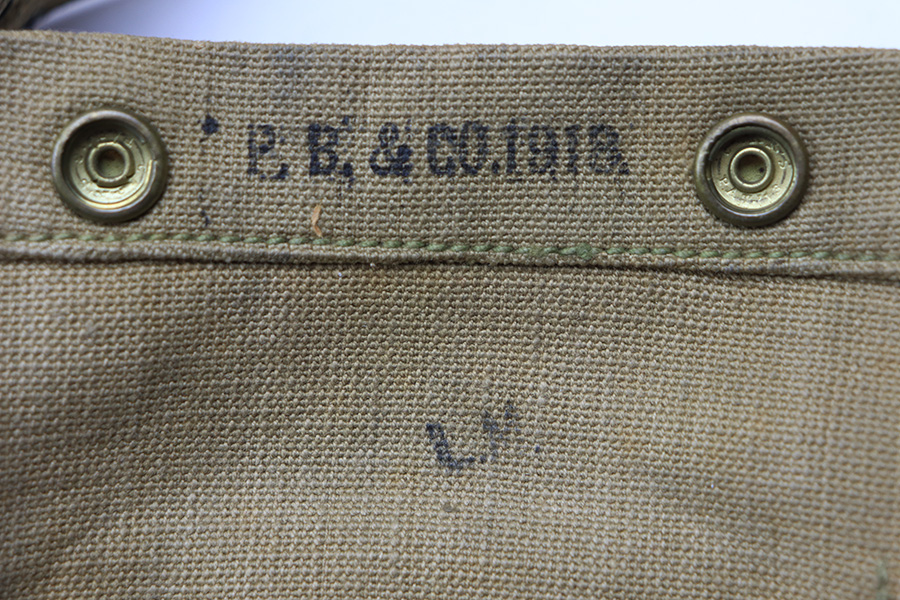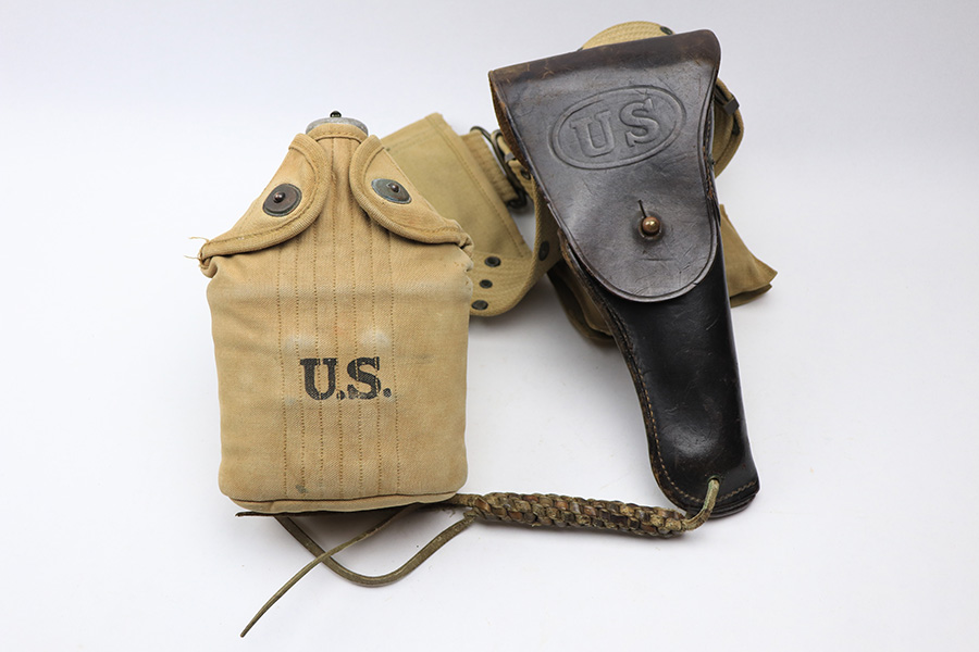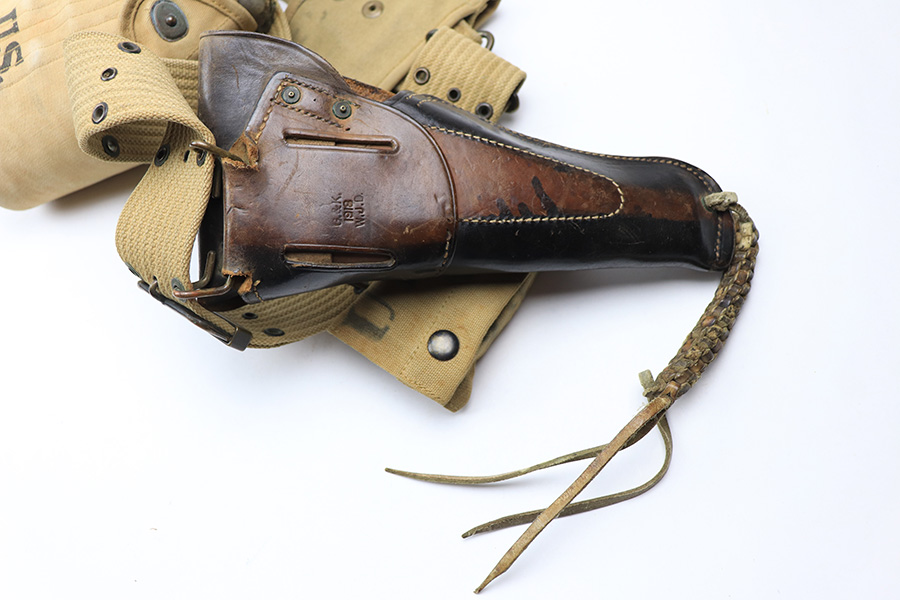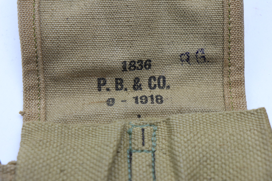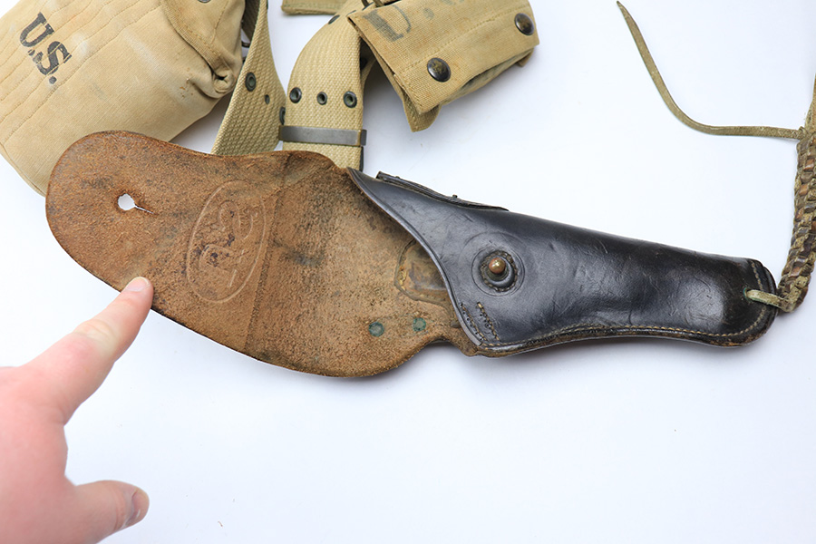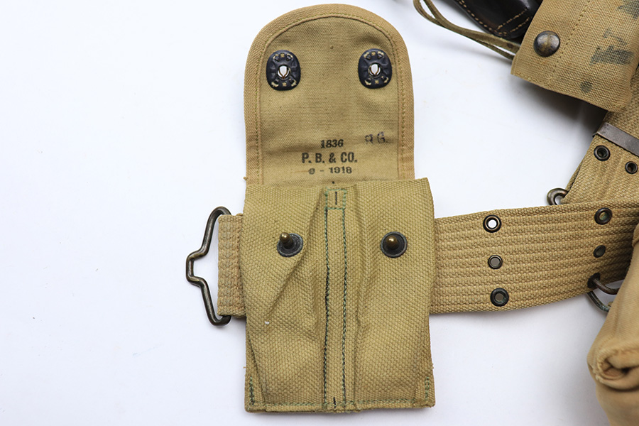 2/15/22 – This is a set of WW1 original items to compliment a US model 1911 pistol. There’s a canvas belt, canteen with pouch, unopened (though dented) first aid packet with pouch, and a 1911 magazine pouch. Each individual pouch (except the canteen) is maker stamped and dated in ink. The canteen itself is 1918 dated and in great shape. The holster is maker stamped and dated on the back leather. There’s evidence of dark / black dye on the front leather that isn’t visible on the back leather (see photos). Overall great condition.