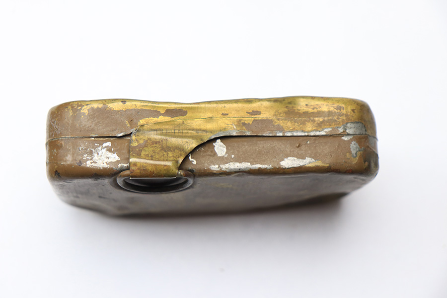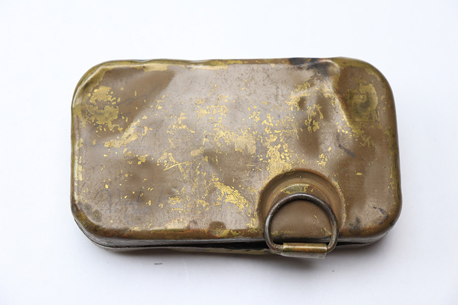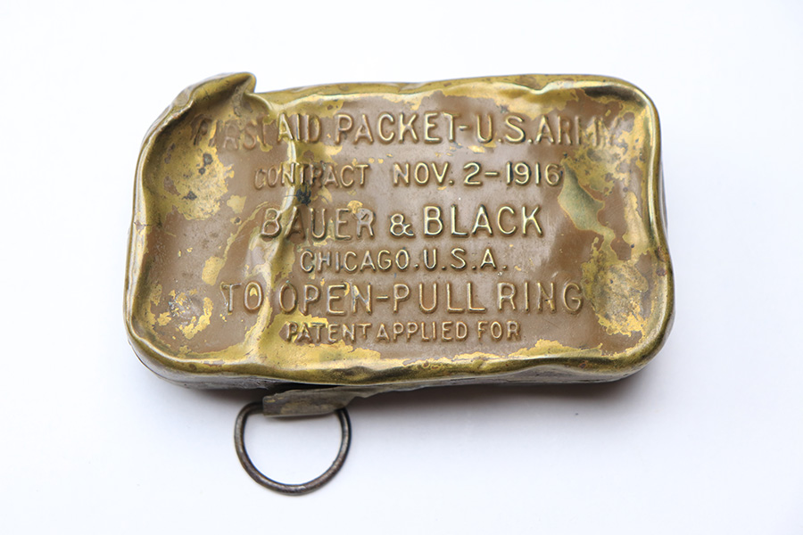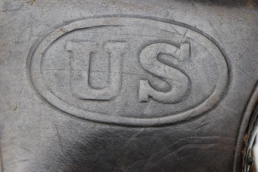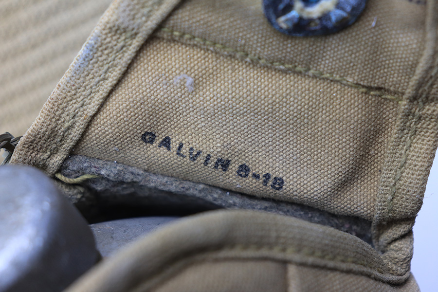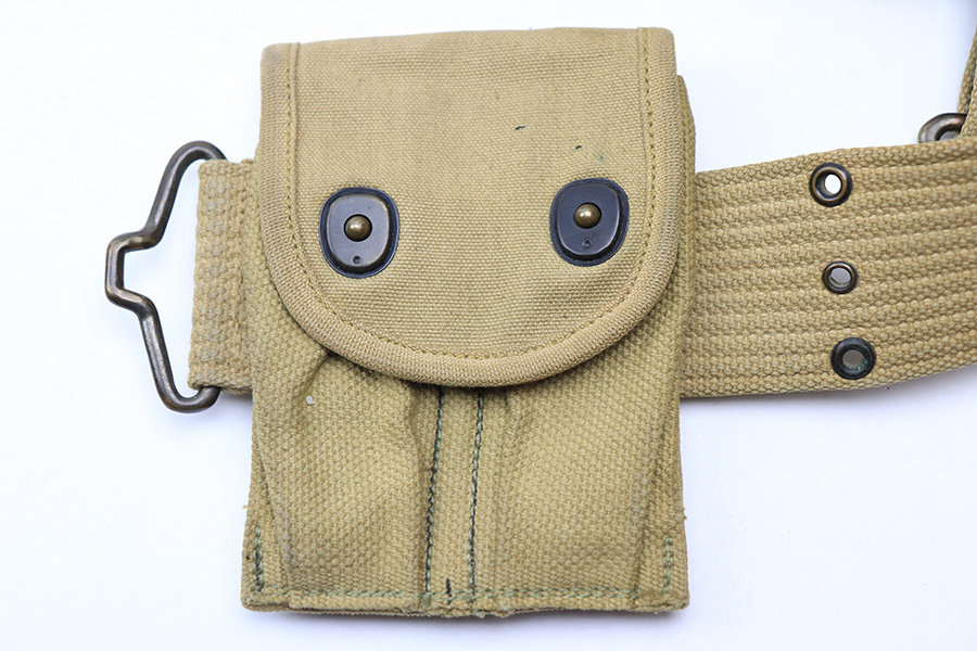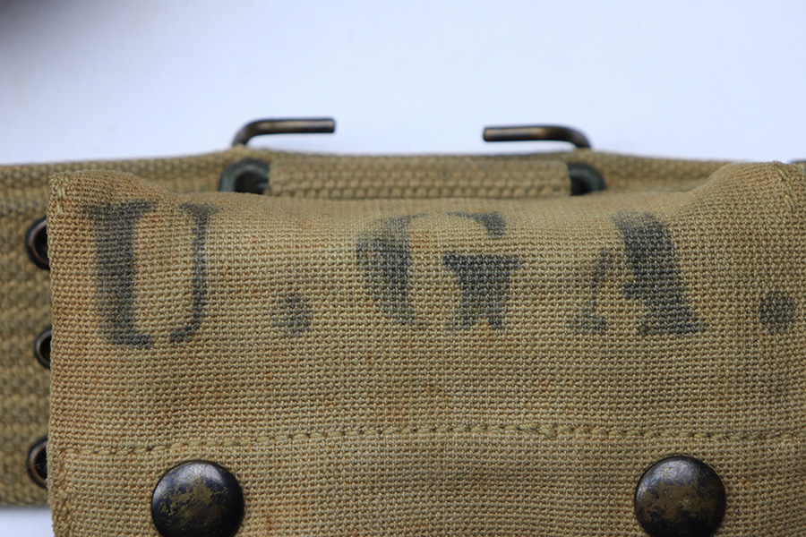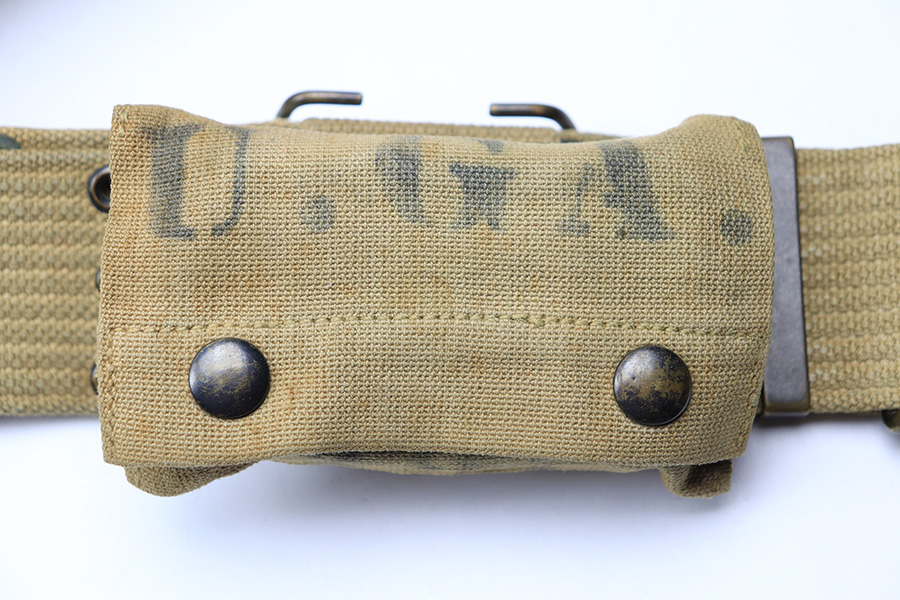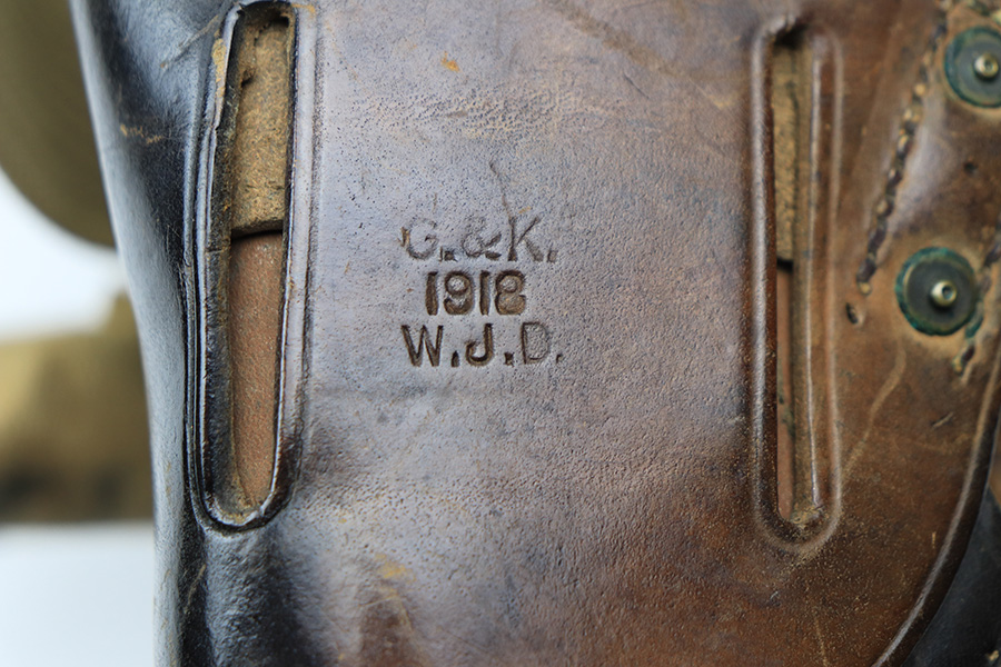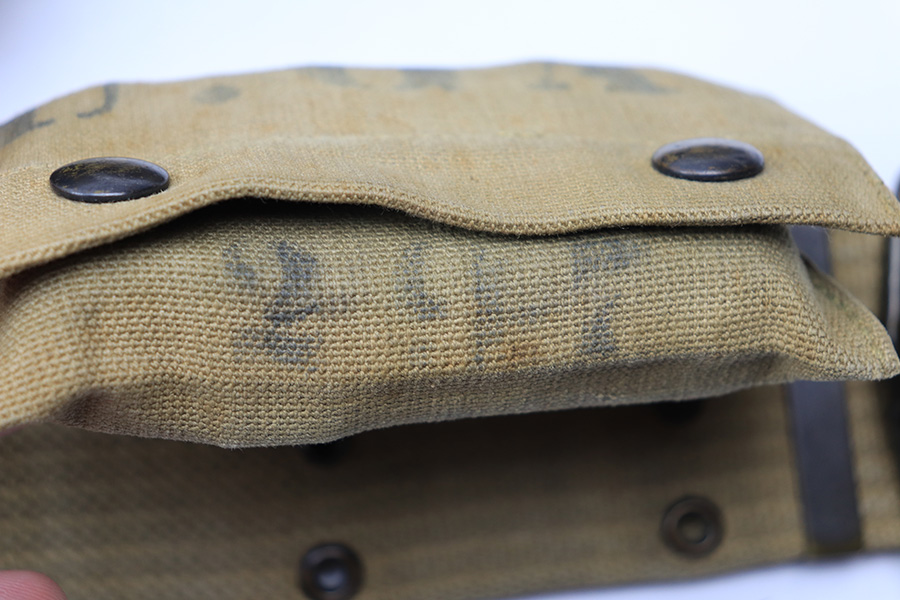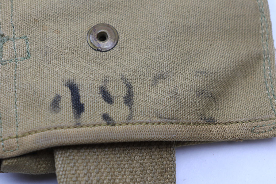 2/15/22 – This is a set of WW1 original items to compliment a US model 1911 pistol. There’s a canvas belt, canteen with pouch, unopened (though dented) first aid packet with pouch, and a 1911 magazine pouch. Each individual pouch (except the canteen) is maker stamped and dated in ink. The canteen itself is 1918 dated and in great shape. The holster is maker stamped and dated on the back leather. There’s evidence of dark / black dye on the front leather that isn’t visible on the back leather (see photos). Overall great condition.