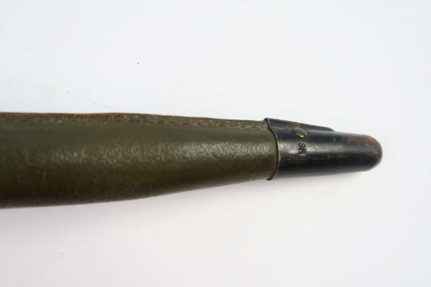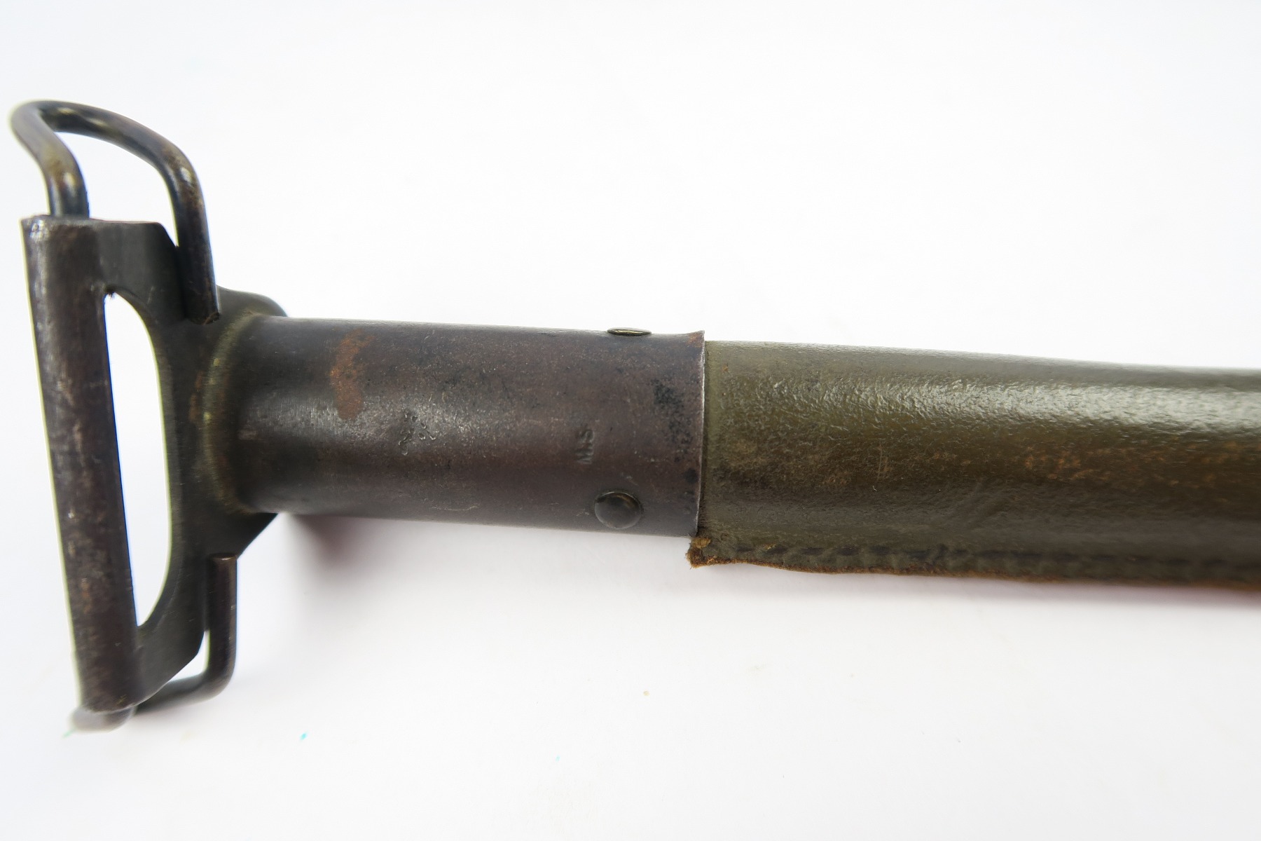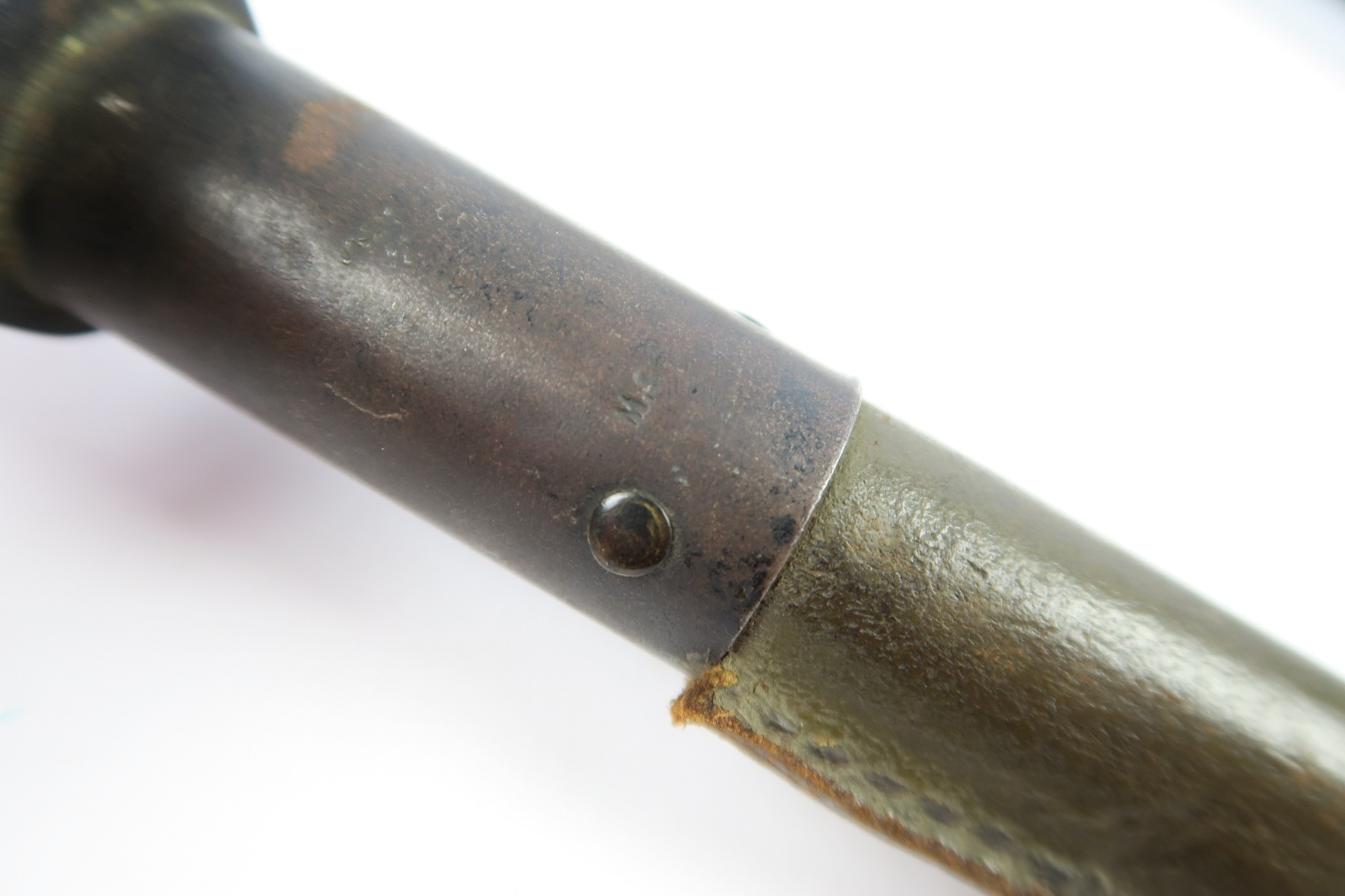 2/27/18 – This is an original WW1 US Trench knife with original scabbard. The interior of the knuckle guard is maker stamped “A.C. Co” and 1917 dated. The blued blade and handle are in excellent condition. There is some surface wear on the blade, but this is light scratching and the bluing is mostly in tact. The wood handle is excellent with no cracks or chips. The original scabbard is correctly M.S. stamped on the metal ends. The leather core is completely in tact as well. Guaranteed original.