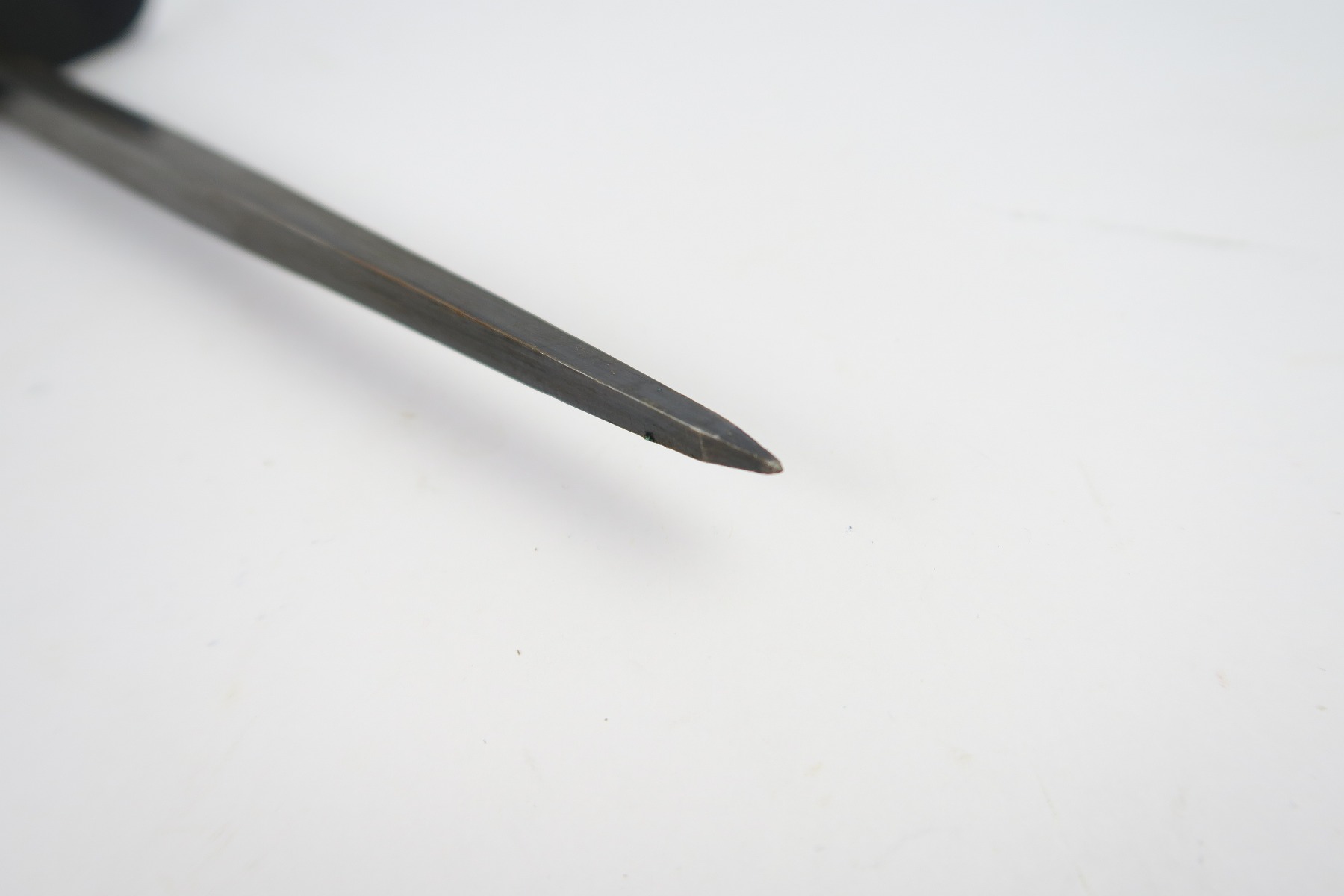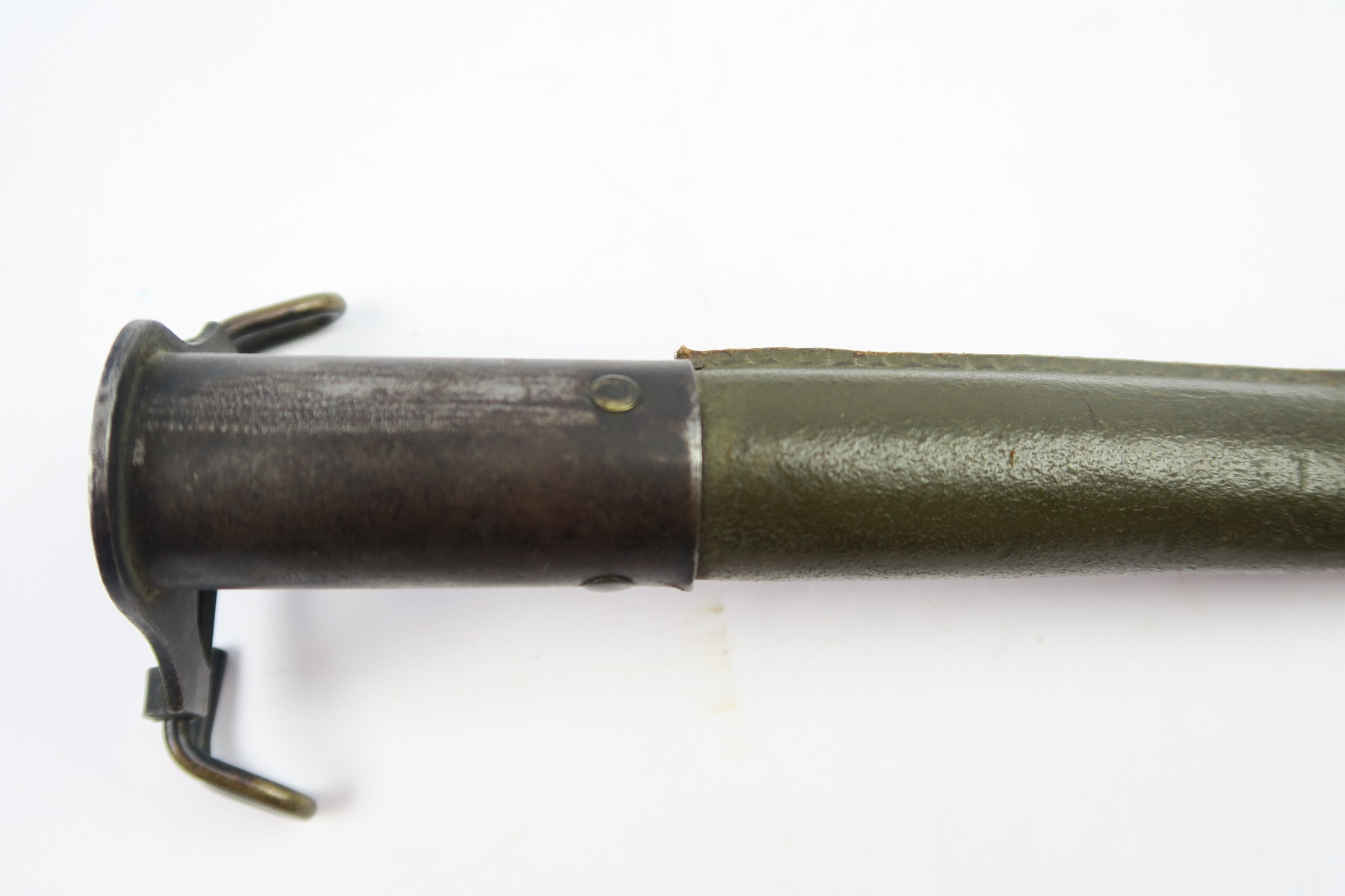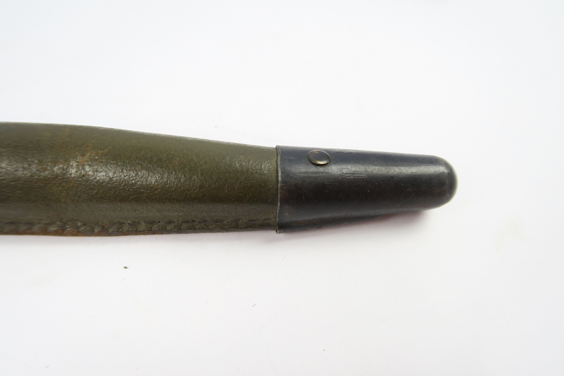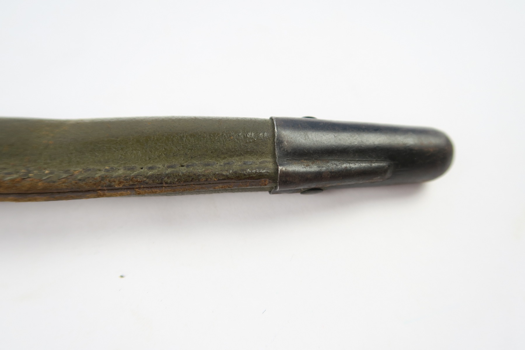 2/27/18 – This is an original WW1 US Trench knife with original scabbard. The interior of the knuckle guard is maker stamped “A.C. Co” and 1917 dated. The blued blade and handle are in excellent condition. There is some surface wear on the blade, but this is light scratching and the bluing is mostly in tact. The wood handle is excellent with no cracks or chips. The original scabbard is correctly M.S. stamped on the metal ends. The leather core is completely in tact as well. Guaranteed original.