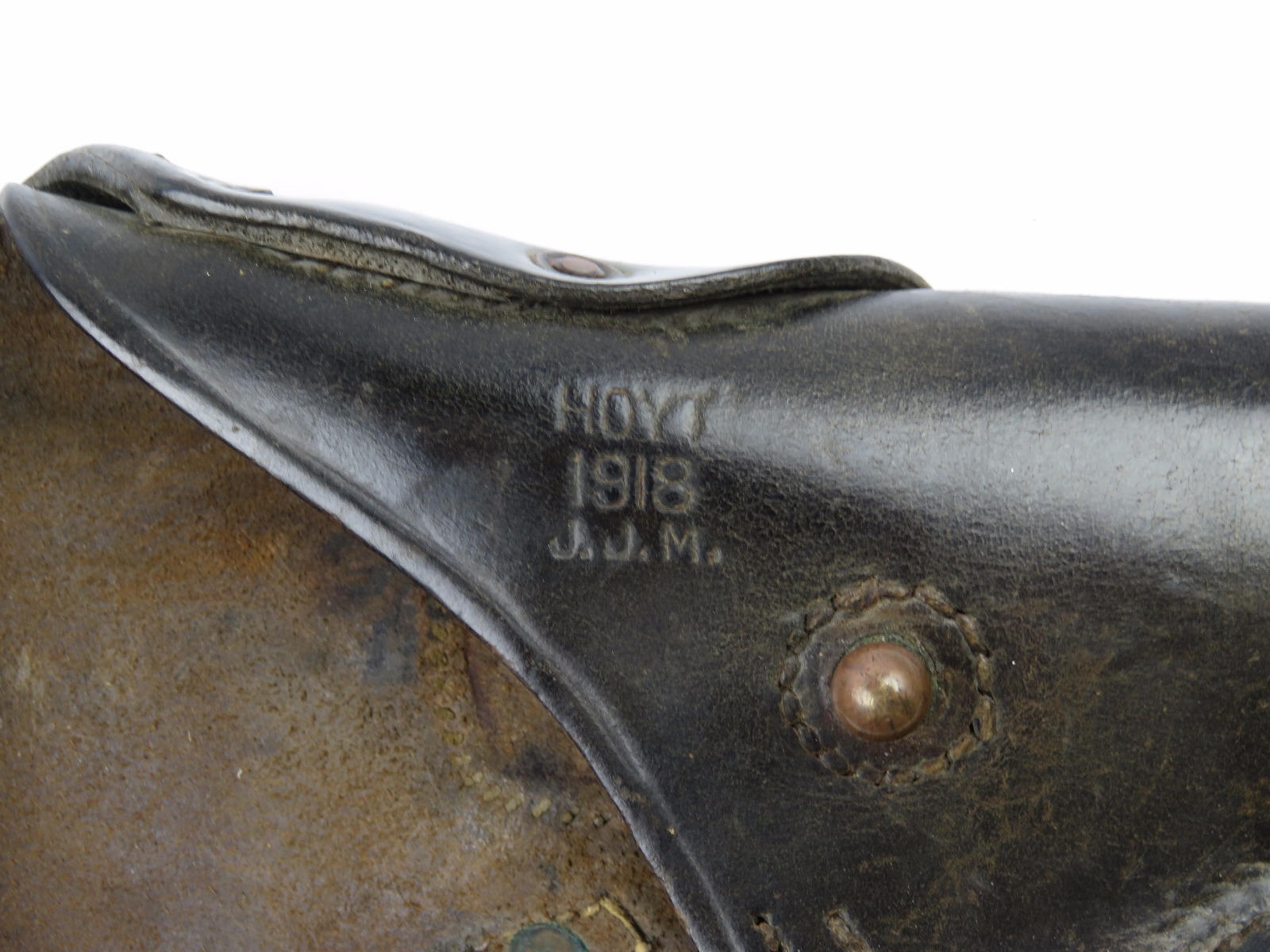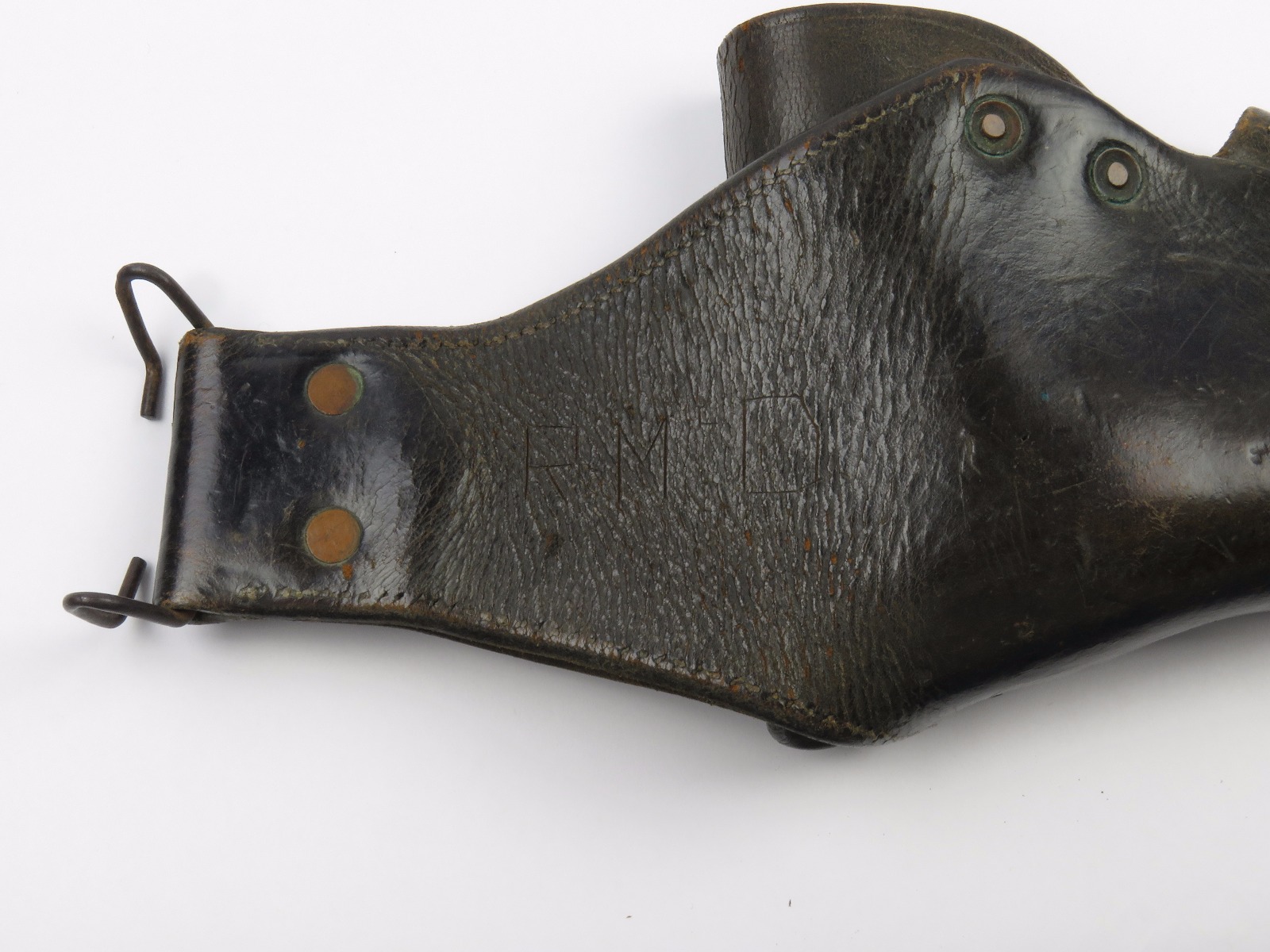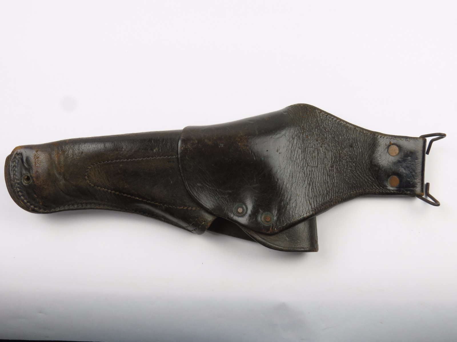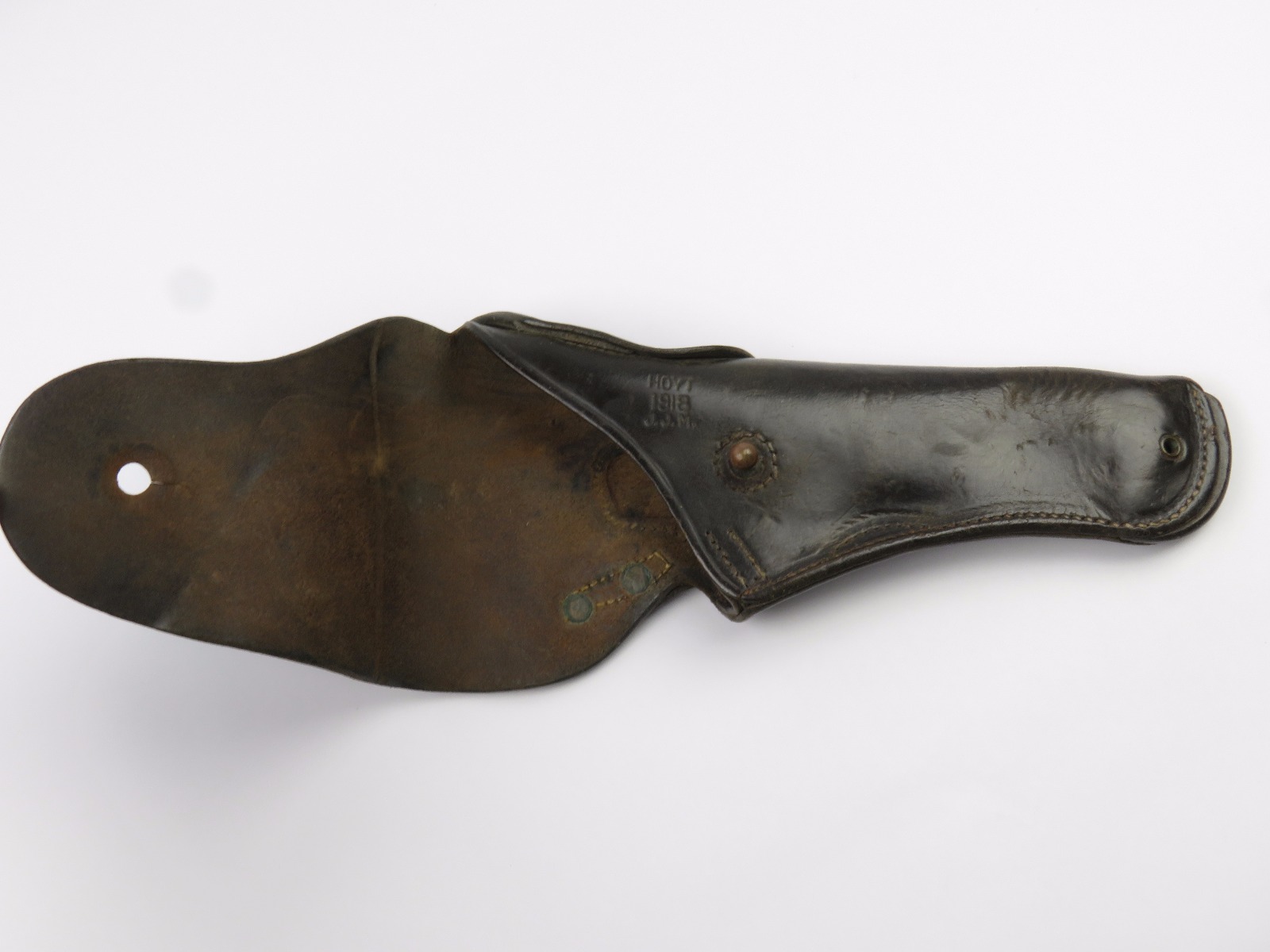 11/3/17 – This is an original WW1 production model 1911 calvalry style holster. The longer attachment neck or tongue on this holster was for attaching to a saddle for calvalry troops. These holsters are more desirable than standard 1911 holsters. The tongue has some surface wear and wrinkling on the leather, as well as stitching missing on either side, but overall is in tact and completely original. The riveted attachments are all original with no notable issues. The holster has nice, normal aging and use wear on the leather, while staying completely in tact. The back leather has the initials “RMD” scratched into the leather. The stitching on the body of this holster is completely in tact. On the main body of leather is a maker stamp and 1918 date stamp. Guaranteed original and authentic.