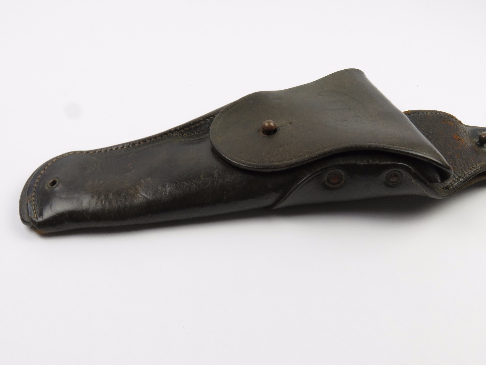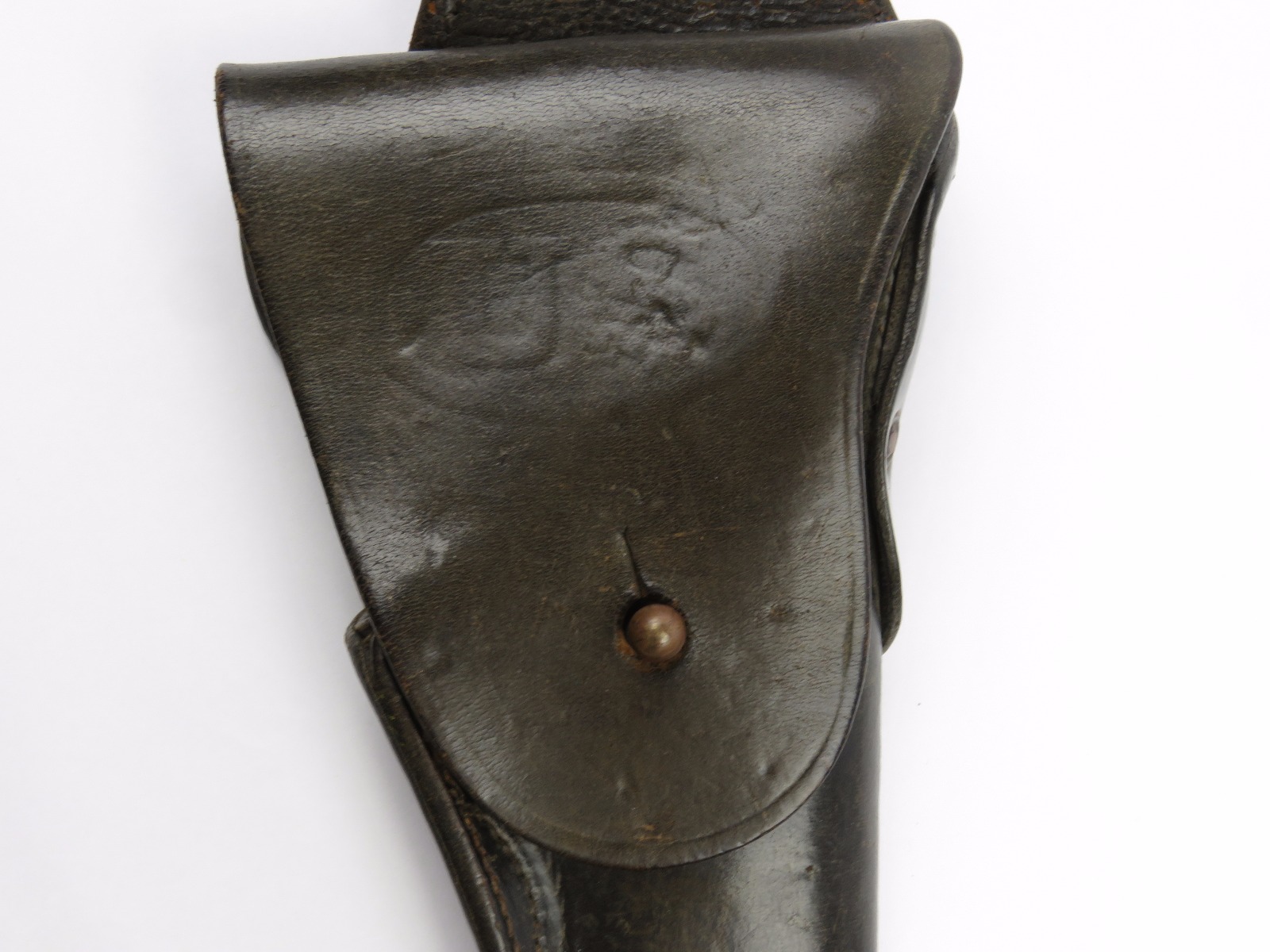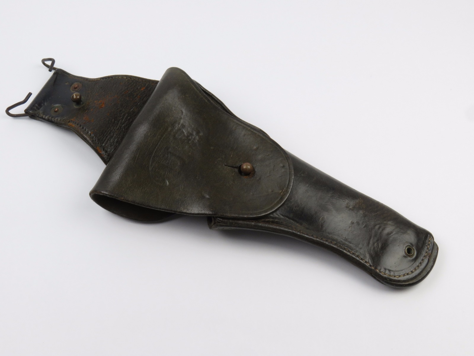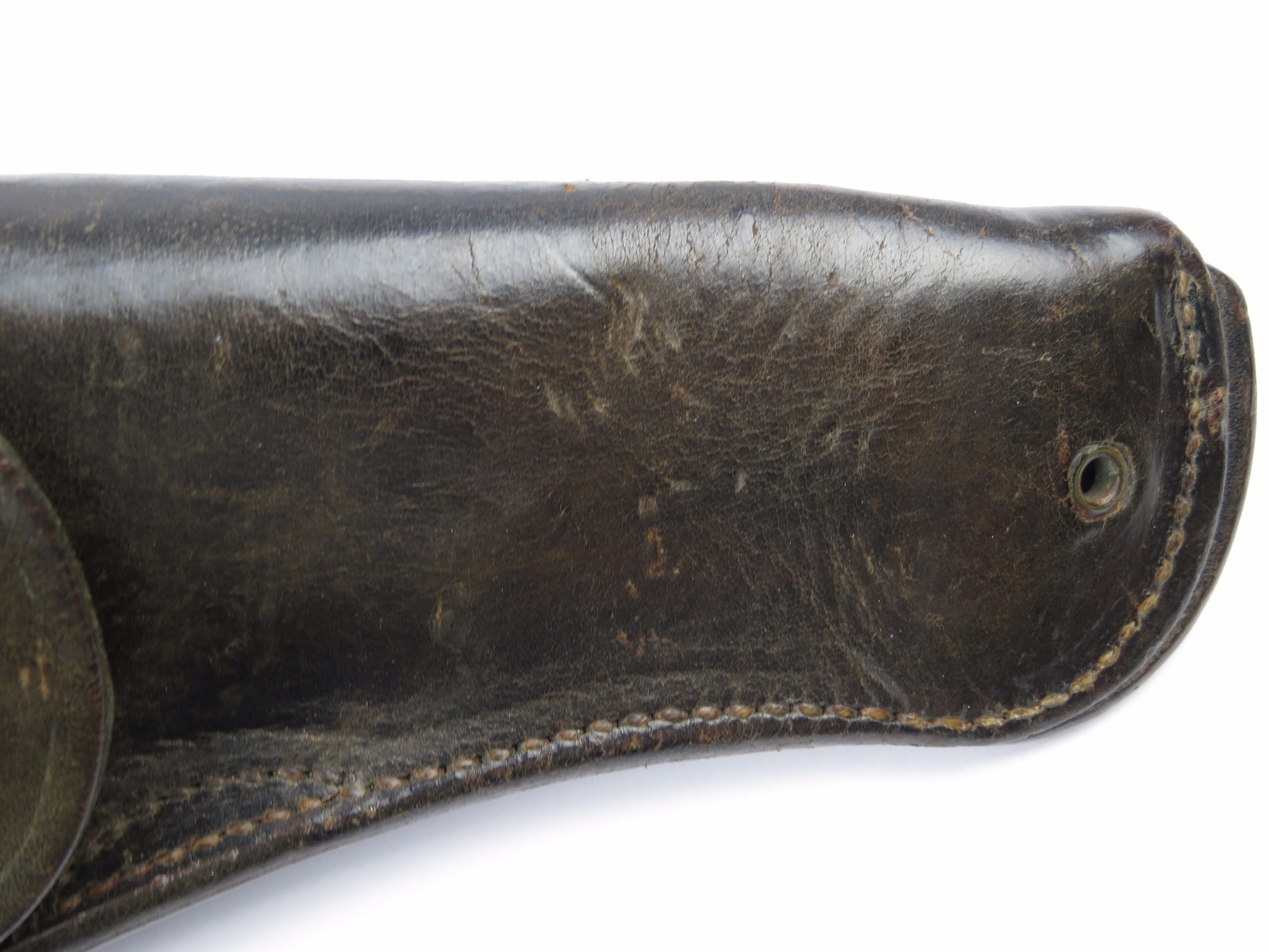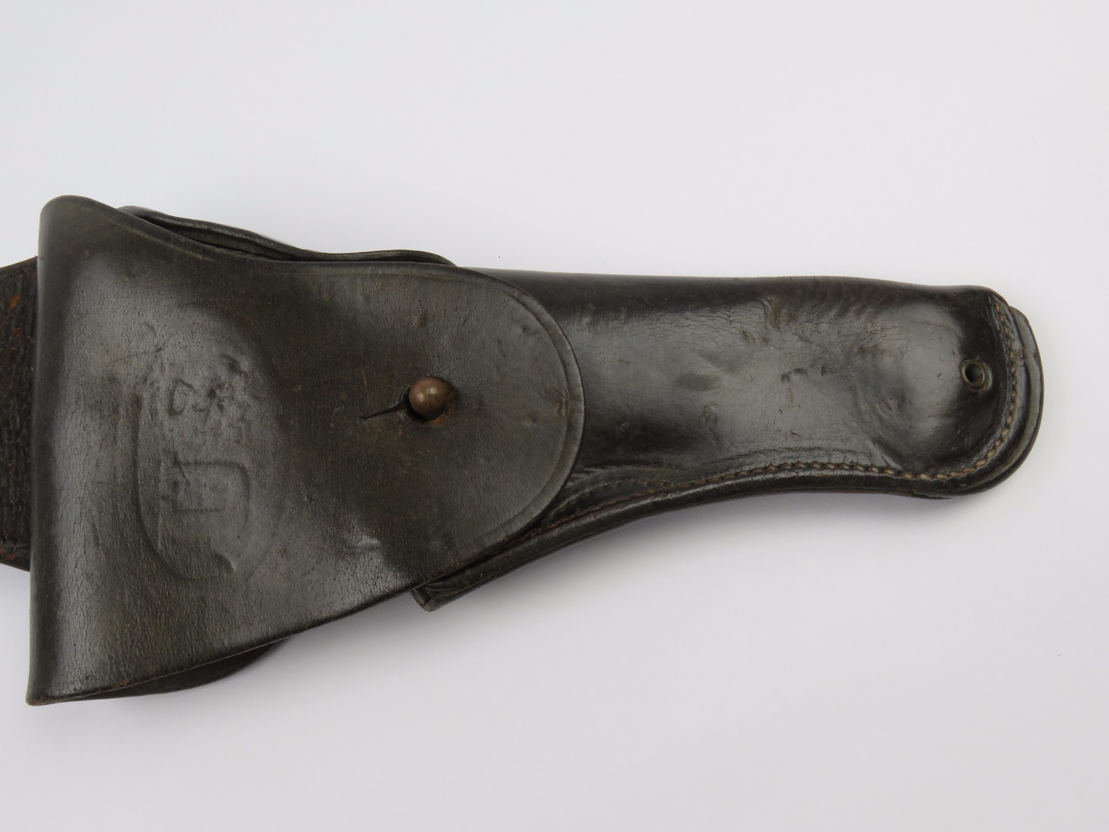 11/3/17 – This is an original WW1 production model 1911 calvalry style holster. The longer attachment neck or tongue on this holster was for attaching to a saddle for calvalry troops. These holsters are more desirable than standard 1911 holsters. The tongue has some surface wear and wrinkling on the leather, as well as stitching missing on either side, but overall is in tact and completely original. The riveted attachments are all original with no notable issues. The holster has nice, normal aging and use wear on the leather, while staying completely in tact. The back leather has the initials “RMD” scratched into the leather. The stitching on the body of this holster is completely in tact. On the main body of leather is a maker stamp and 1918 date stamp. Guaranteed original and authentic.
