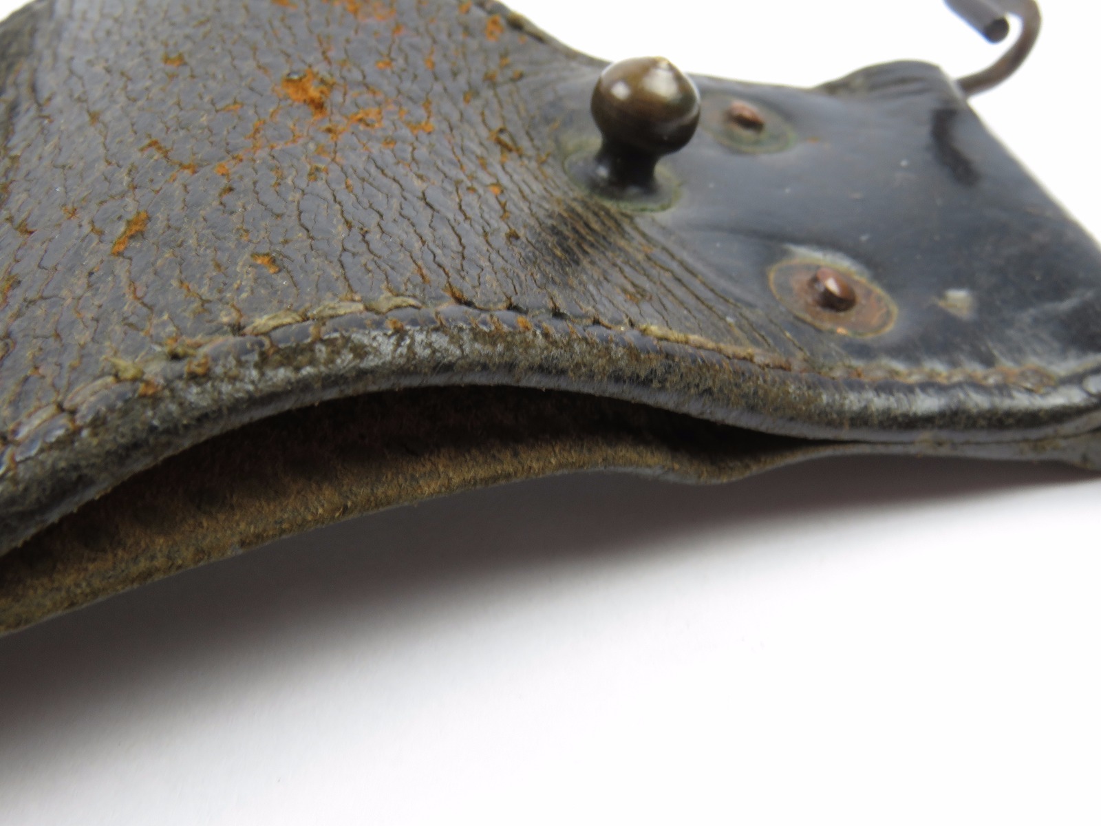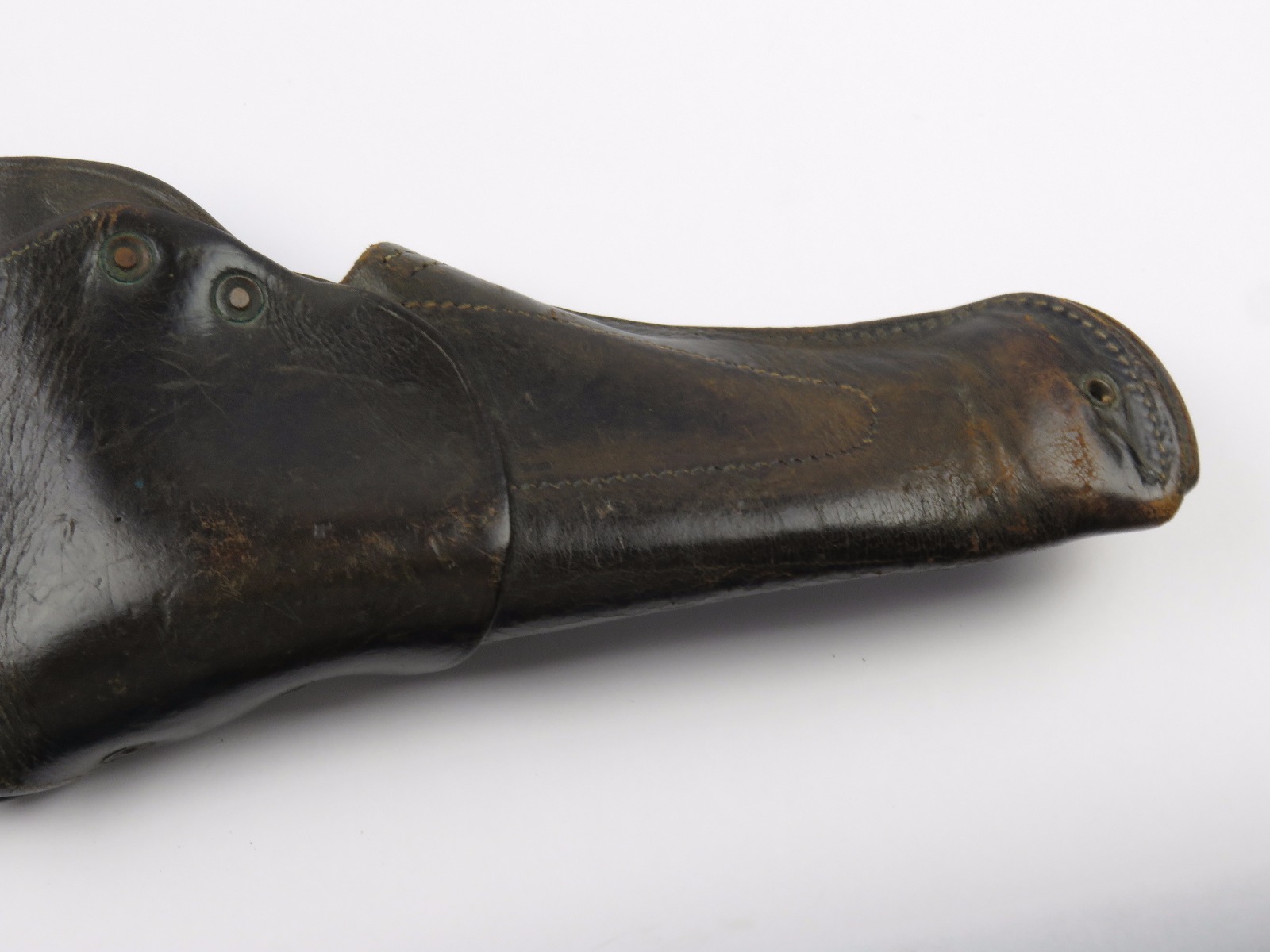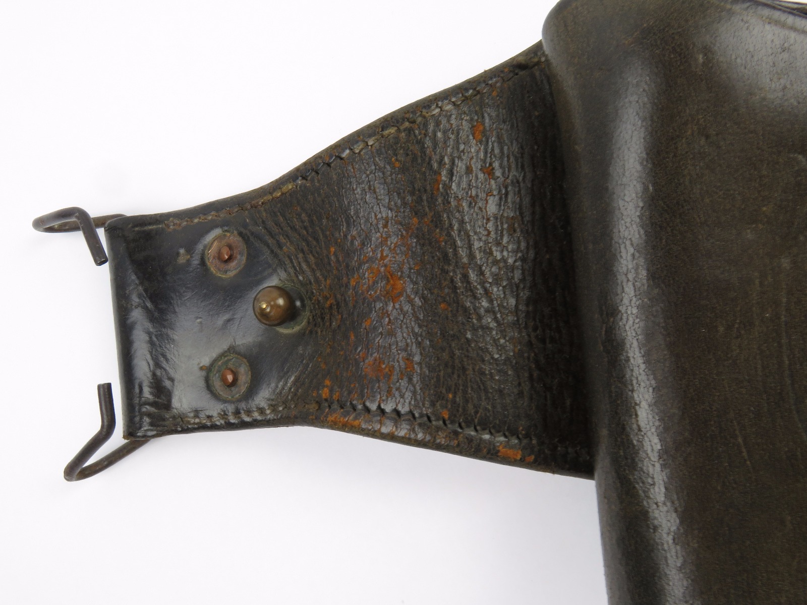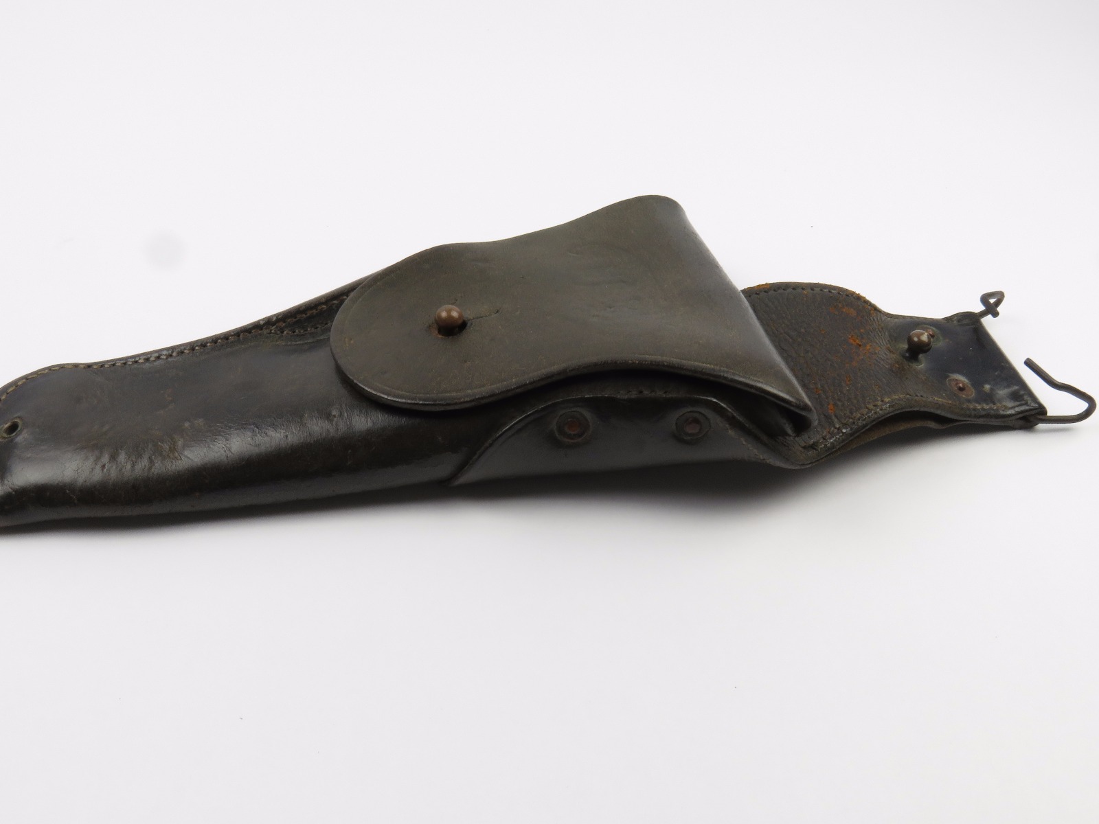 11/3/17 – This is an original WW1 production model 1911 calvalry style holster. The longer attachment neck or tongue on this holster was for attaching to a saddle for calvalry troops. These holsters are more desirable than standard 1911 holsters. The tongue has some surface wear and wrinkling on the leather, as well as stitching missing on either side, but overall is in tact and completely original. The riveted attachments are all original with no notable issues. The holster has nice, normal aging and use wear on the leather, while staying completely in tact. The back leather has the initials “RMD” scratched into the leather. The stitching on the body of this holster is completely in tact. On the main body of leather is a maker stamp and 1918 date stamp. Guaranteed original and authentic.