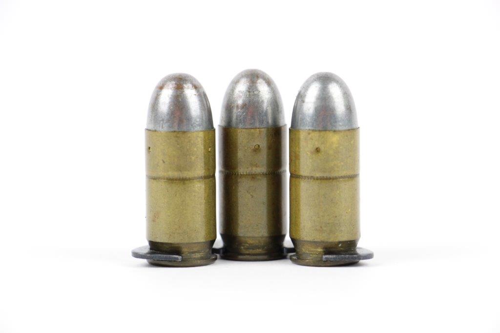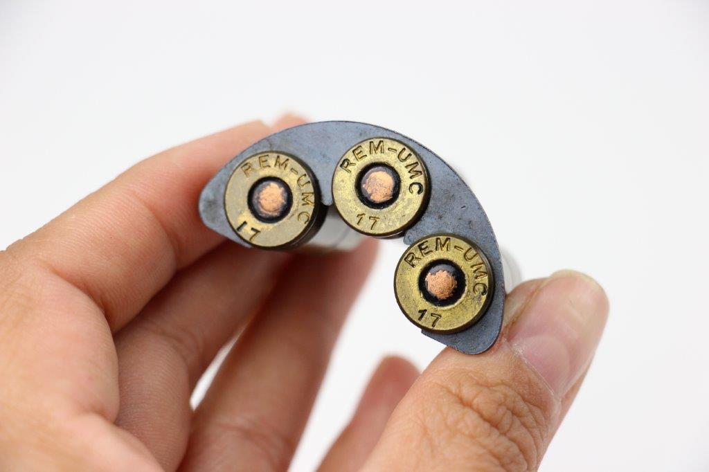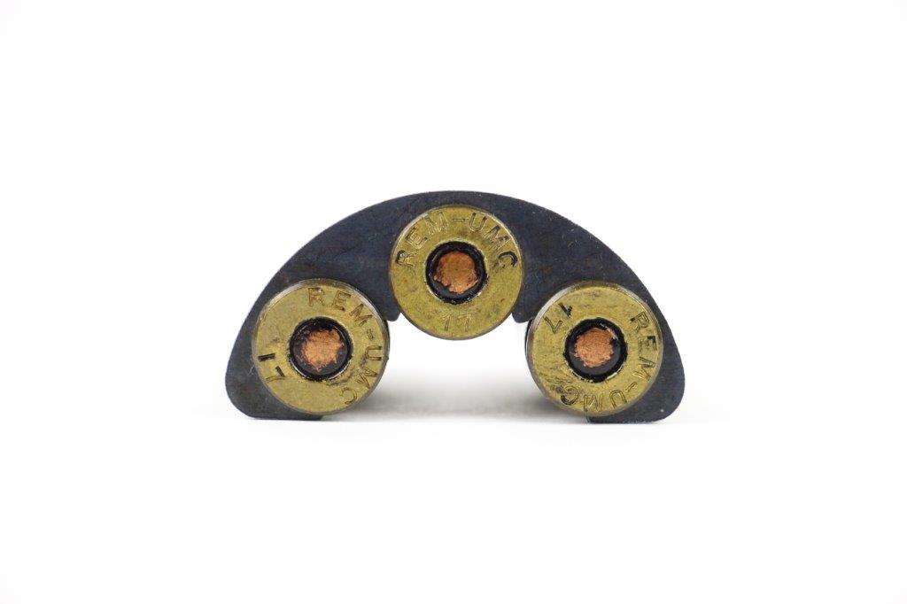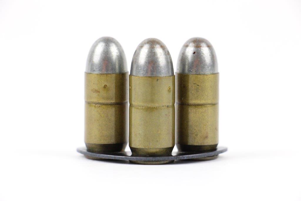 8/20/24 – This is an original WW1 half-moon clip with 3 rounds of WW1 original .45 ACP ammunition. Perfect for pairing with a M1917 revolver by either S&W or Colt. Great overall condition with original finish still present on the half-moon clip.