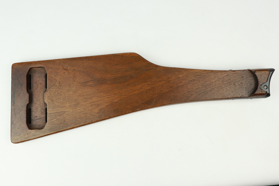 11/13/18 – This is an original WW1 production Artillery Luger stock. The stock is all original and serial numbered on the metal “7334 i”. The stock has some discoloration from previous leather that was attached to the wood – the leather is no longer included. Fits onto the back lug of a Luger pistol – intended for artillery pistols in WW1. Guaranteed original and authentic.