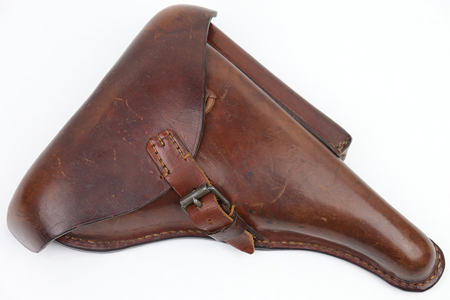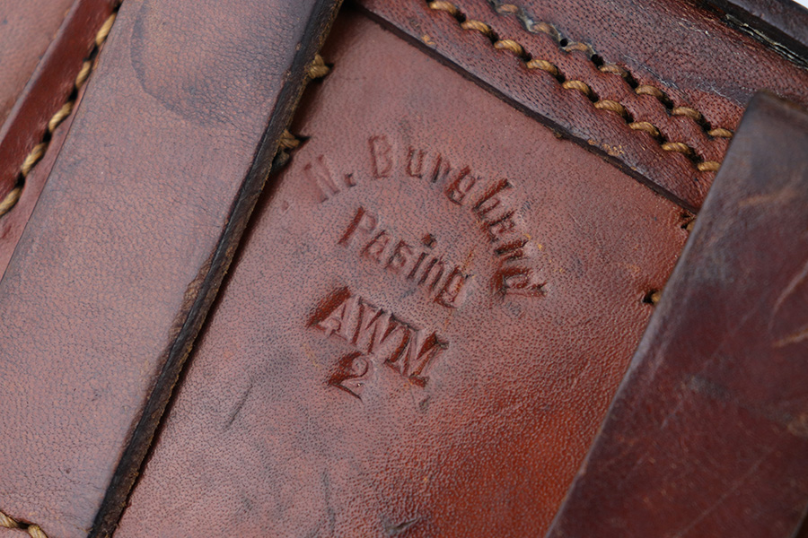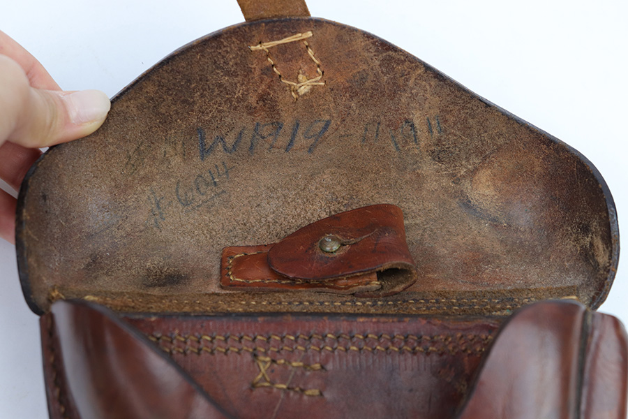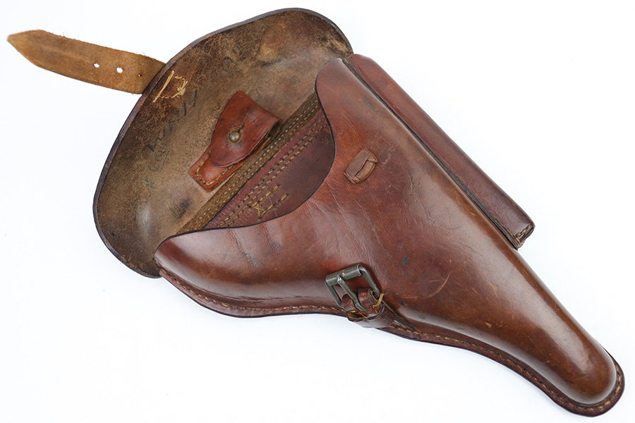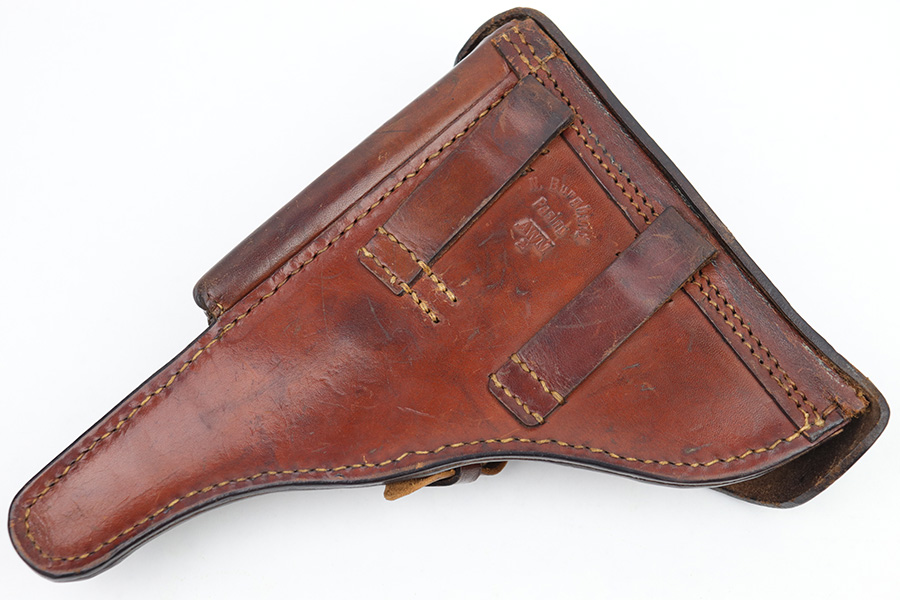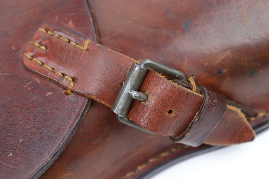 3/10/23 – This is an excellent condition, early production WW1 Luger holster. The holster is maker stamped and dated on the back leather with strong, crisp markings. The leather is firm with light pliability and truly excellent condition for a WW1 example. There’s some mild surface scuffing and light discoloration but no major issues. The stitching is all original and intact throughout.