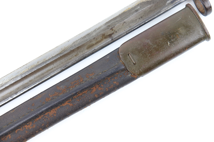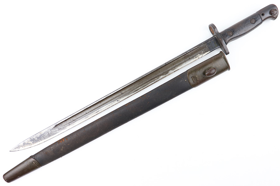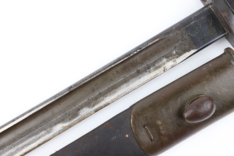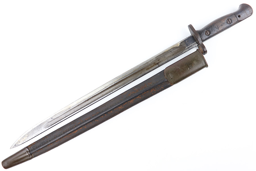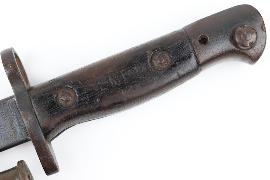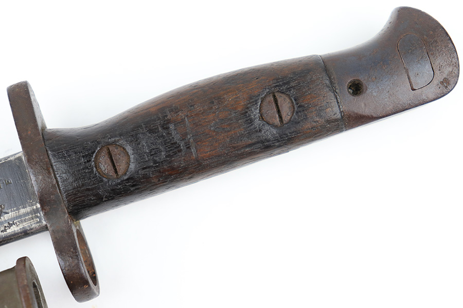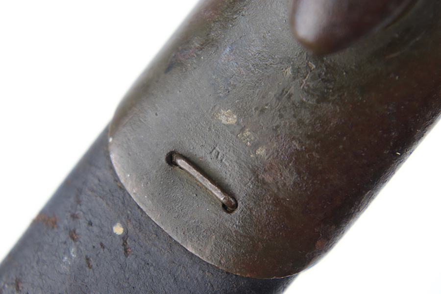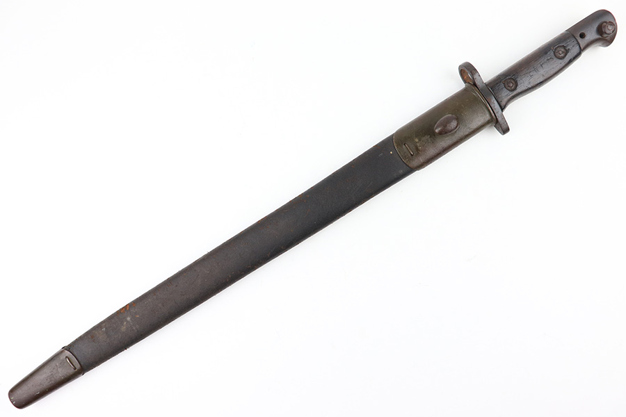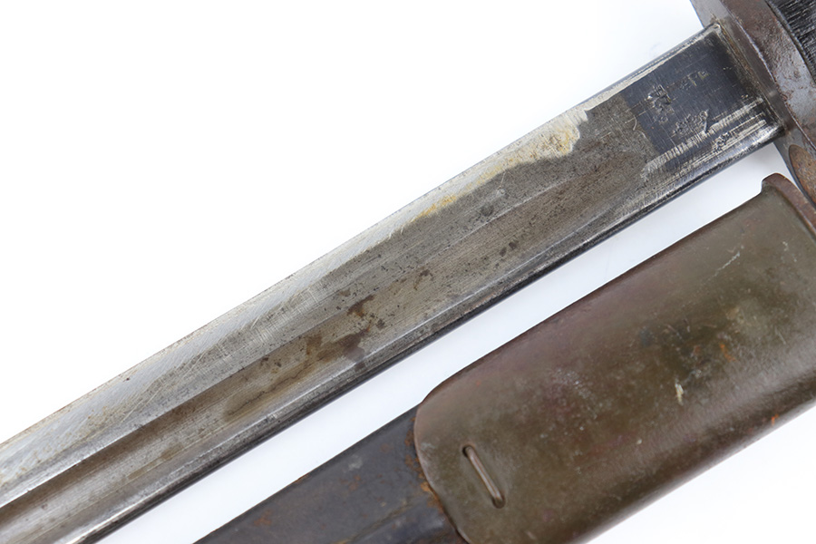 8/4/23 – This is an early WW1 era British Enfield rifle bayonet. The bayonet comes with an original scabbard as shown. The blade has surface oxidation, discoloration, and light surface scratches throughout. The edge has been sharpened and shows sings of use. The ricasso is stamped with multiple British proofs, a British crown, and a faint 1907 manufacture date. The wood grips are original and in good condition with light numbers and initials scratched into the sides. The pommel has light surface patina and mild rust throughout. The scabbard has typical signs of aging and use but no major issues.