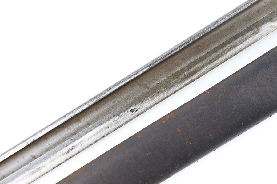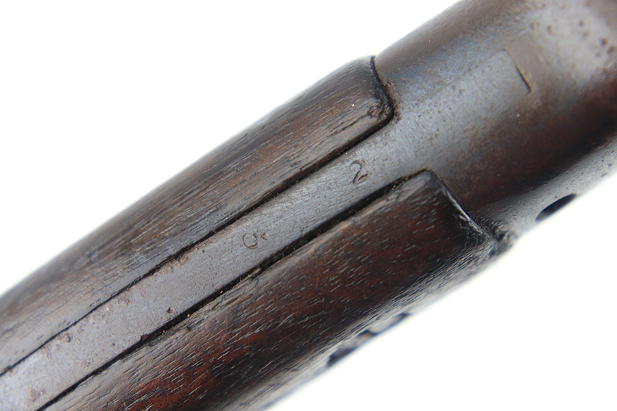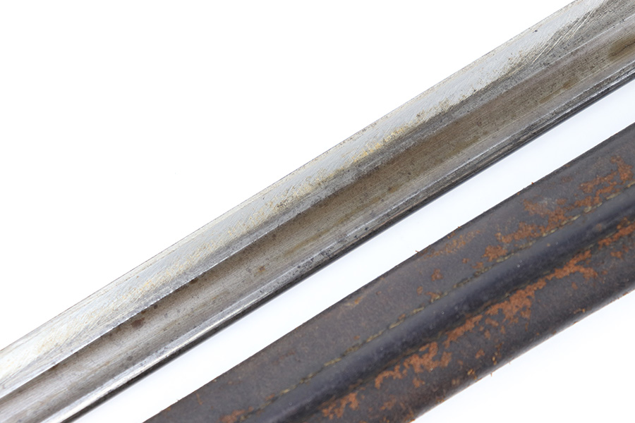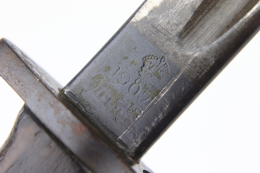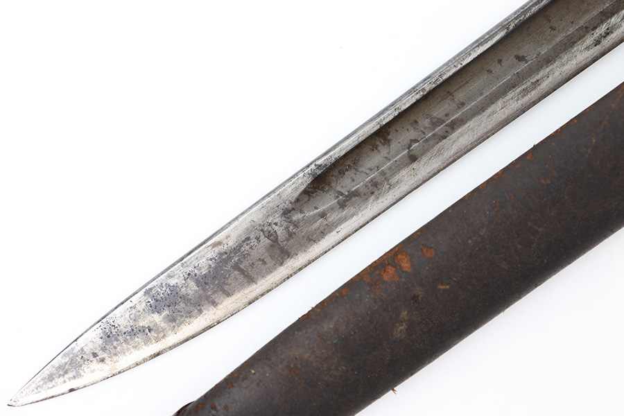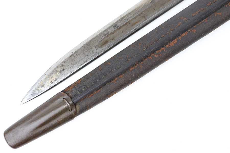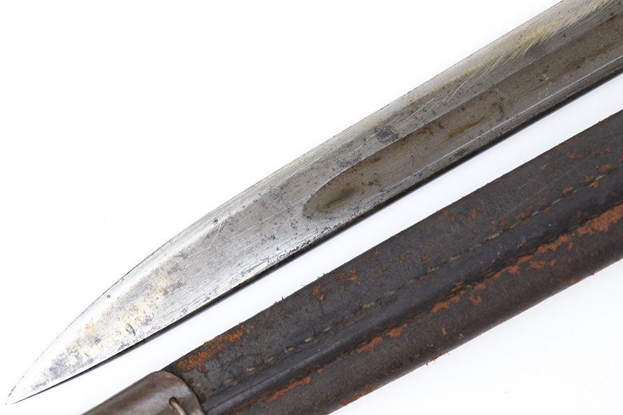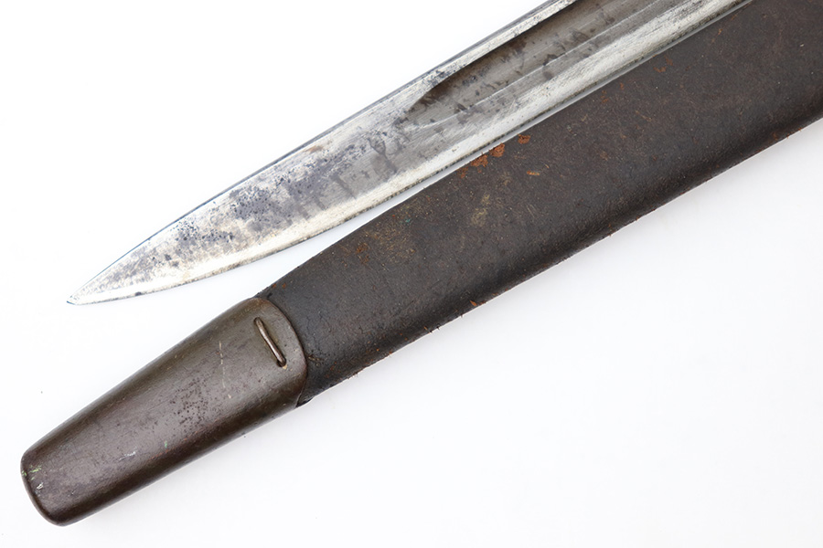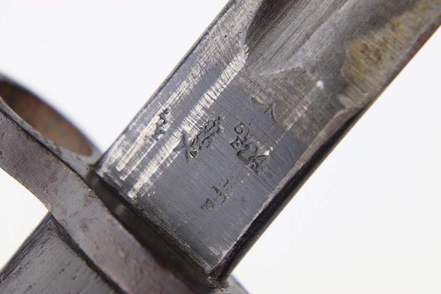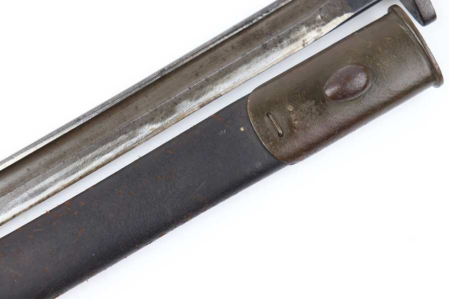 8/4/23 – This is an early WW1 era British Enfield rifle bayonet. The bayonet comes with an original scabbard as shown. The blade has surface oxidation, discoloration, and light surface scratches throughout. The edge has been sharpened and shows sings of use. The ricasso is stamped with multiple British proofs, a British crown, and a faint 1907 manufacture date. The wood grips are original and in good condition with light numbers and initials scratched into the sides. The pommel has light surface patina and mild rust throughout. The scabbard has typical signs of aging and use but no major issues.