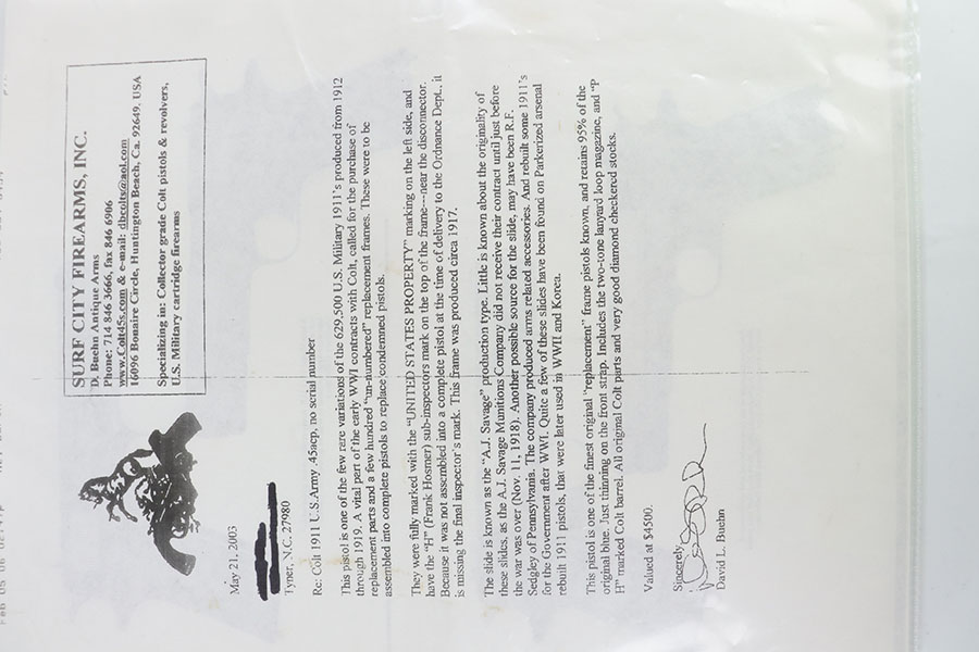 7/3/20 – This is a rare and interesting Colt 1911 from World War I that was never inspected or serialized. Clawson’s book talks briefly about this variation, but the Colt frame dates to about 1917. The slide is an ‘A.J. Savage’ production with the Colt patent and flaming bomb logo. The original finish is very nice with minor edge wear on the slide, and some browning/thinning of the straps. ‘H’ inspector mark on top of frame with minty Colt barrel that is ‘P H’ marked in the ejection port. Has an ‘R’ marked magazine from World War II. Excellent wood grips with just a bit of handling wear.