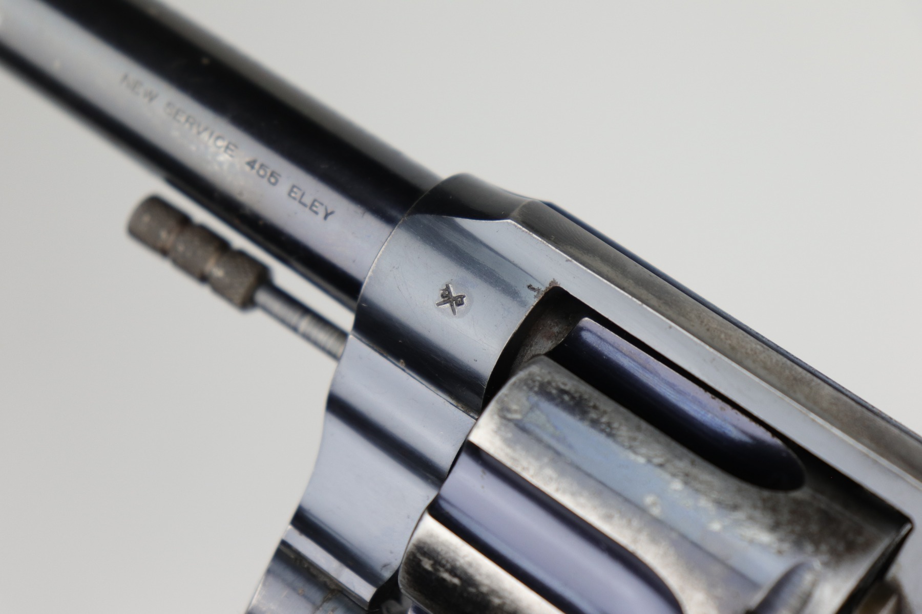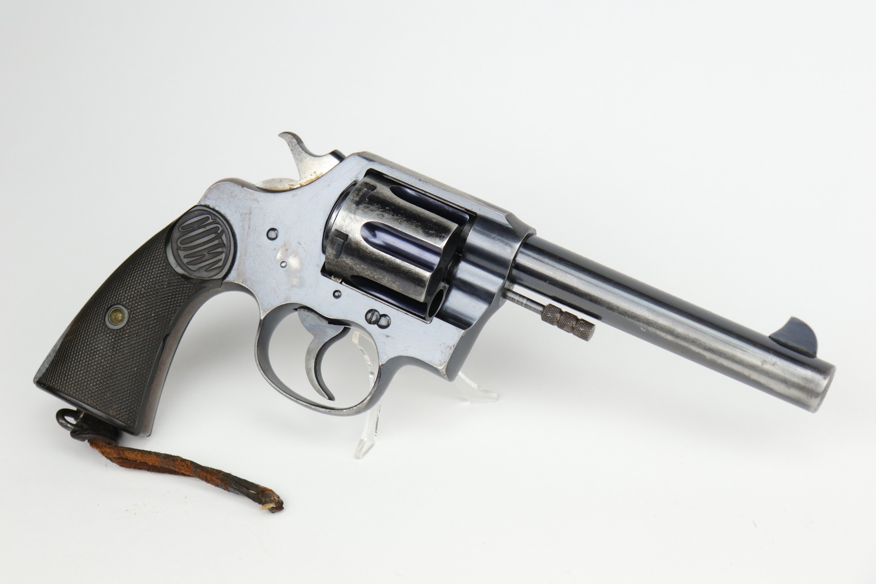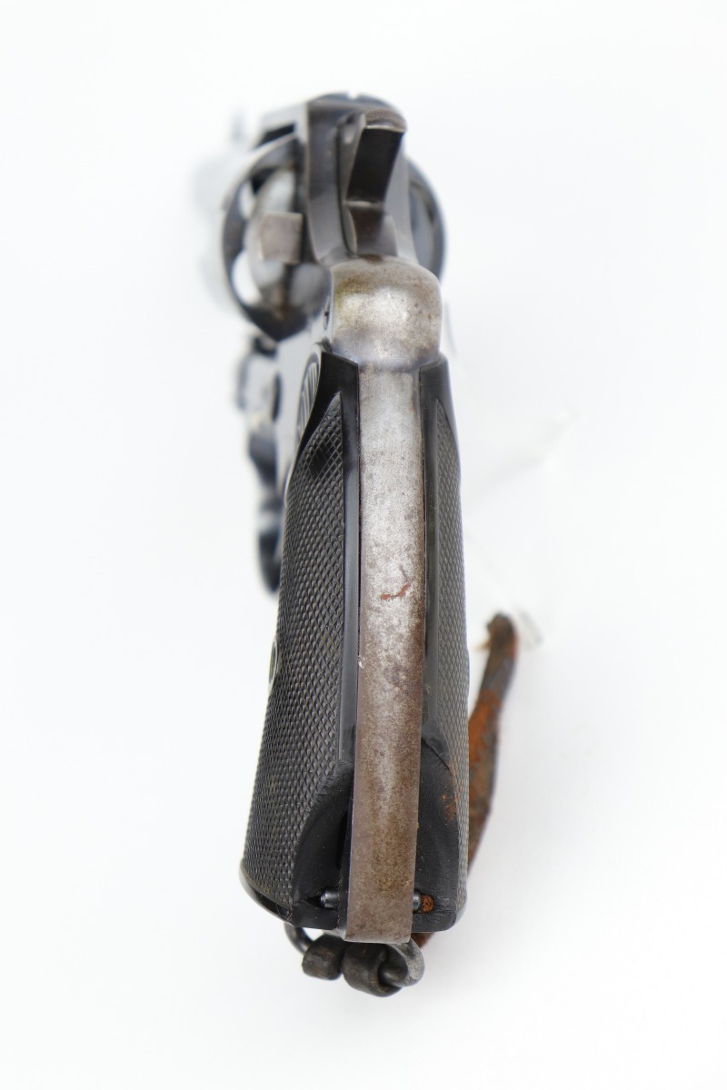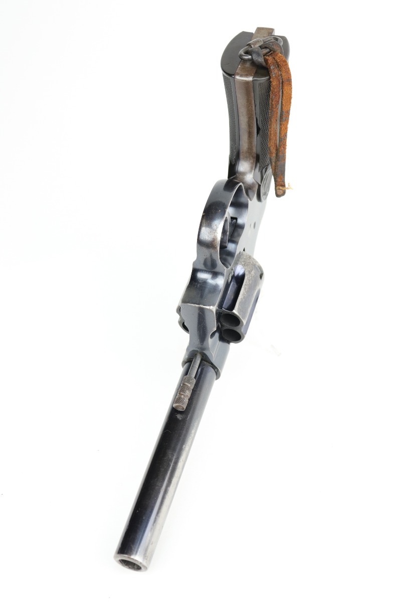 10/9/20 – This is a nice example of a WW1 Colt New Service revolver, manufactured in 1916. This gun was part of a British contract, evidenced by the British proofs and the fact that it is chambered in the British .455 Eley cartridge. The gun functions well and the action is smooth. It has retained roughly 60% of its original high-polish finish. There are areas of significant wear along the length of both sides of the barrel, on the cylinder, and the straps. There are other smaller areas of wear on the sides of the frame and underside of the trigger guard. There is minor pin-pricking around the muzzle and heavy spotty oxidation on the straps. The grips are original, but both are chipped around the butt. It still has the lanyard loop and lanyard. The original “crossed-pennants” marking on the cylinder is in tact, therefore it has not been shaved. The bore is excellent – shiny with strong rifling.