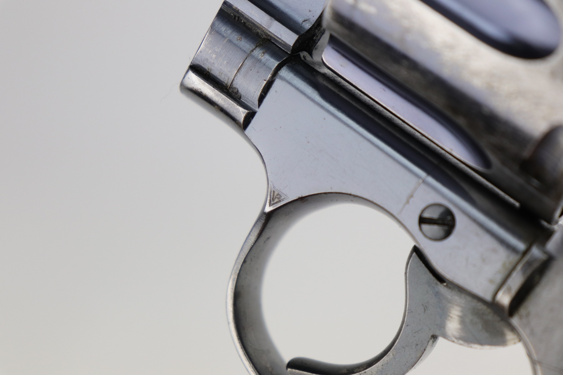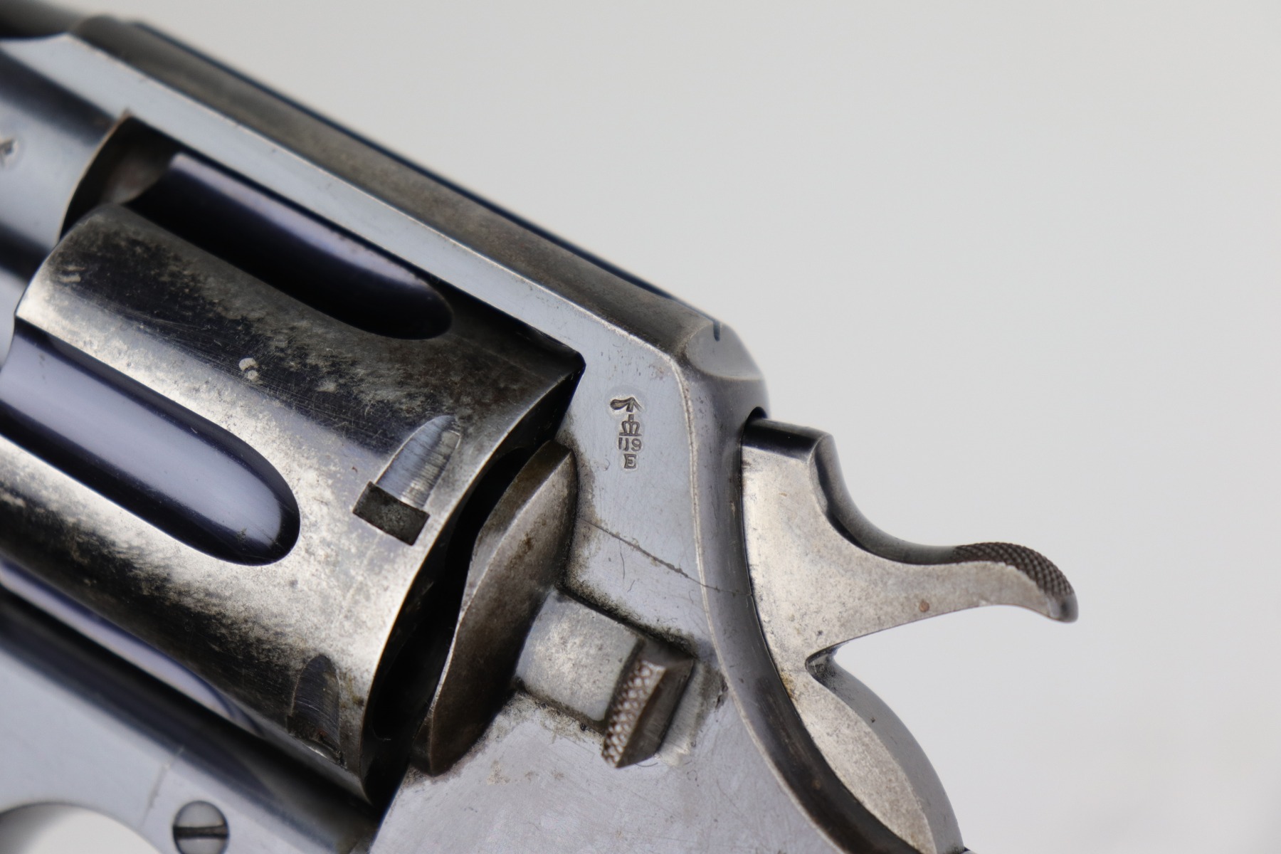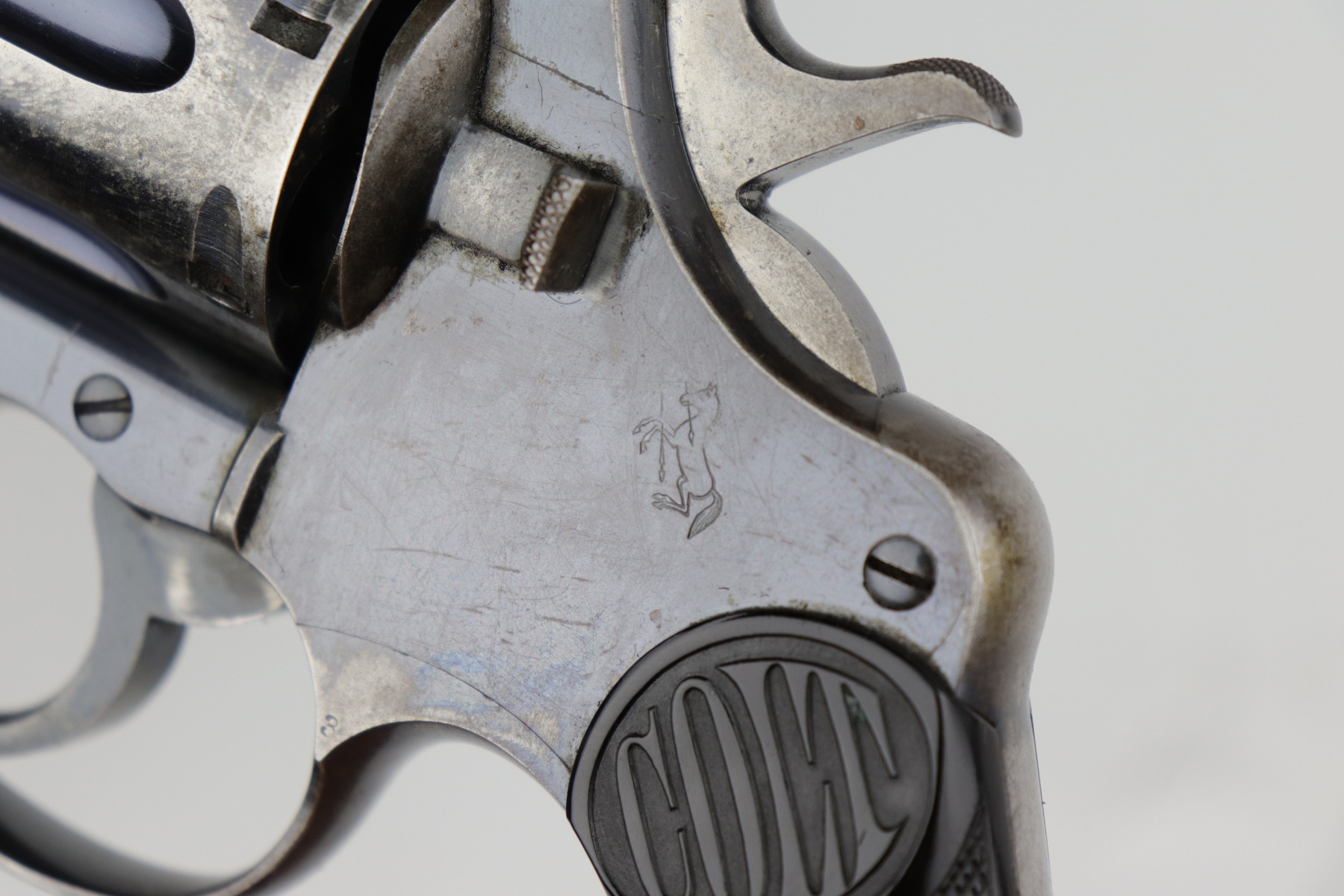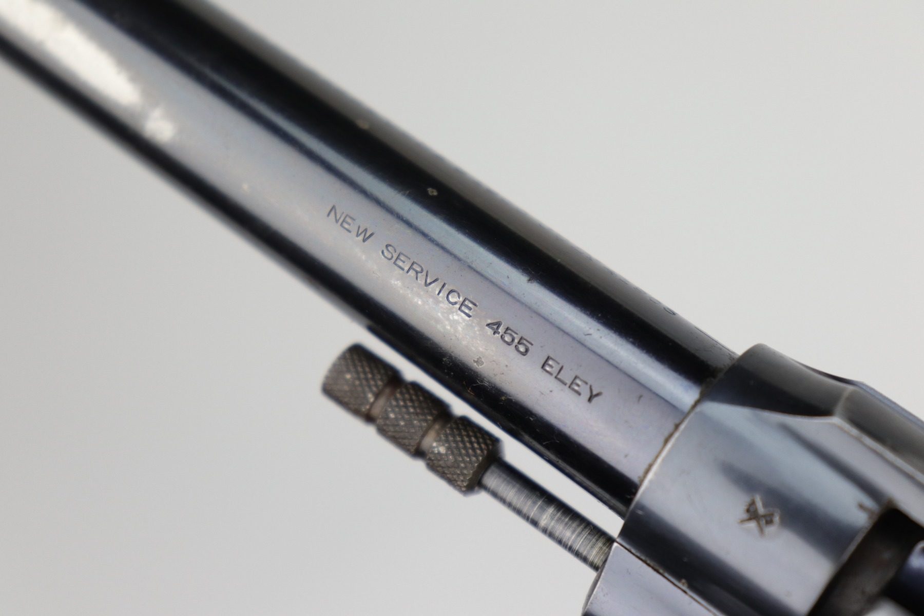 10/9/20 – This is a nice example of a WW1 Colt New Service revolver, manufactured in 1916. This gun was part of a British contract, evidenced by the British proofs and the fact that it is chambered in the British .455 Eley cartridge. The gun functions well and the action is smooth. It has retained roughly 60% of its original high-polish finish. There are areas of significant wear along the length of both sides of the barrel, on the cylinder, and the straps. There are other smaller areas of wear on the sides of the frame and underside of the trigger guard. There is minor pin-pricking around the muzzle and heavy spotty oxidation on the straps. The grips are original, but both are chipped around the butt. It still has the lanyard loop and lanyard. The original “crossed-pennants” marking on the cylinder is in tact, therefore it has not been shaved. The bore is excellent – shiny with strong rifling.