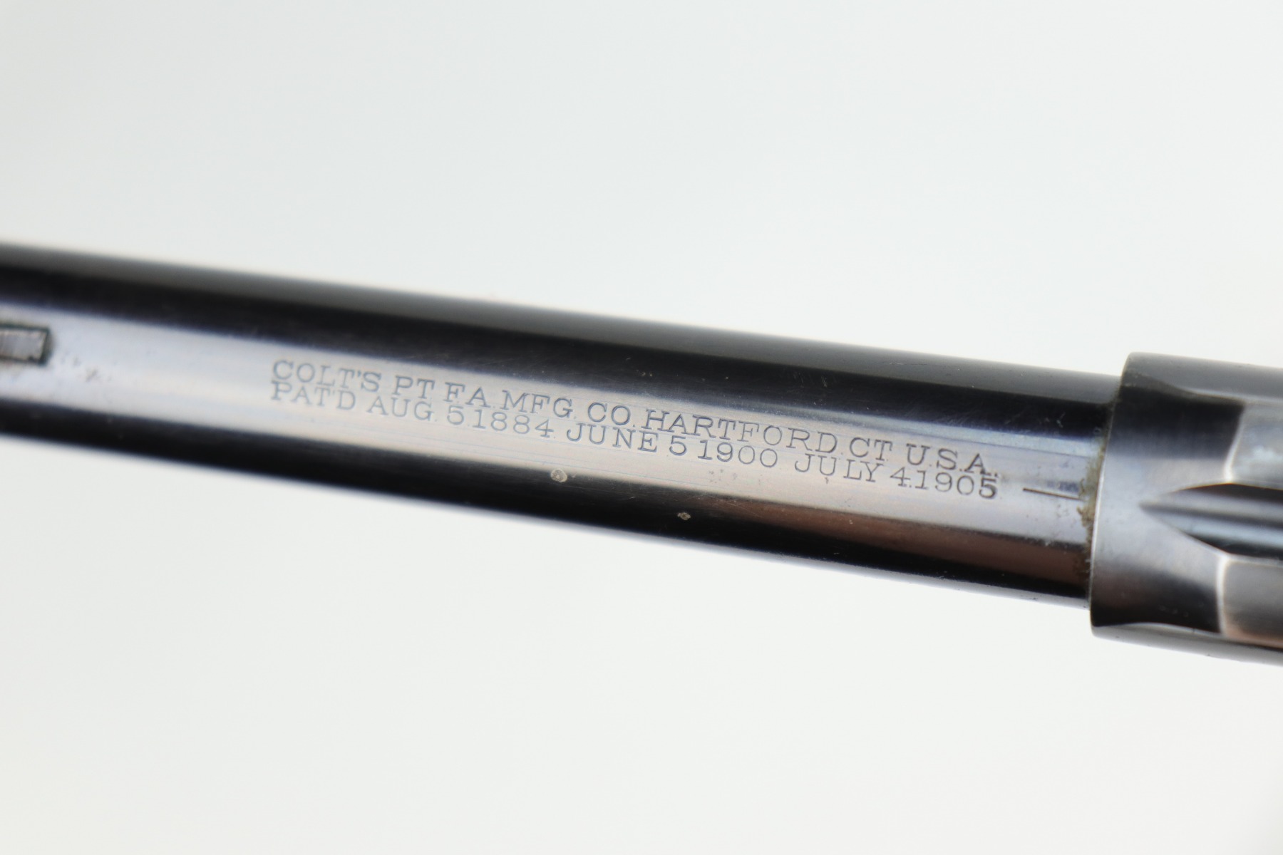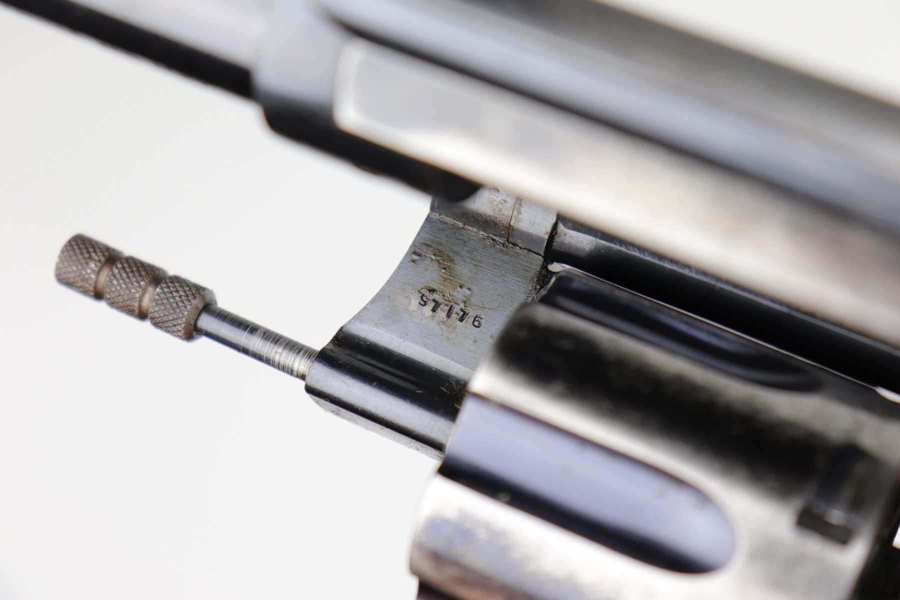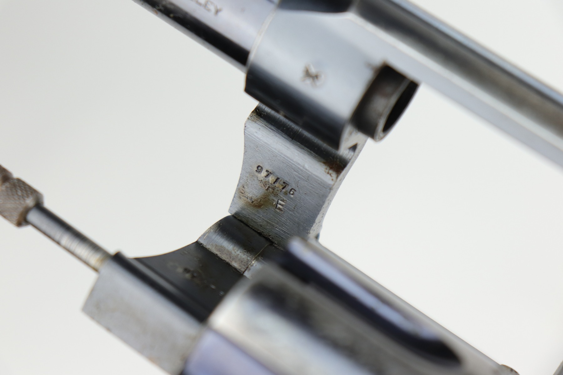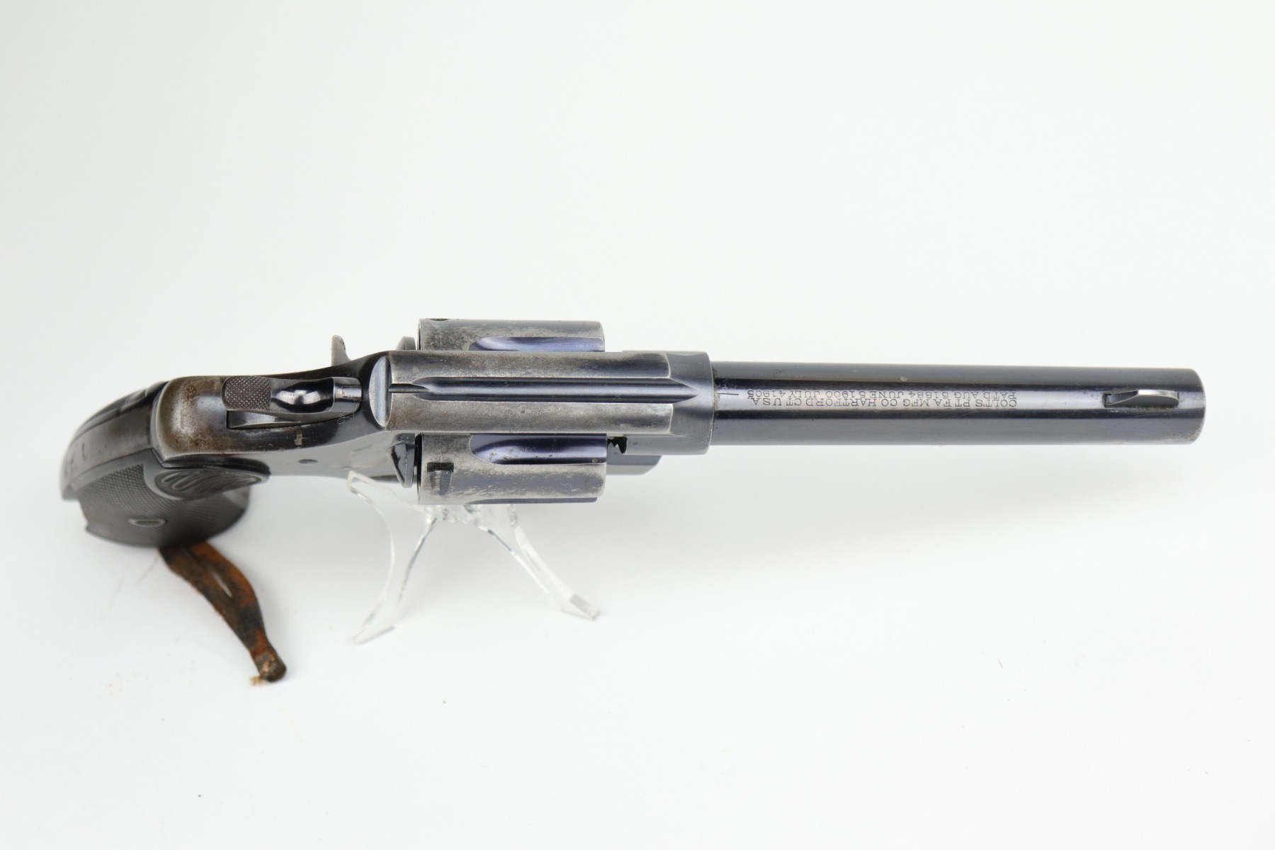 10/9/20 – This is a nice example of a WW1 Colt New Service revolver, manufactured in 1916. This gun was part of a British contract, evidenced by the British proofs and the fact that it is chambered in the British .455 Eley cartridge. The gun functions well and the action is smooth. It has retained roughly 60% of its original high-polish finish. There are areas of significant wear along the length of both sides of the barrel, on the cylinder, and the straps. There are other smaller areas of wear on the sides of the frame and underside of the trigger guard. There is minor pin-pricking around the muzzle and heavy spotty oxidation on the straps. The grips are original, but both are chipped around the butt. It still has the lanyard loop and lanyard. The original “crossed-pennants” marking on the cylinder is in tact, therefore it has not been shaved. The bore is excellent – shiny with strong rifling.