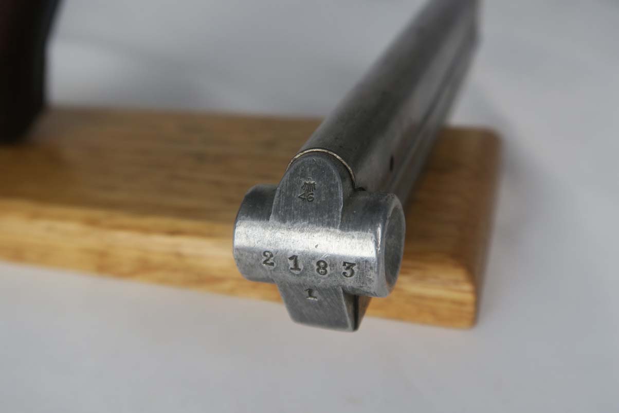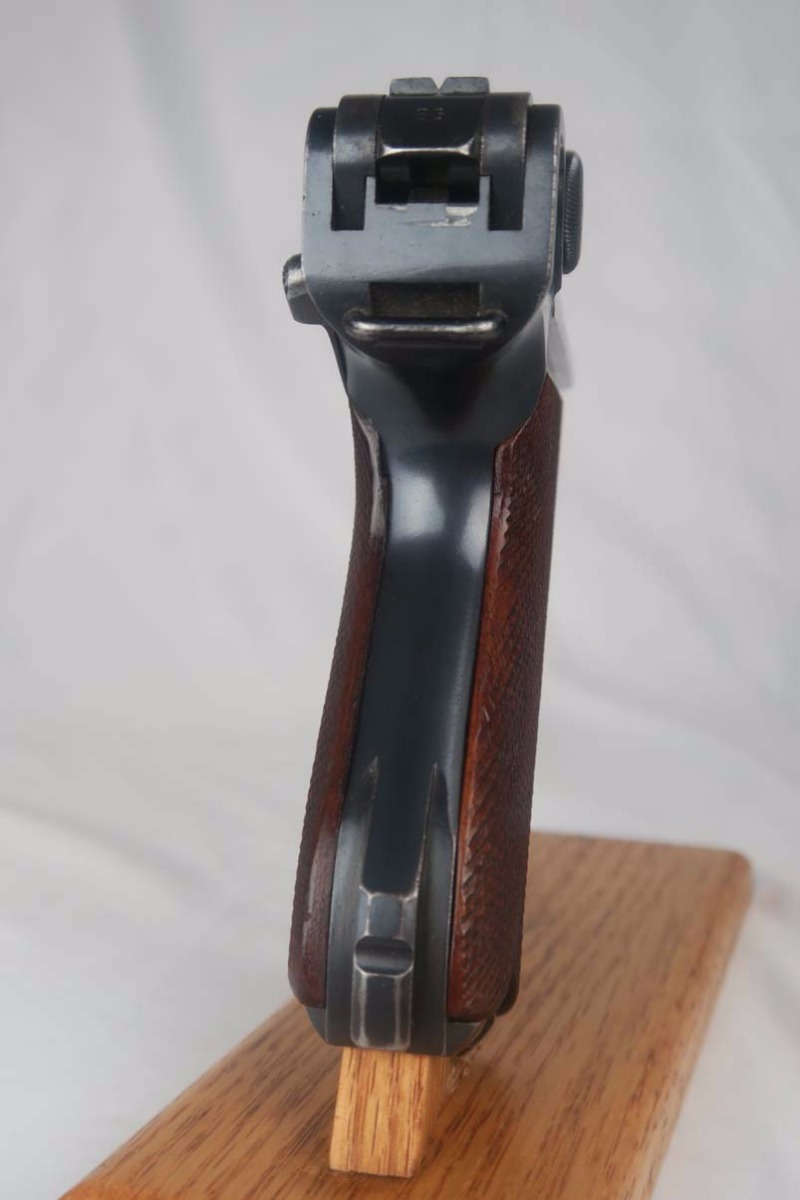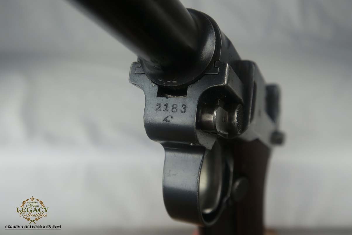 5/24/17 –This is a German Army issued gun for WW1. First manufactured in 1914, then reworked after the war in 1920 for the police, It has a unit marking on the front strap, and sear safety on the sideplate. The finish looks original to 1914 OR 1920. There is still a little visible straw on the trigger and safety. The parts are all matching. This includes the hold open and firing pin. The grips are unmarked. The bore has strong rifling but is freckled and frosted throughout.