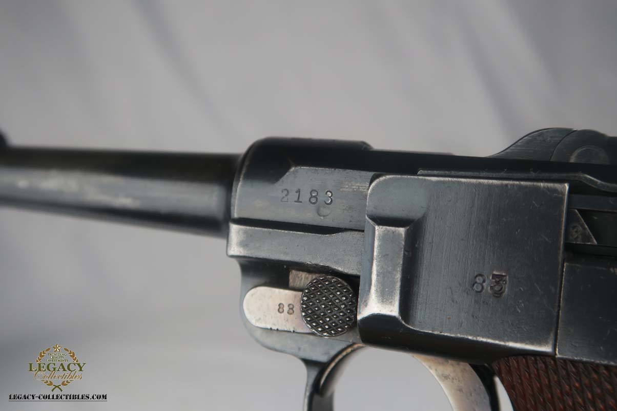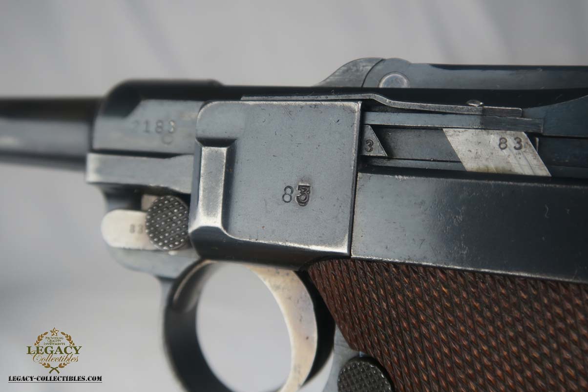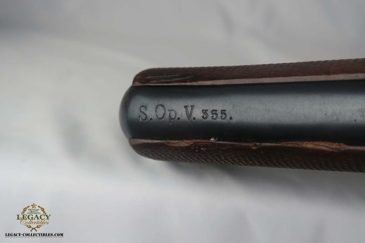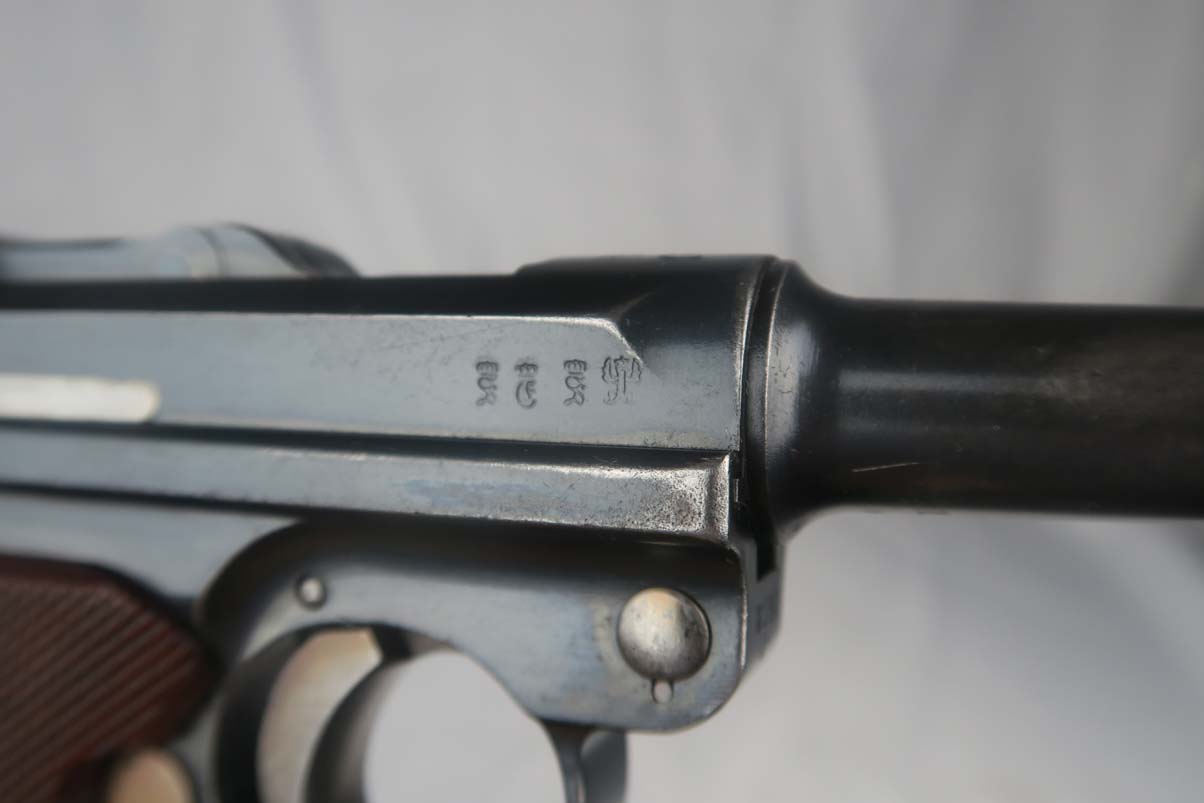 5/24/17 –This is a German Army issued gun for WW1. First manufactured in 1914, then reworked after the war in 1920 for the police, It has a unit marking on the front strap, and sear safety on the sideplate. The finish looks original to 1914 OR 1920. There is still a little visible straw on the trigger and safety. The parts are all matching. This includes the hold open and firing pin. The grips are unmarked. The bore has strong rifling but is freckled and frosted throughout.