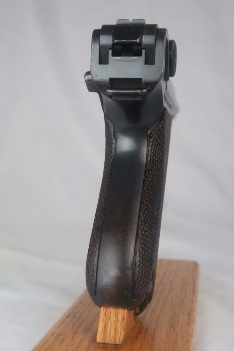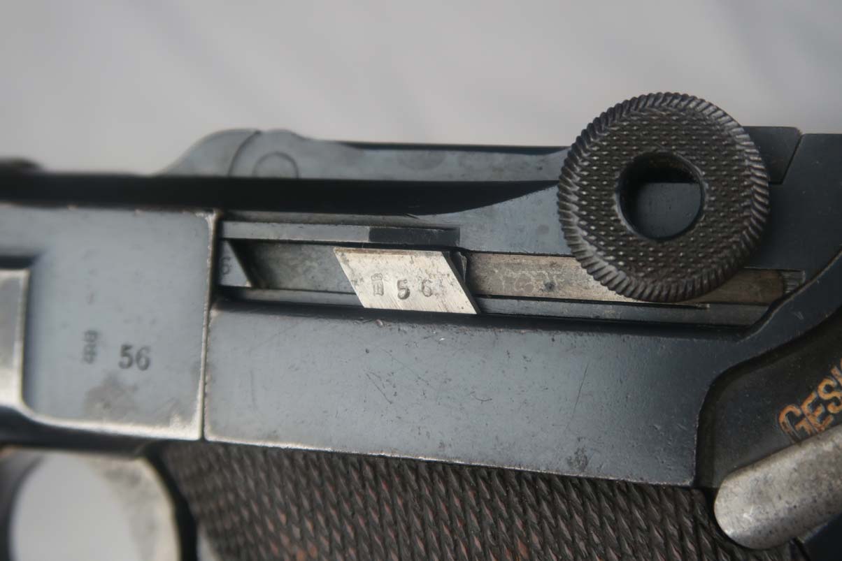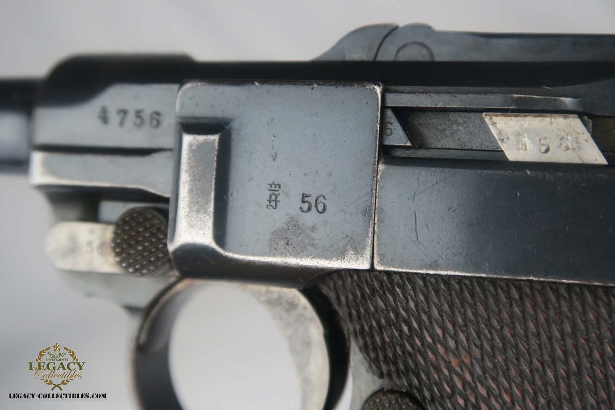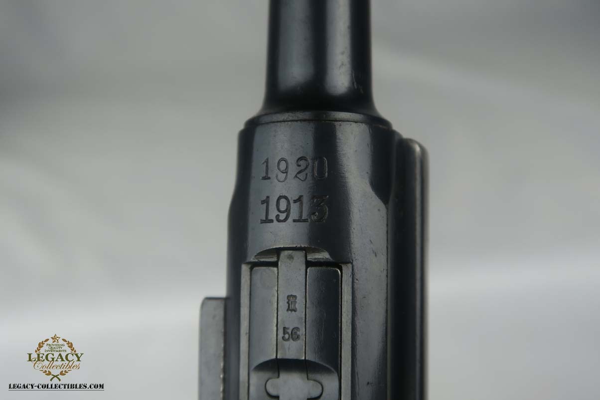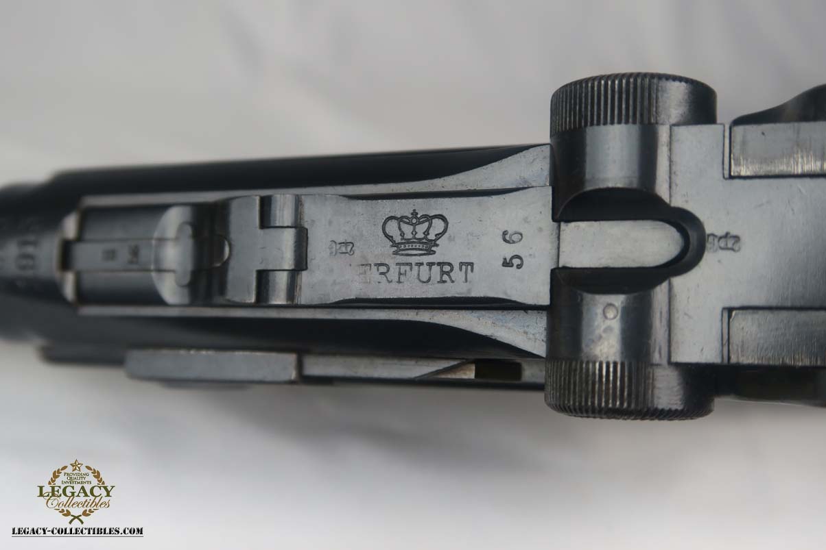 5/24/17 – This is a German Army issued gun for WW1. First manufactured in 1913. It was reworked after the war in 1920. I don’t see signs that it went to the police so perhaps it was sold in the commercial market between the wars, but there is no “Germany” marking or any other import marks. The finish looks original to 1913 OR 1920, and rates at about 90% with the majority of the wear on the straps. The straw color is almost completely gone. The parts are all matching and Erfurt proofed. This includes the hold open and firing pin. The grips are Erfurt proofed and numbered 56. The grips are worn but the wear would seem to match the wear on the gun. The bore is worn about the same, but would still rate a 6 out of 10. There is no lug stock on this gun, which would be correct for a 1913 Erfurt.