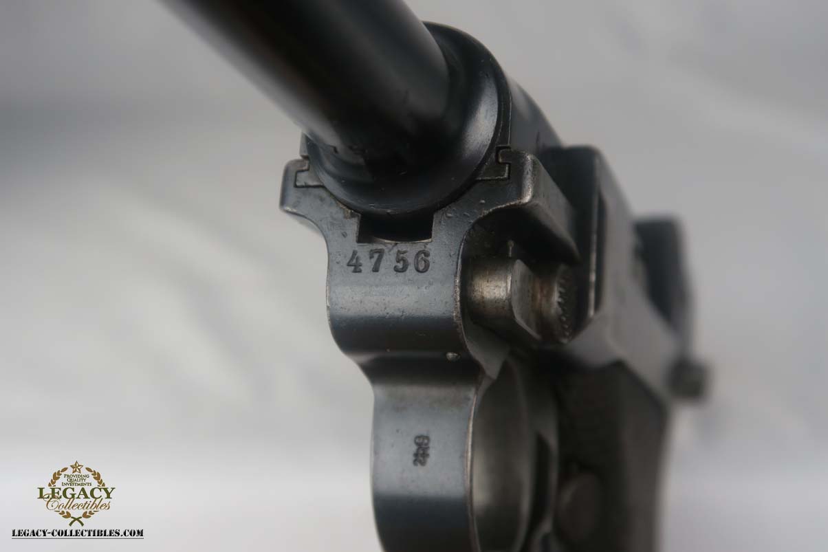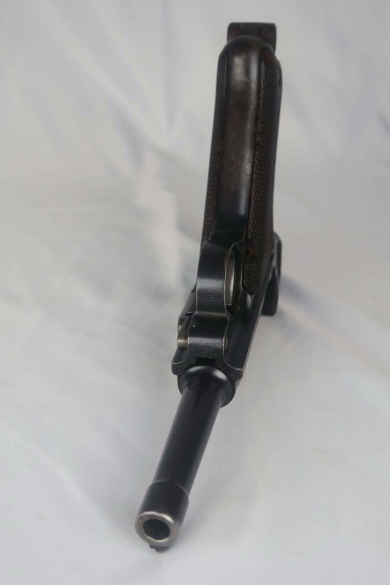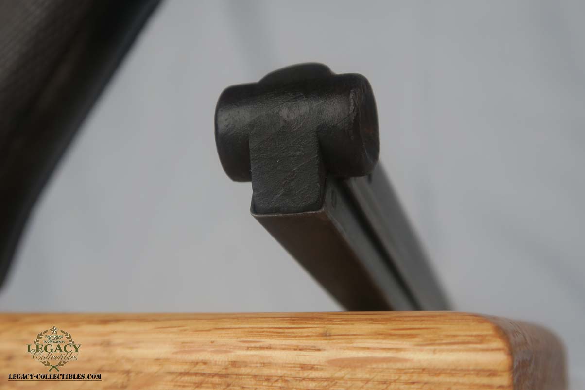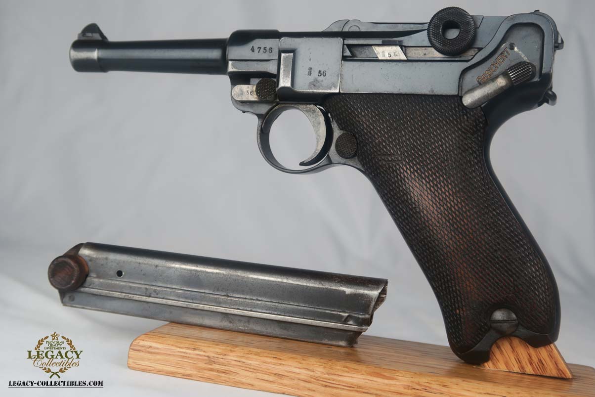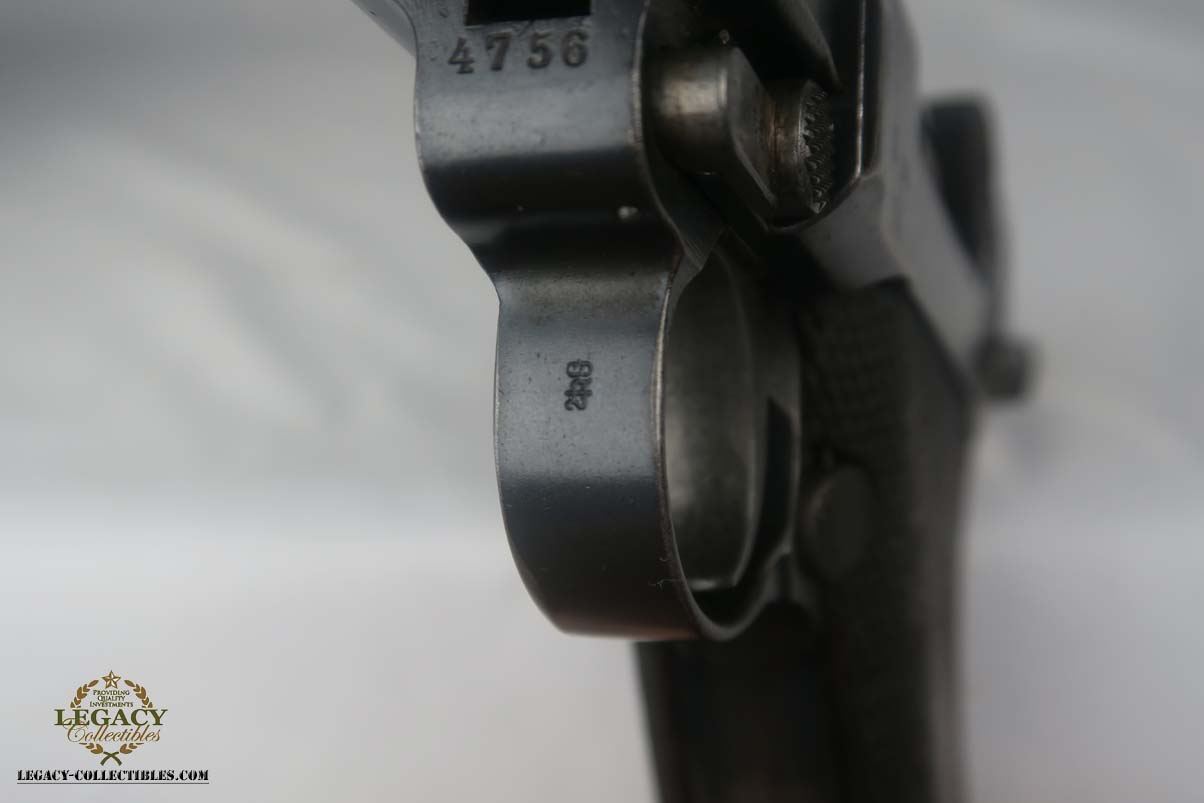 5/24/17 – This is a German Army issued gun for WW1. First manufactured in 1913. It was reworked after the war in 1920. I don’t see signs that it went to the police so perhaps it was sold in the commercial market between the wars, but there is no “Germany” marking or any other import marks. The finish looks original to 1913 OR 1920, and rates at about 90% with the majority of the wear on the straps. The straw color is almost completely gone. The parts are all matching and Erfurt proofed. This includes the hold open and firing pin. The grips are Erfurt proofed and numbered 56. The grips are worn but the wear would seem to match the wear on the gun. The bore is worn about the same, but would still rate a 6 out of 10. There is no lug stock on this gun, which would be correct for a 1913 Erfurt.