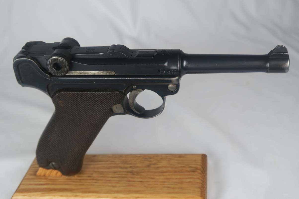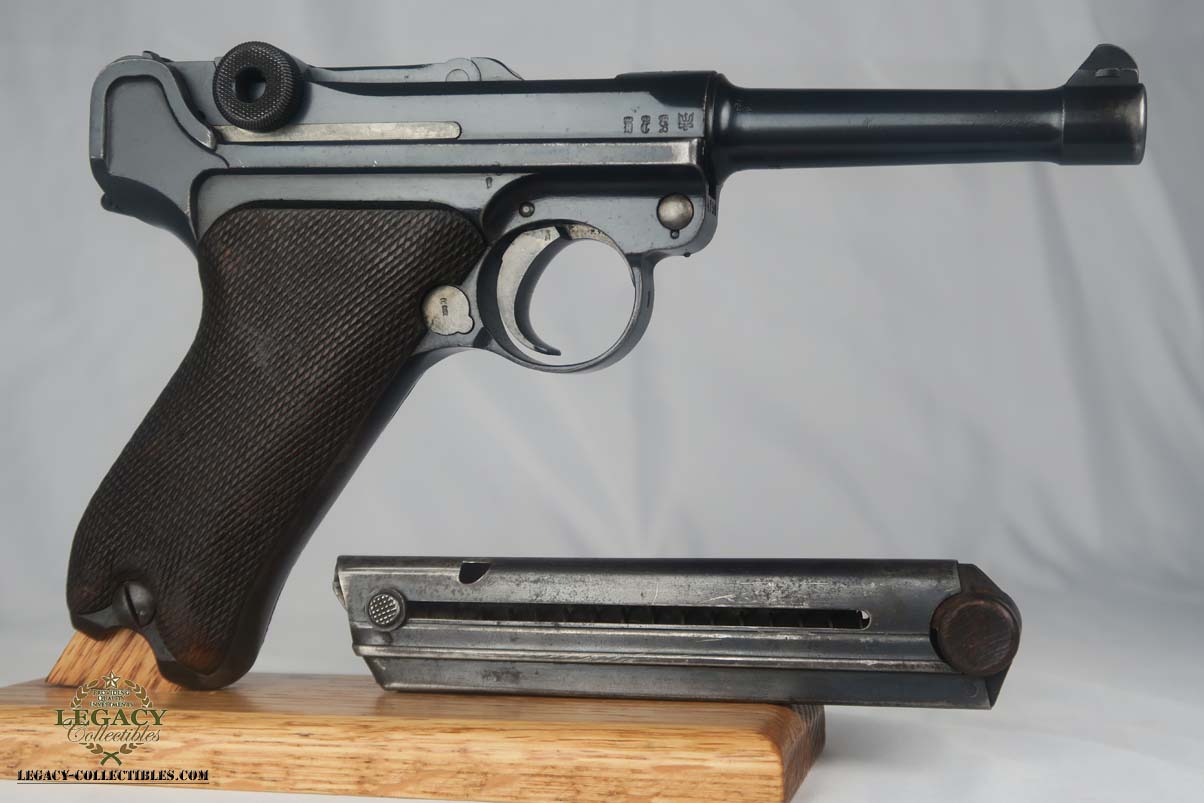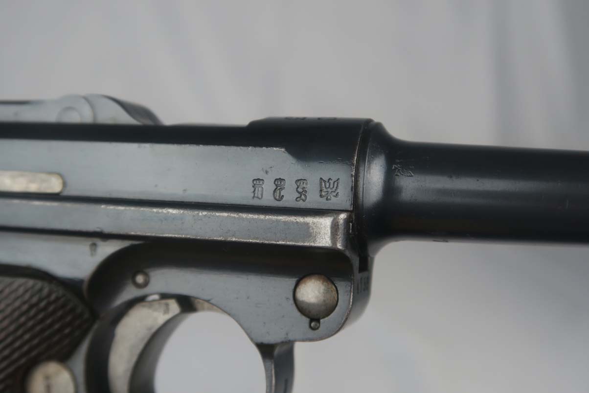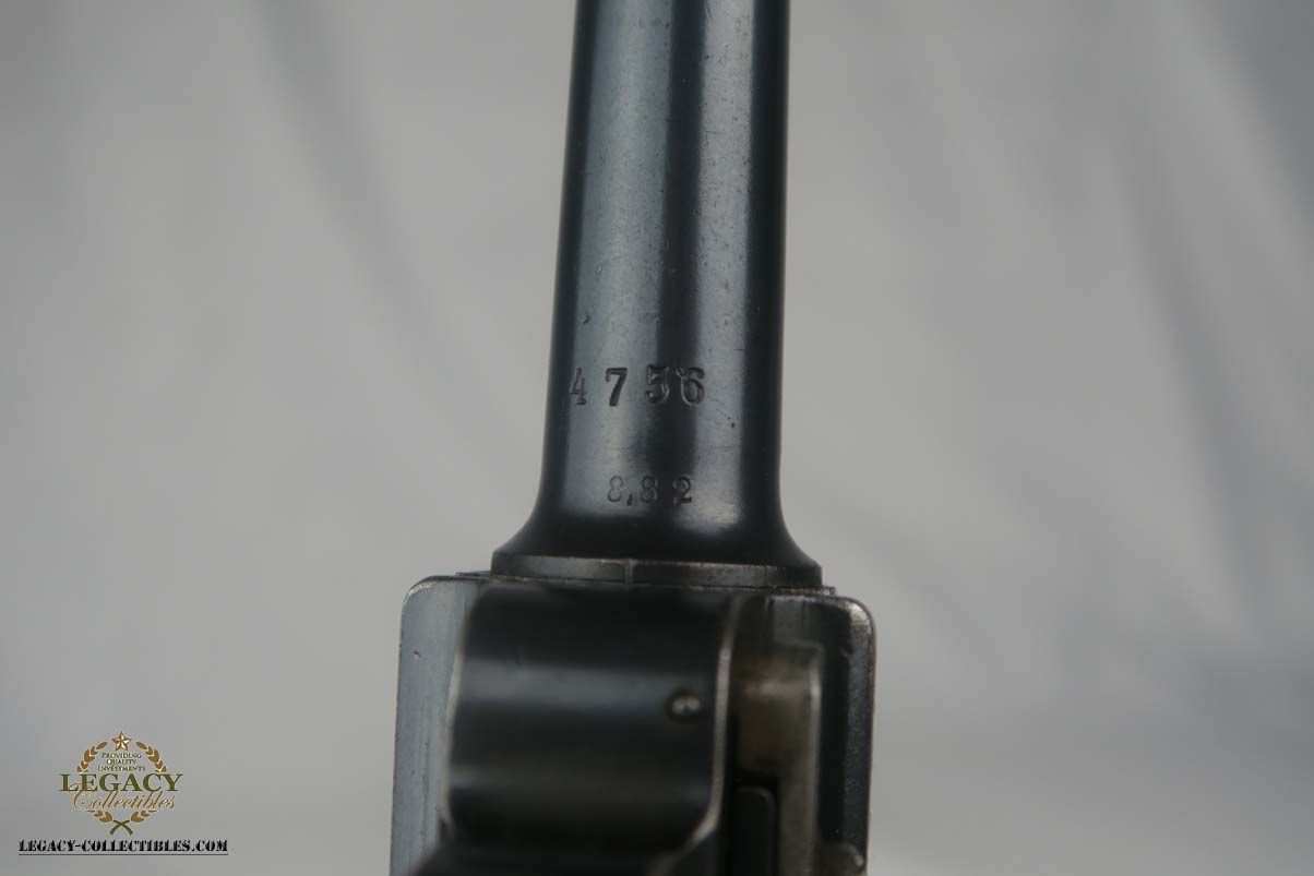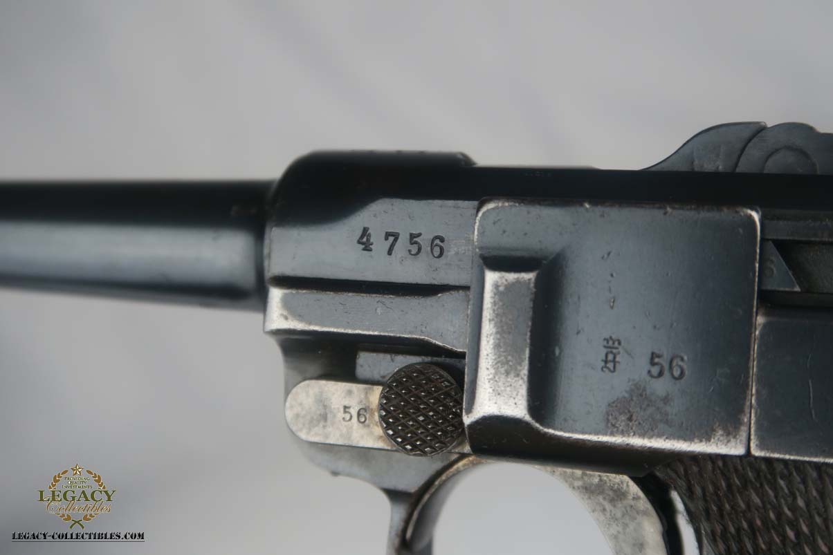 5/24/17 – This is a German Army issued gun for WW1. First manufactured in 1913. It was reworked after the war in 1920. I don’t see signs that it went to the police so perhaps it was sold in the commercial market between the wars, but there is no “Germany” marking or any other import marks. The finish looks original to 1913 OR 1920, and rates at about 90% with the majority of the wear on the straps. The straw color is almost completely gone. The parts are all matching and Erfurt proofed. This includes the hold open and firing pin. The grips are Erfurt proofed and numbered 56. The grips are worn but the wear would seem to match the wear on the gun. The bore is worn about the same, but would still rate a 6 out of 10. There is no lug stock on this gun, which would be correct for a 1913 Erfurt.