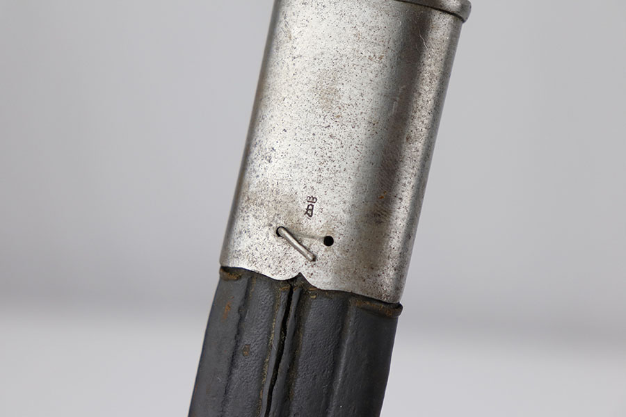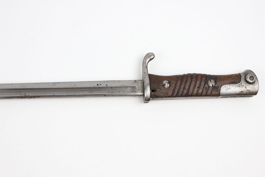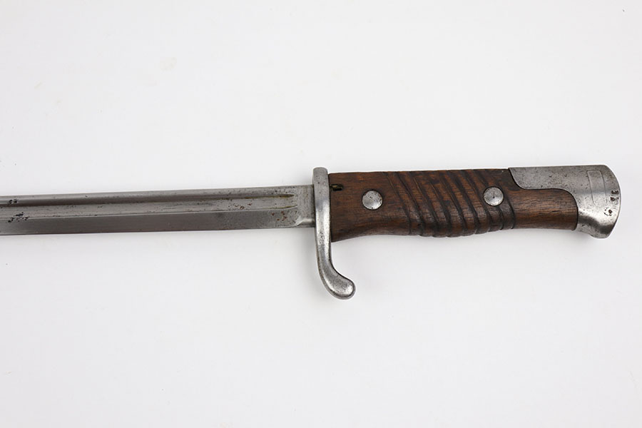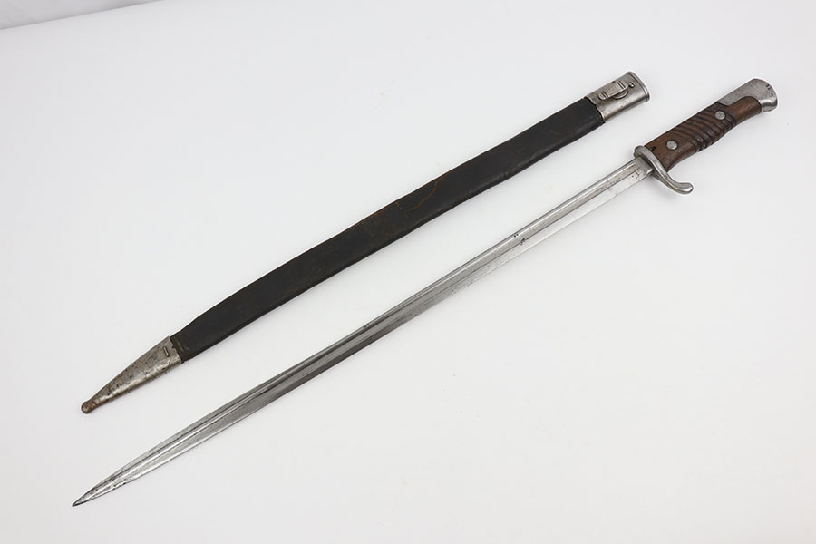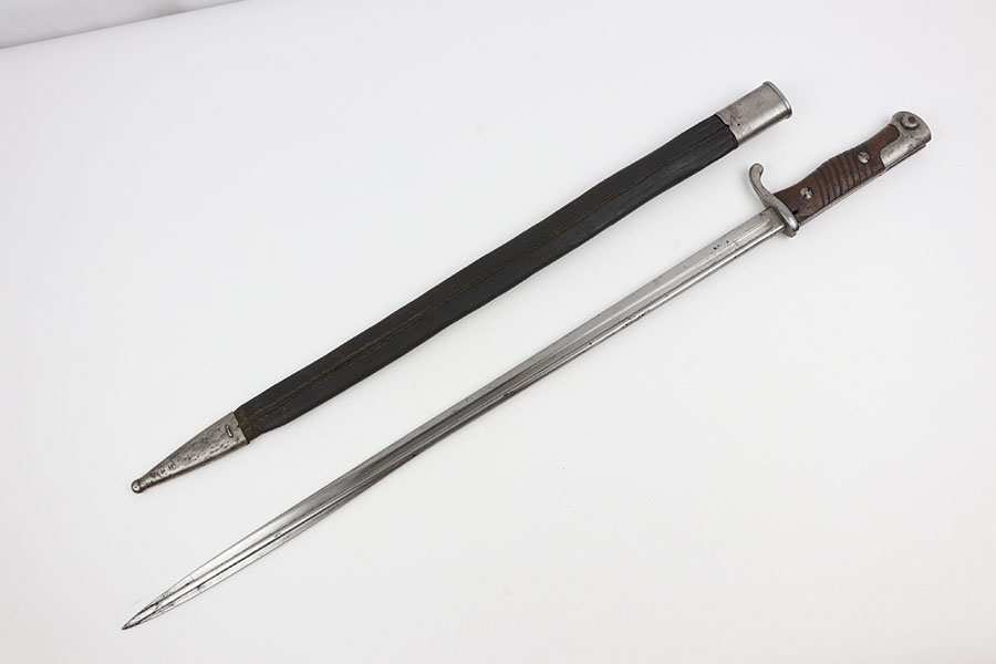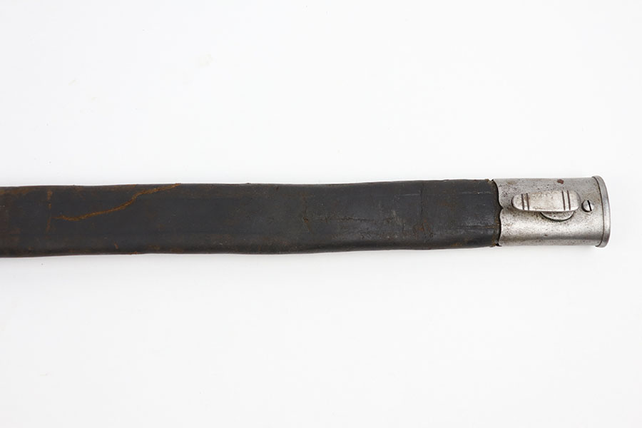 10/1/19 – This is an original WWI era (1898-1914) rifle bayonet. This is a dress or parade bayonet, as the blade is longer (measures 20.5 inches long) and has a shiny finish compared to the military combat bayonets. The blade is in excellent condition with very minimal wear. The handle and hand guard both have dark discoloration / patina as shown in photos. The wood is in great shape though. The leather on the scabbard is worn and scuffed throughout, but the leather is original and in tact. There is more discoloration and wear on the metal areas of the scabbard. Overall in good collectible condition though.