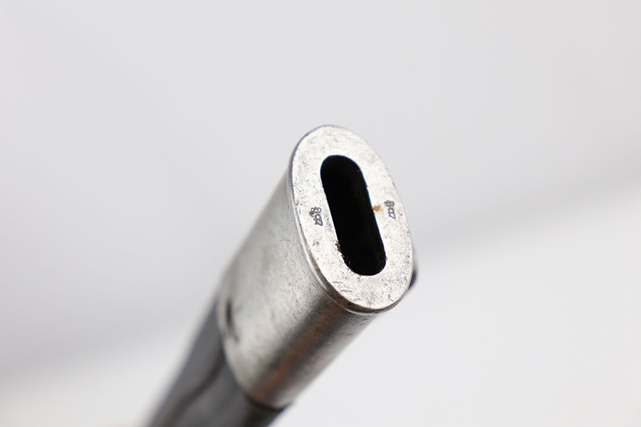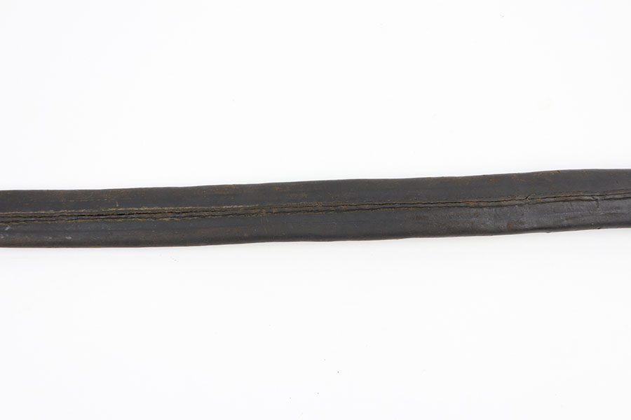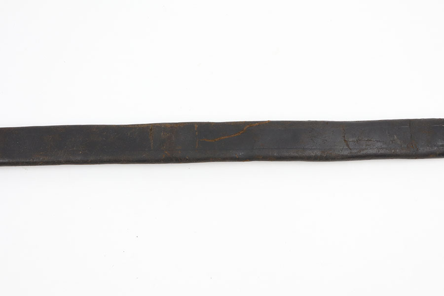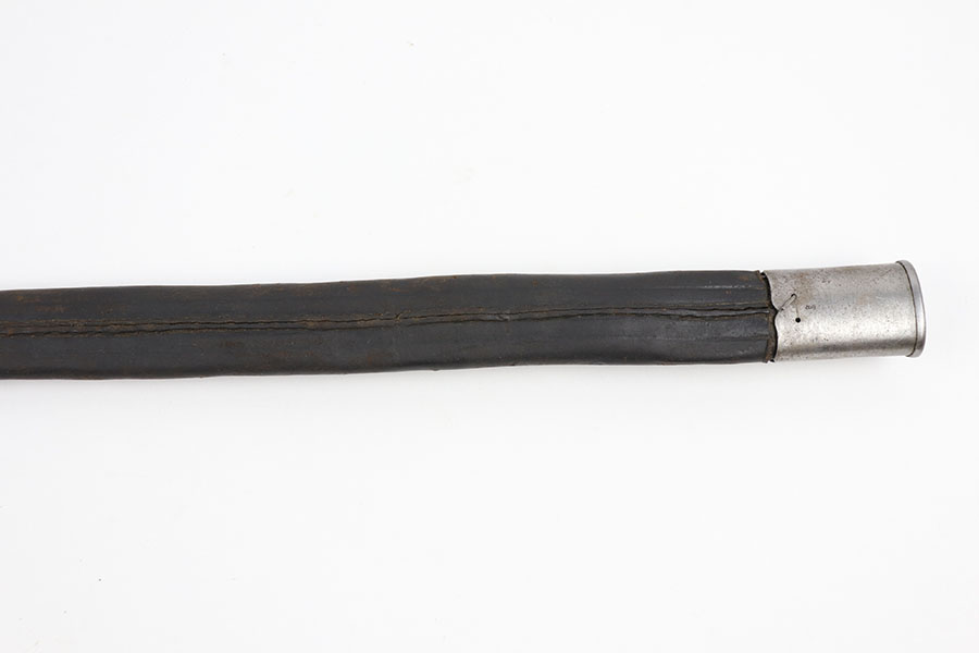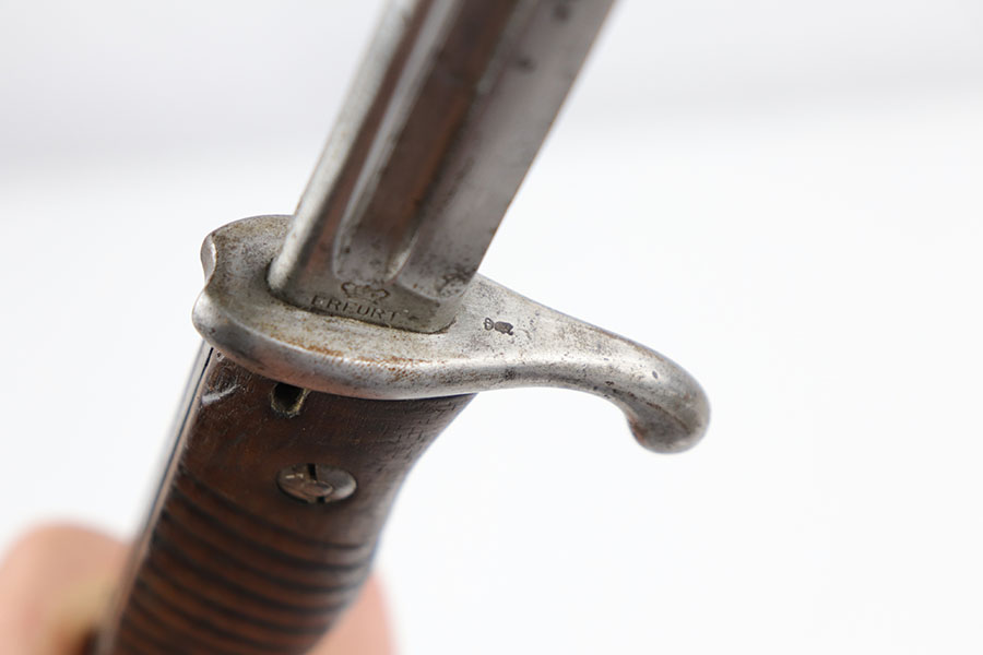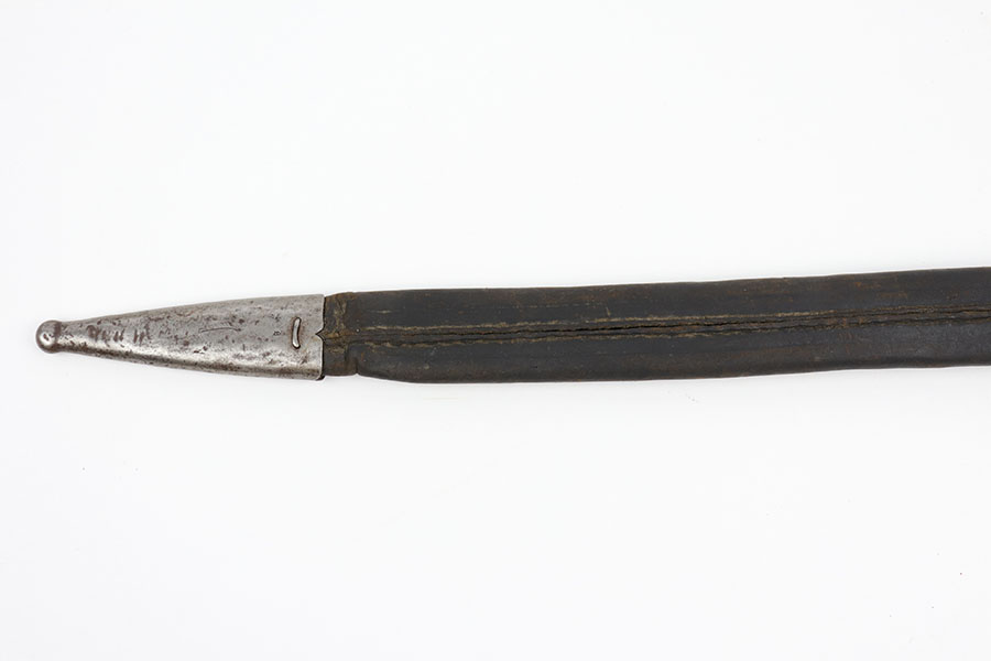 10/1/19 – This is an original WWI era (1898-1914) rifle bayonet. This is a dress or parade bayonet, as the blade is longer (measures 20.5 inches long) and has a shiny finish compared to the military combat bayonets. The blade is in excellent condition with very minimal wear. The handle and hand guard both have dark discoloration / patina as shown in photos. The wood is in great shape though. The leather on the scabbard is worn and scuffed throughout, but the leather is original and in tact. There is more discoloration and wear on the metal areas of the scabbard. Overall in good collectible condition though.