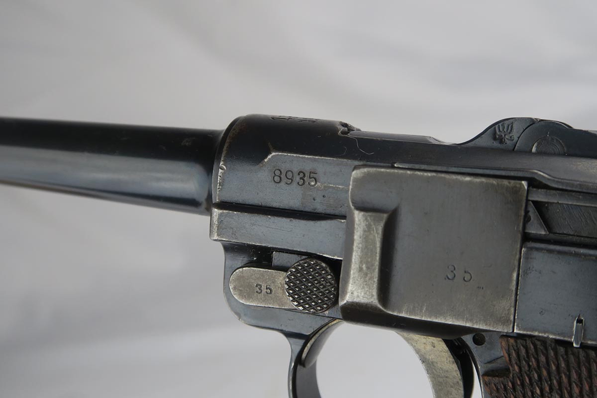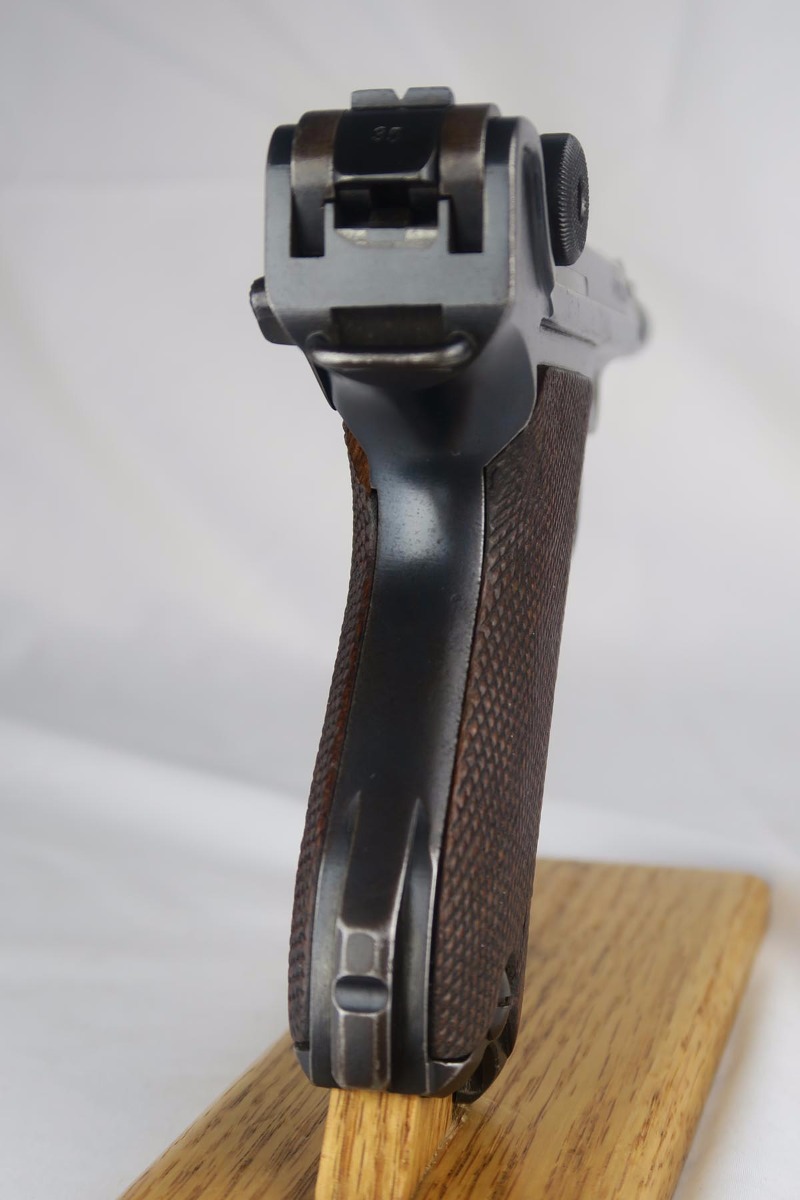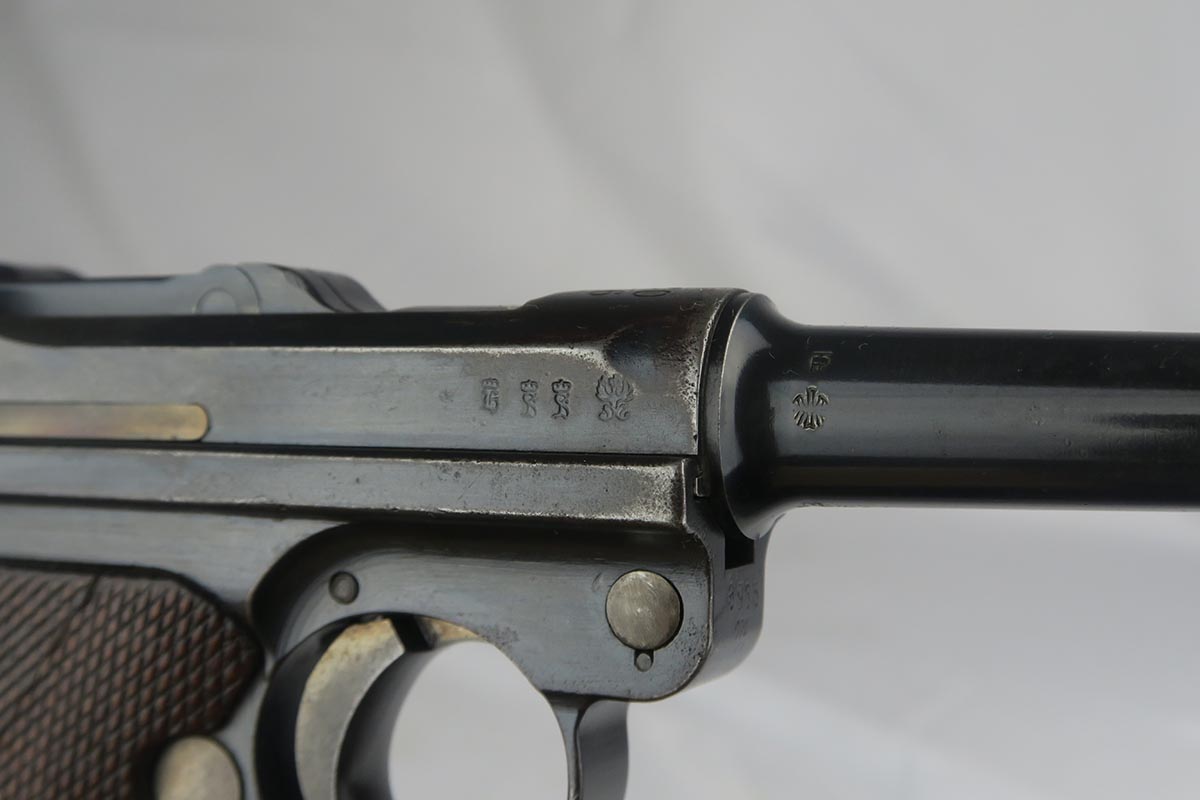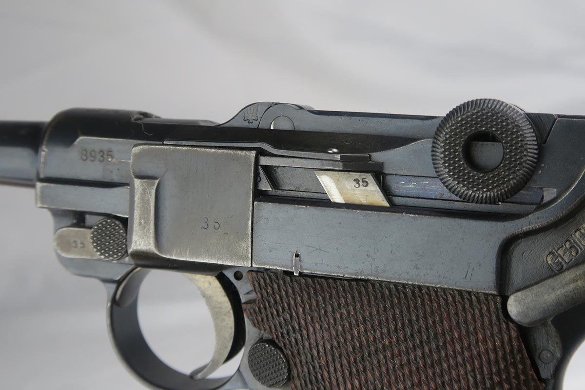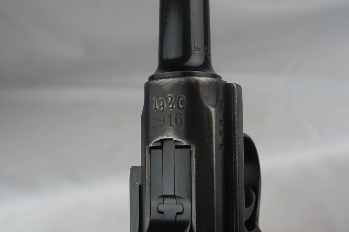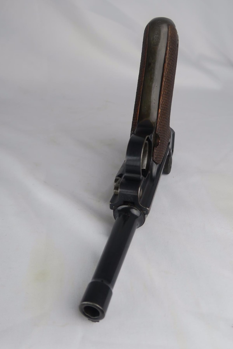 1/16/18 –  This is a WW1 era luger that was manufactured by DWM and then reworked for police use in 1920.  Sometimes referred to as ‘double date’ lugers, this pistol is marked with a police unit number on the front strap, has the police sear safety above the sideplate, and has a police-numbered matching magazine.  This pistol also features the less common magazine safety, which is still intact.  Most were removed so this is not commonly found to be the case.  You can see in photos how the left grip panel has been altered to accomodate this in the top left portion of the panel.  The grips are both imperial proofed and matching to the gun, but the left panel has a notable chip below the safety.  The finish rates at about 90% with decent browning on the front strap and sideplate.  The right side of the pistol also has some surface spotting. The bore has decent rifling but freckled throughout.