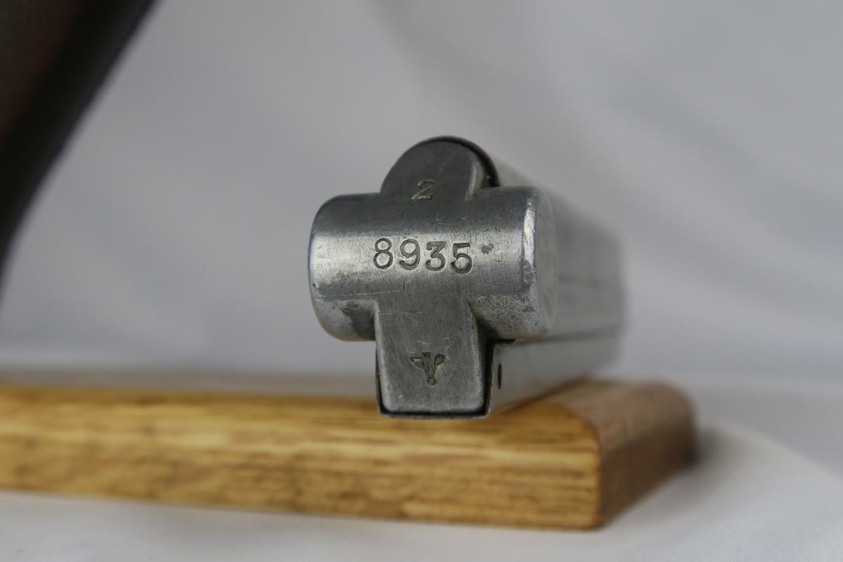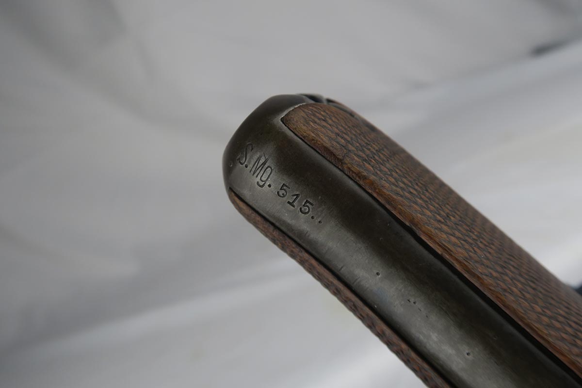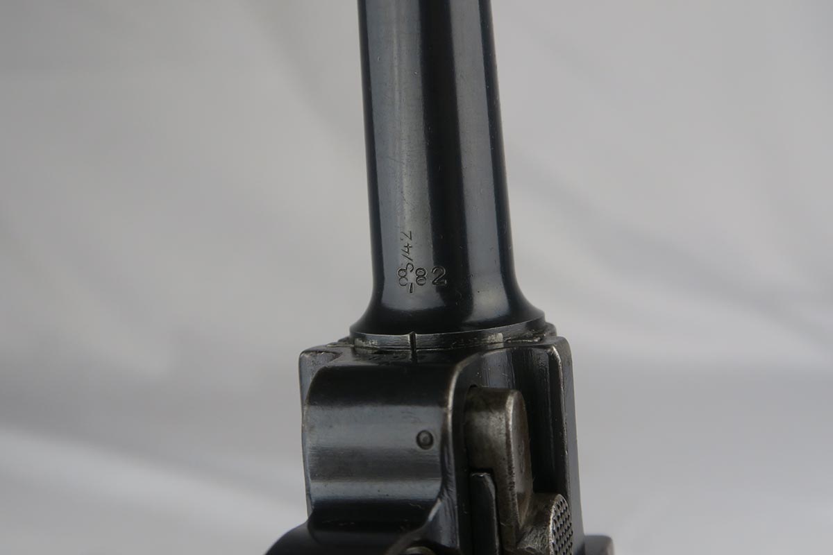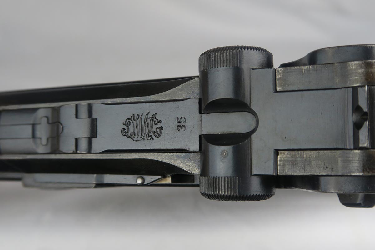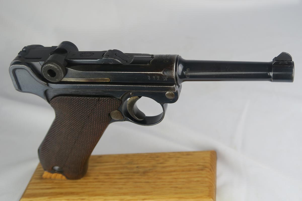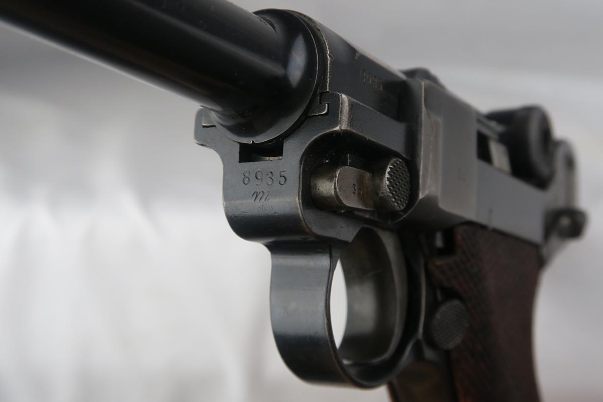 1/16/18 –  This is a WW1 era luger that was manufactured by DWM and then reworked for police use in 1920.  Sometimes referred to as ‘double date’ lugers, this pistol is marked with a police unit number on the front strap, has the police sear safety above the sideplate, and has a police-numbered matching magazine.  This pistol also features the less common magazine safety, which is still intact.  Most were removed so this is not commonly found to be the case.  You can see in photos how the left grip panel has been altered to accomodate this in the top left portion of the panel.  The grips are both imperial proofed and matching to the gun, but the left panel has a notable chip below the safety.  The finish rates at about 90% with decent browning on the front strap and sideplate.  The right side of the pistol also has some surface spotting. The bore has decent rifling but freckled throughout.
