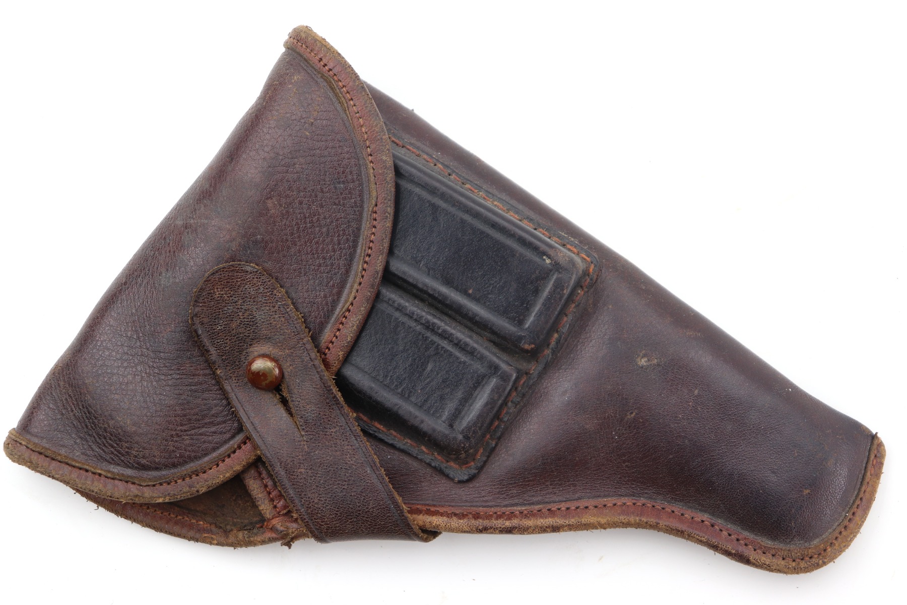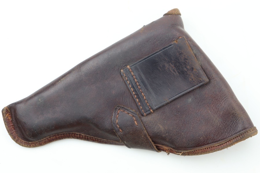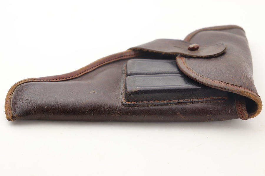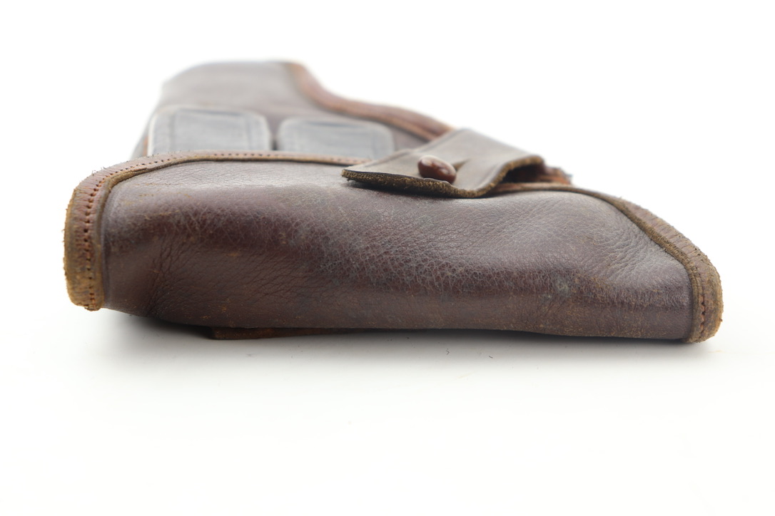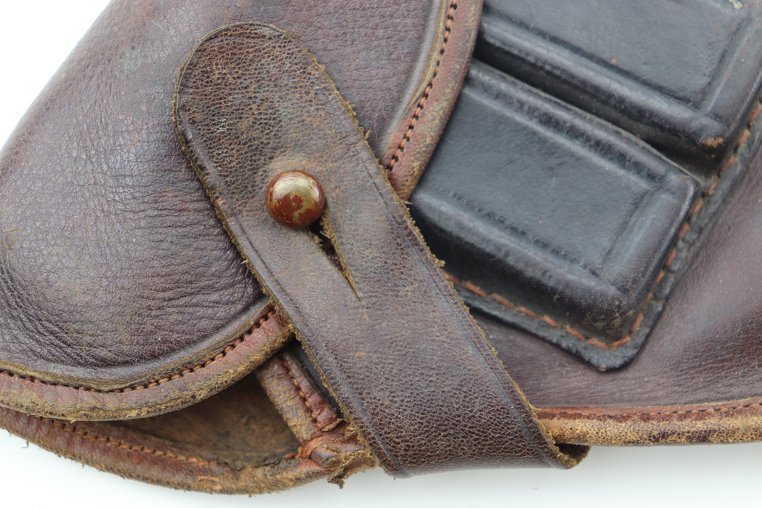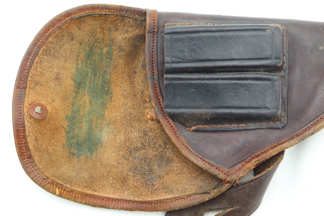 3/28/24 – This is an original WW1 era Dreyse holster. This holster has minor use wear and light color fading throughout. The leather is soft and pliable, with no rips, gouges, or tears. Two stitches have come loose on the backside near the front closure strap; otherwise, the rest of the stitching is excellent and all original. Something was written underneath the front closure hood, but it has been scribbled out with green ink. Overall a unique and very nice condition holster, especially for its age.