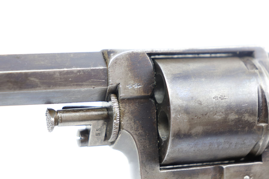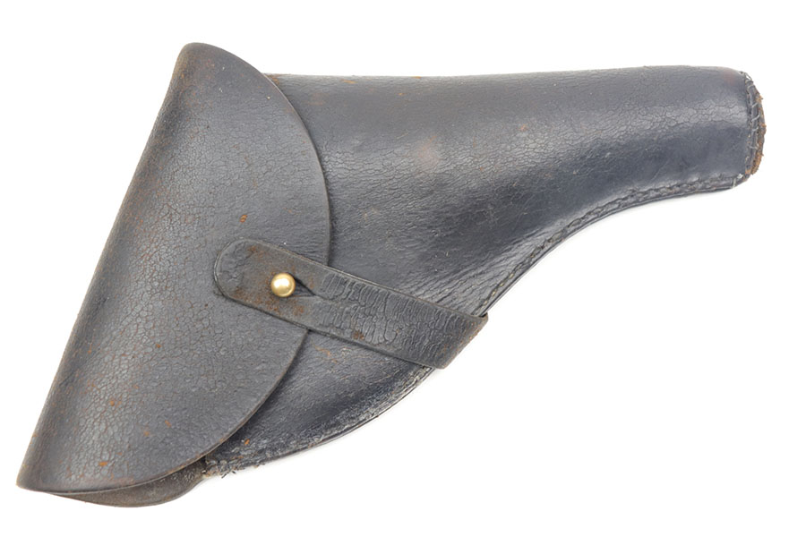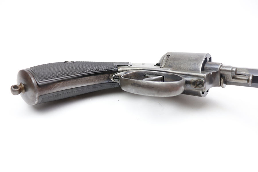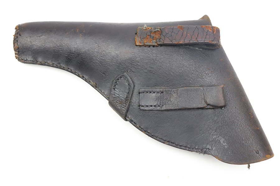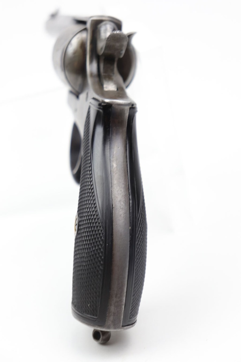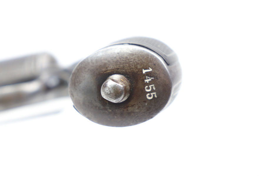 11/5/20 – This is an antique Reichsrevolver with a period correct holster. The revolver is serial numbered 1455 with all numbered parts matching. A few of the small parts are numbered “55” which is correct. The revolver has tight action and lockup as well as smooth cycling, making this fully functional. Additionally, the bore is very nice on this revolver, especially given its’ age. We rate the bore at 8.5/10 conservatively. Strong rifling and minimal wear in the grooves. The finish is almost completely missing from this revolver, and there is some light patina throughout, but there is no rust or pitting, nor any areas of serious wear. The holster is unmarked. We aren’t sure of the caliber, but the previous owner fired this revolver with .38 colt short rounds.