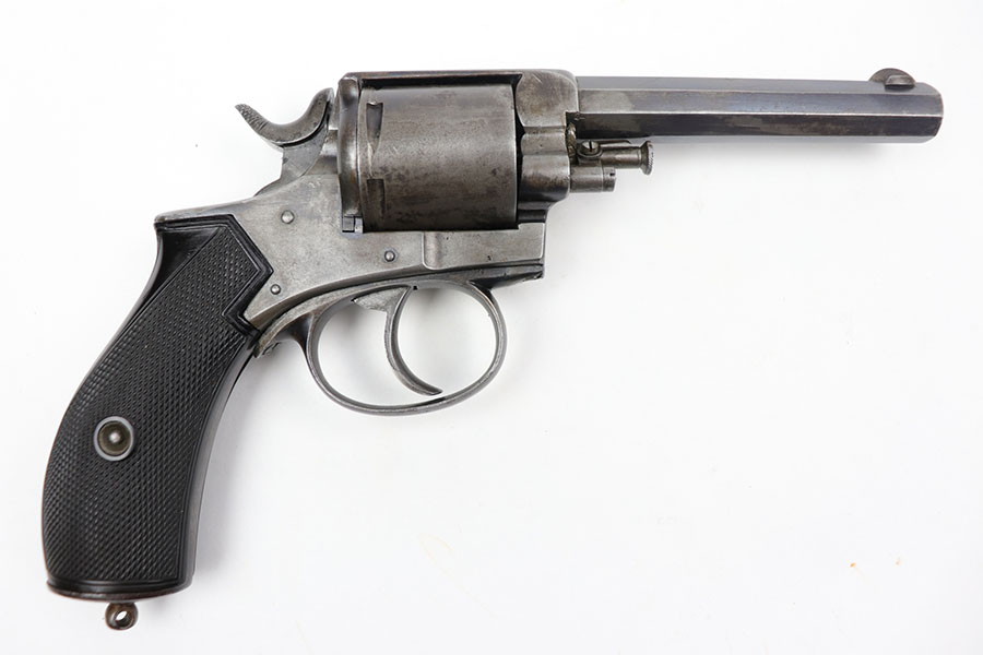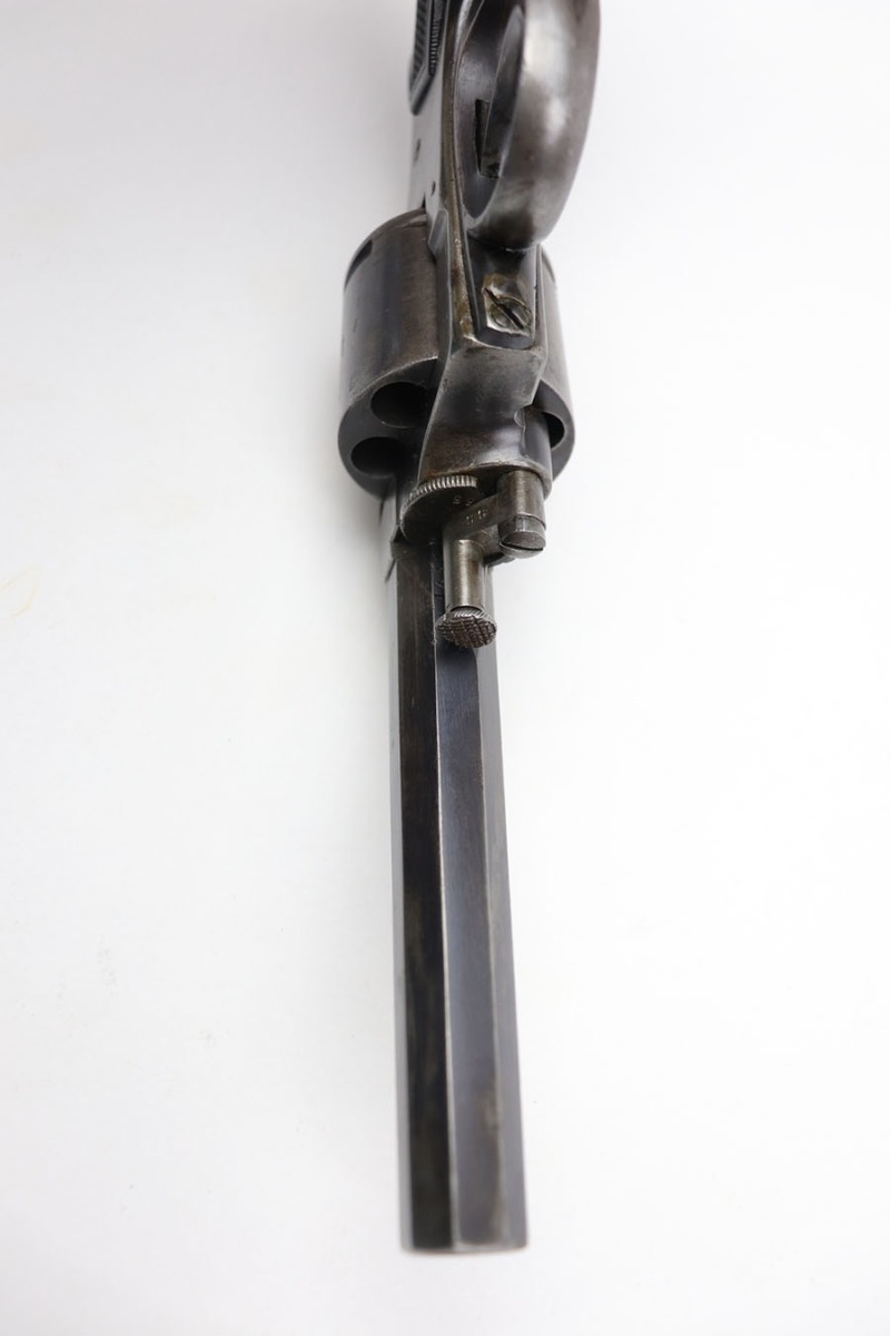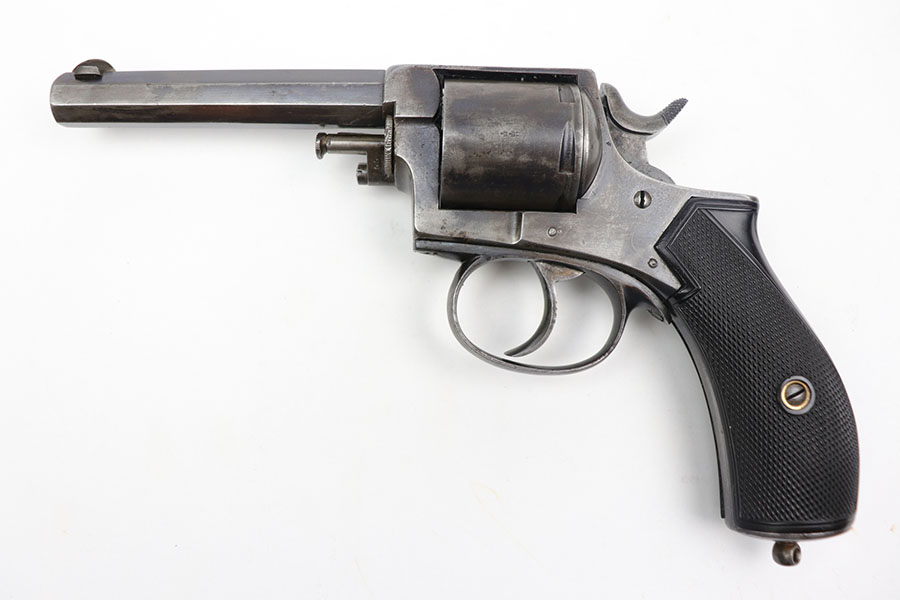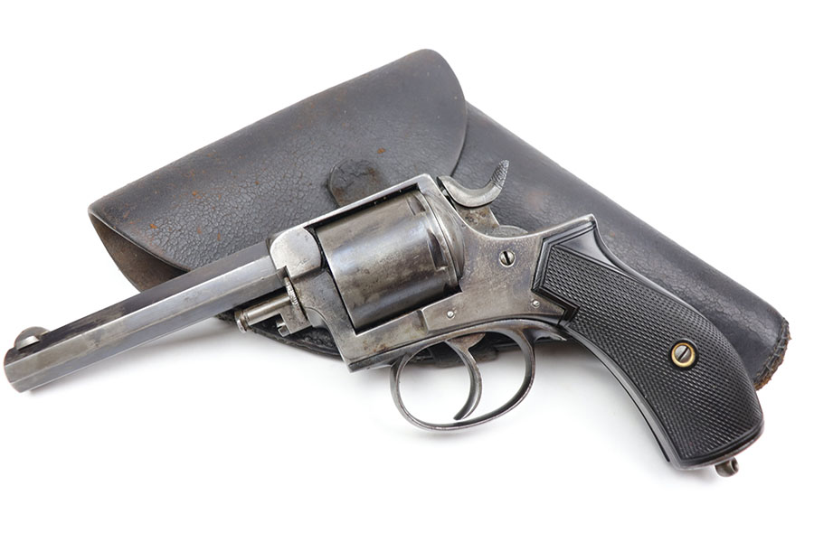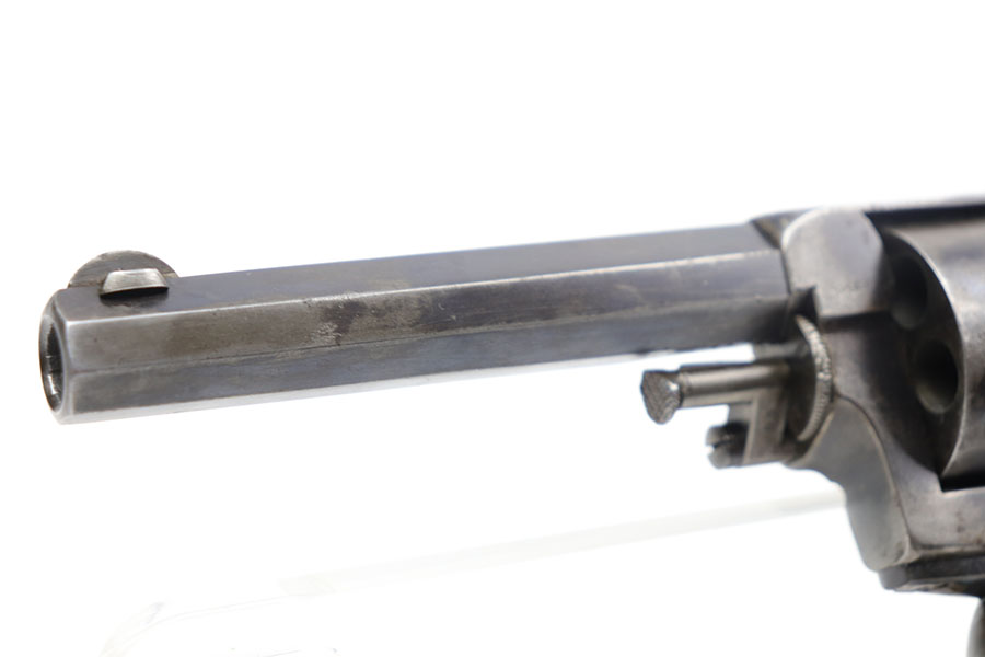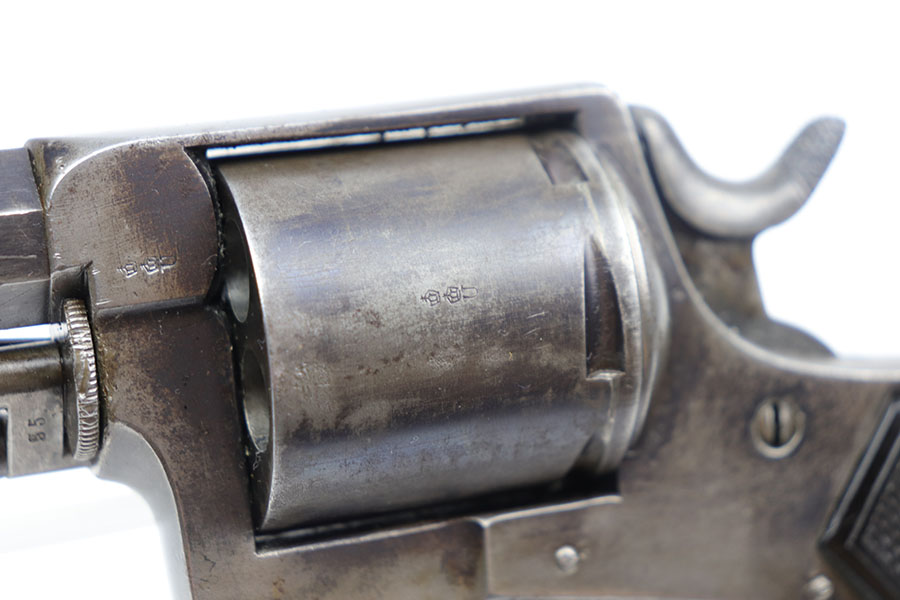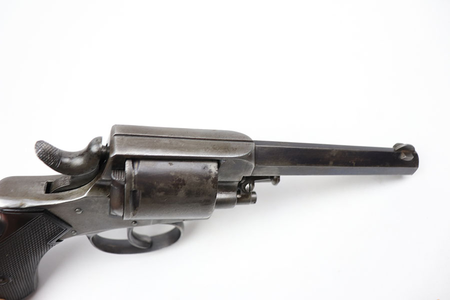 11/5/20 – This is an antique Reichsrevolver with a period correct holster. The revolver is serial numbered 1455 with all numbered parts matching. A few of the small parts are numbered “55” which is correct. The revolver has tight action and lockup as well as smooth cycling, making this fully functional. Additionally, the bore is very nice on this revolver, especially given its’ age. We rate the bore at 8.5/10 conservatively. Strong rifling and minimal wear in the grooves. The finish is almost completely missing from this revolver, and there is some light patina throughout, but there is no rust or pitting, nor any areas of serious wear. The holster is unmarked. We aren’t sure of the caliber, but the previous owner fired this revolver with .38 colt short rounds.