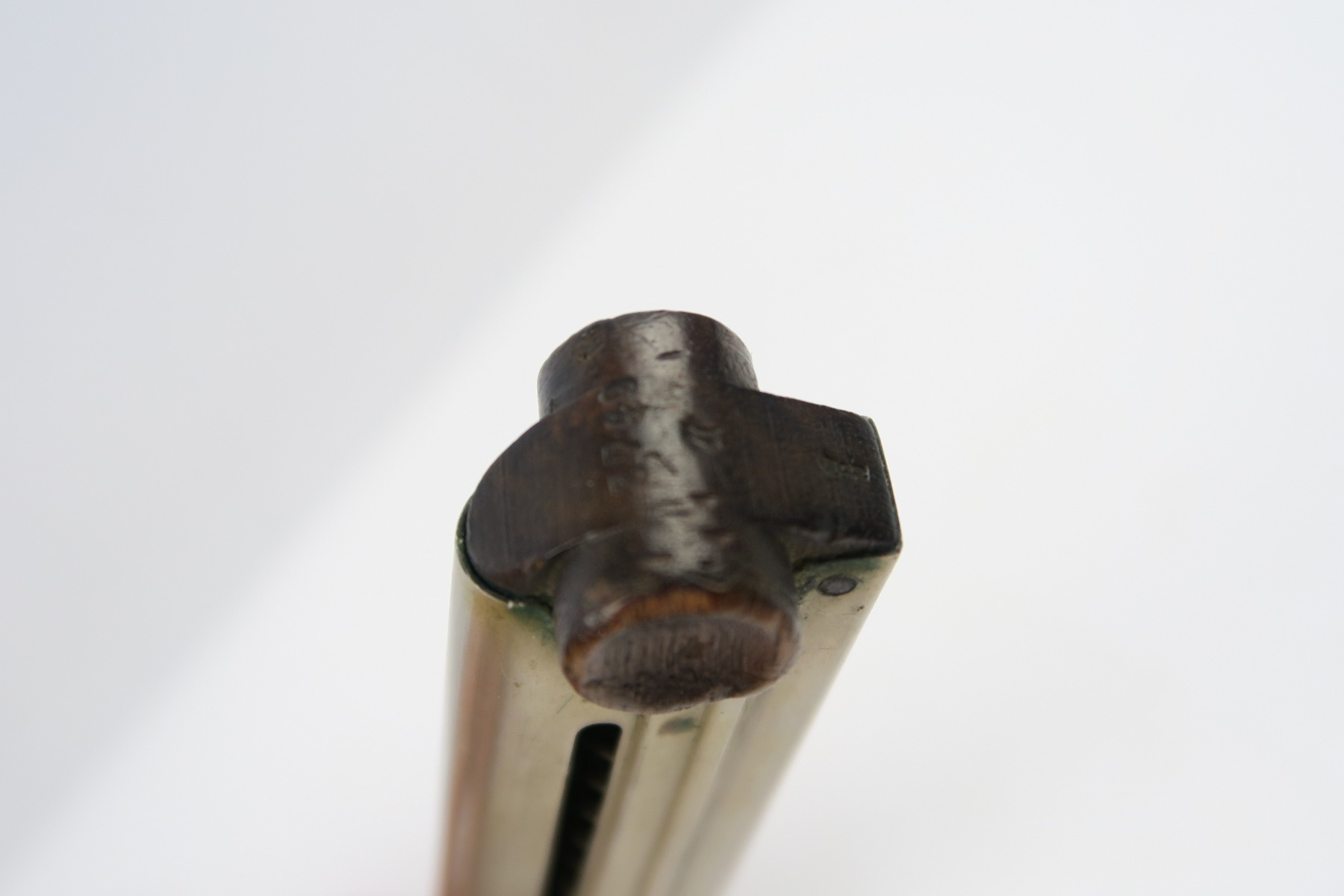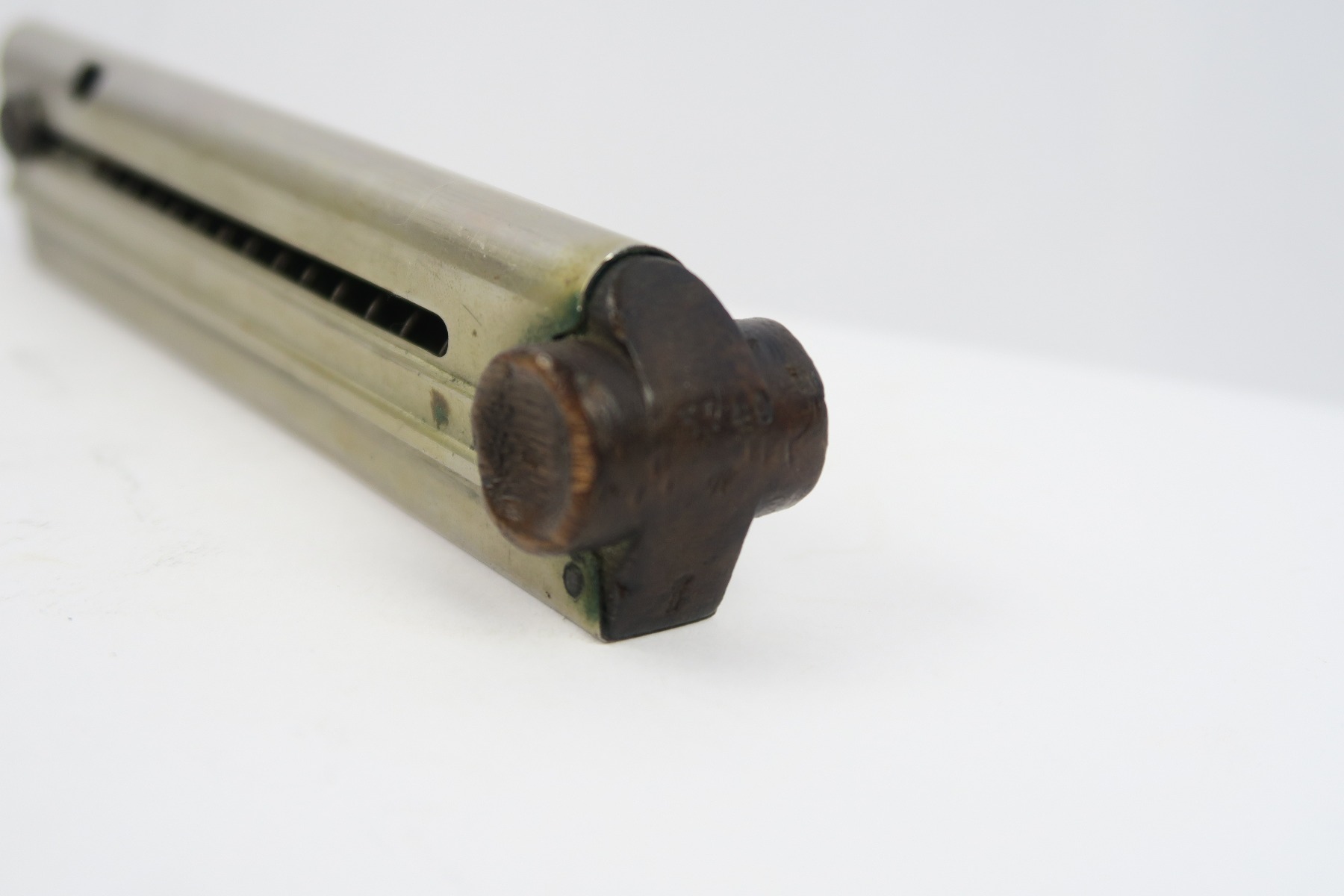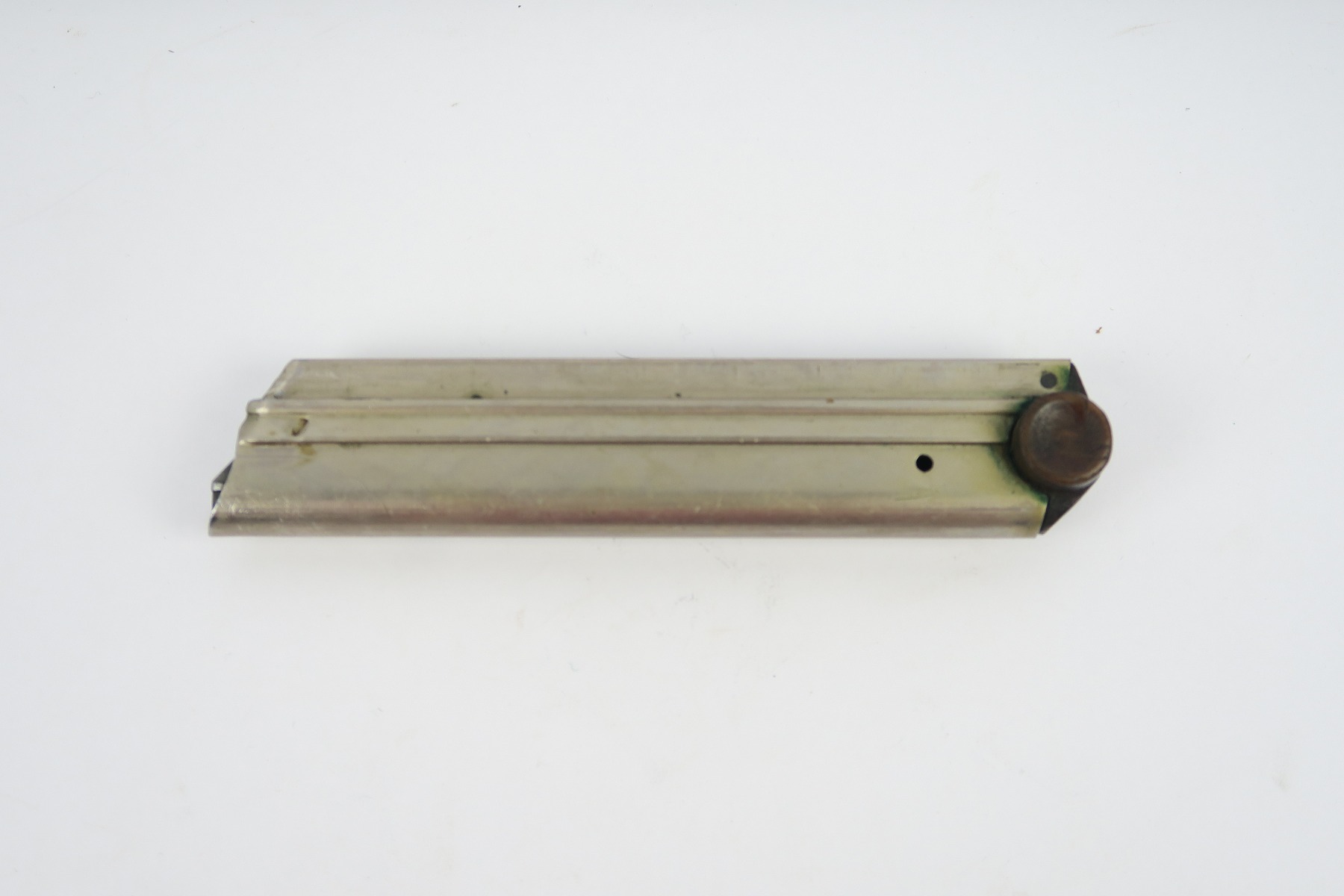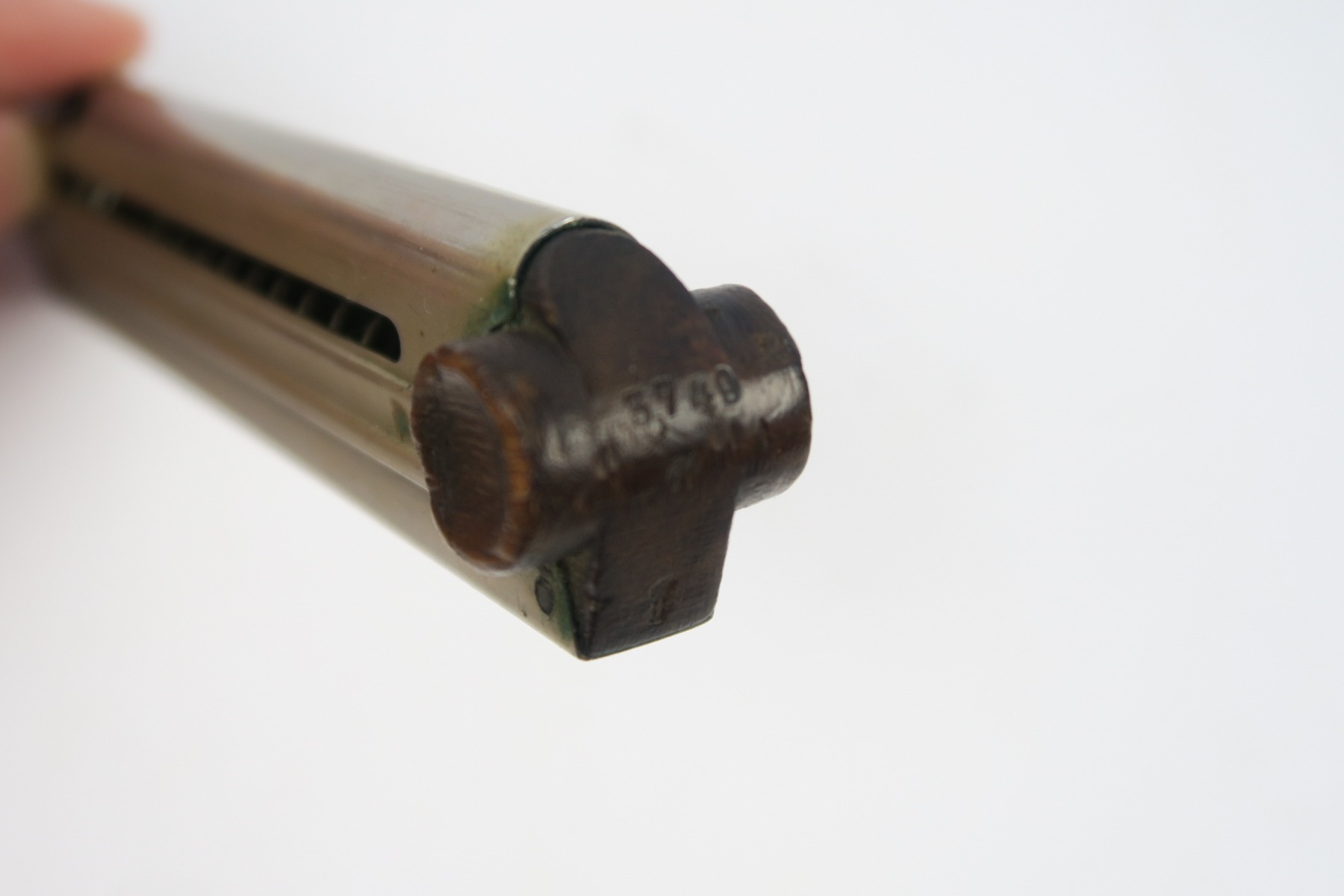 2/15/18 – This is an original WW1 Luger magazine. The magazine has a wood base with an Erfurt proof stamp (crown and gothic letter). The magazine base is also serial numbered 3749 n. The right side of the magazine base “ear” has some light wear / minor chips. See photos. The magazine frame is in excellent condition and the spring is excellent. Guaranteed original.
