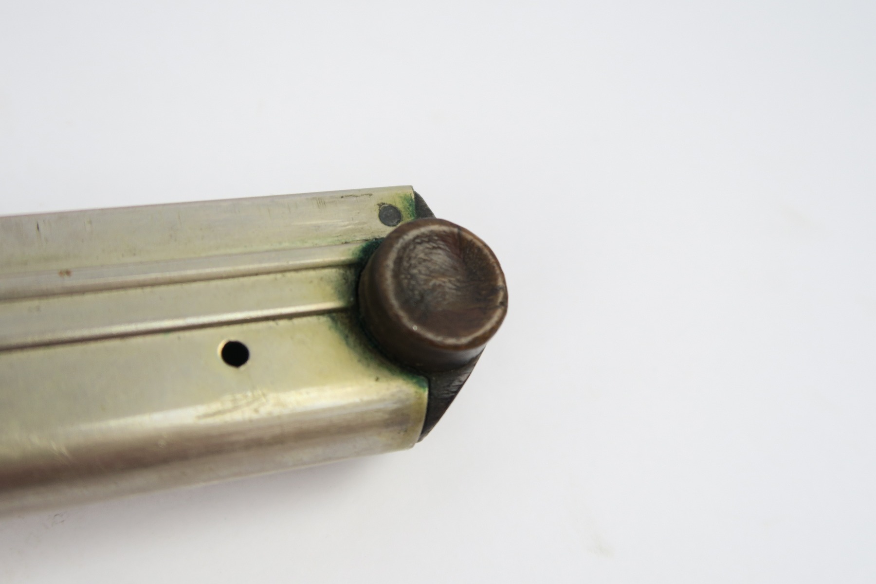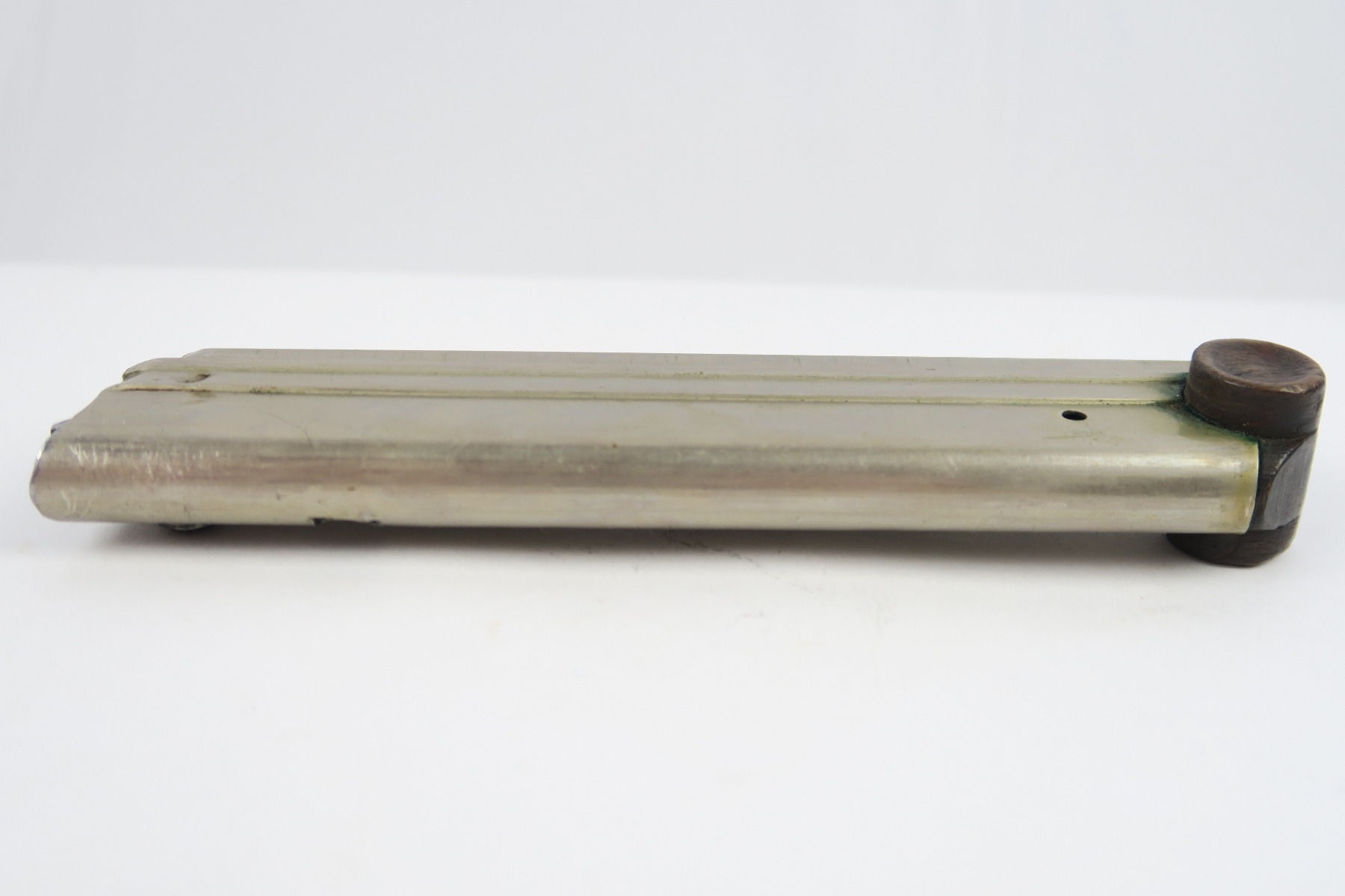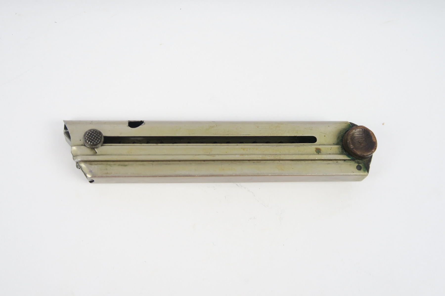 2/15/18 – This is an original WW1 Luger magazine. The magazine has a wood base with an Erfurt proof stamp (crown and gothic letter). The magazine base is also serial numbered 3749 n. The right side of the magazine base “ear” has some light wear / minor chips. See photos. The magazine frame is in excellent condition and the spring is excellent. Guaranteed original.
