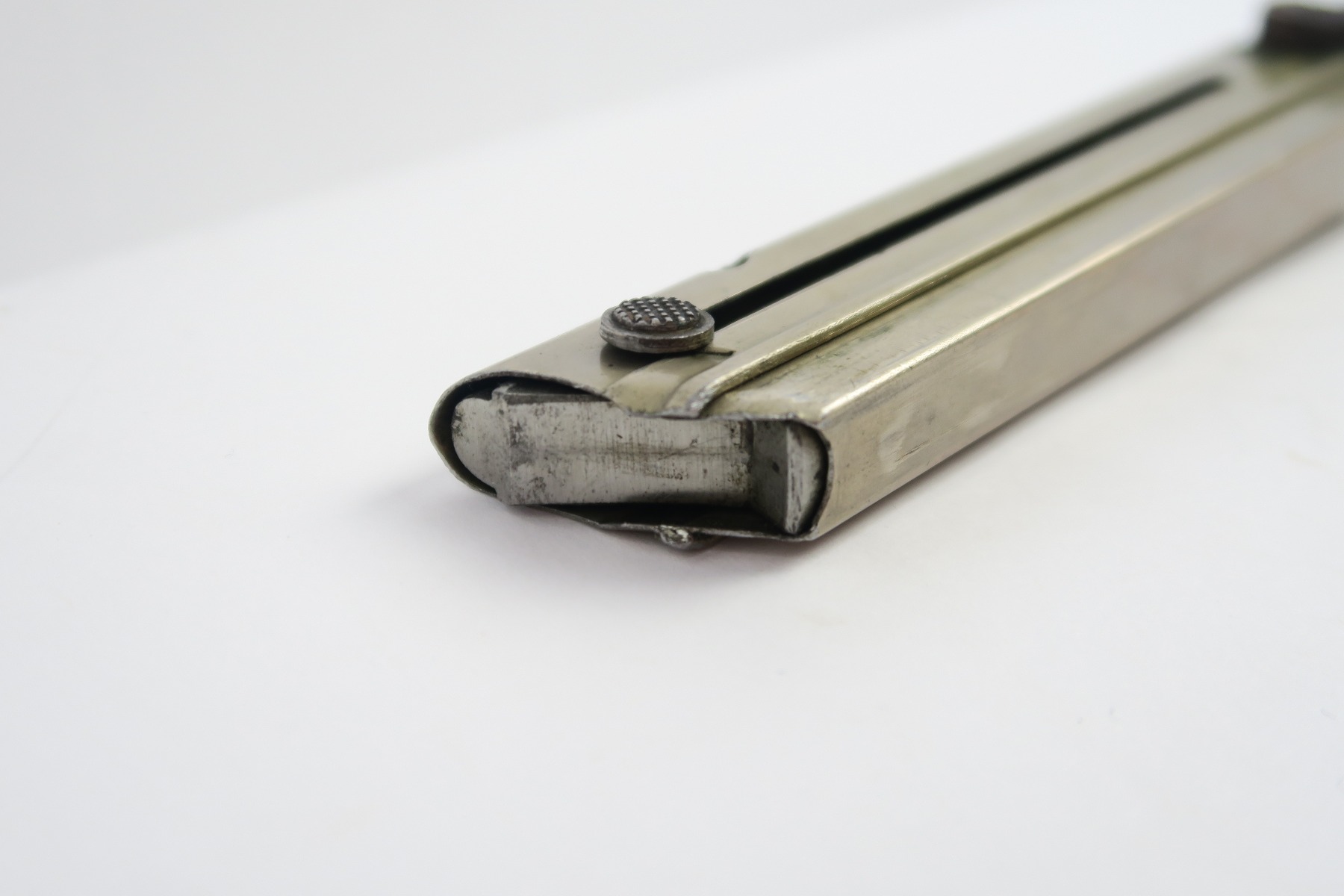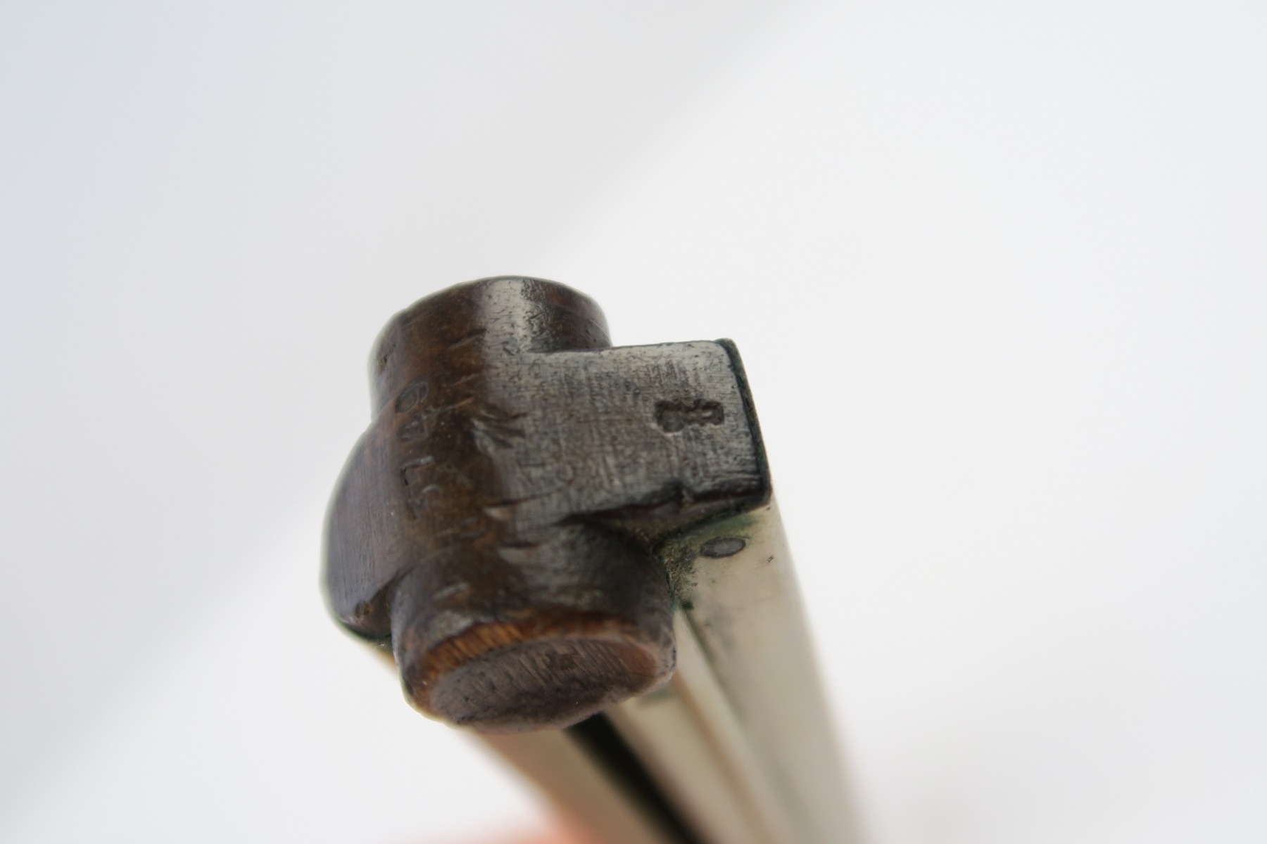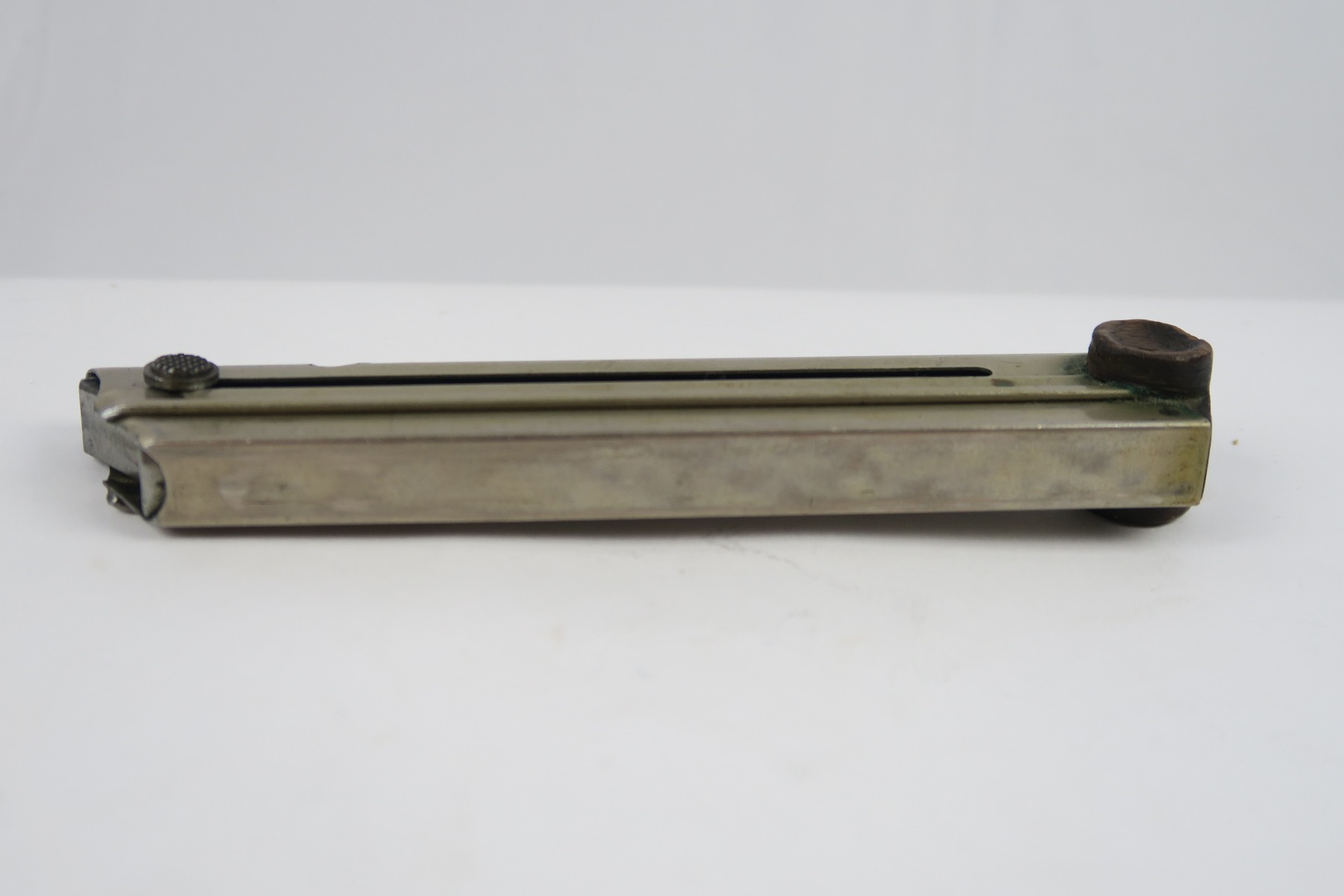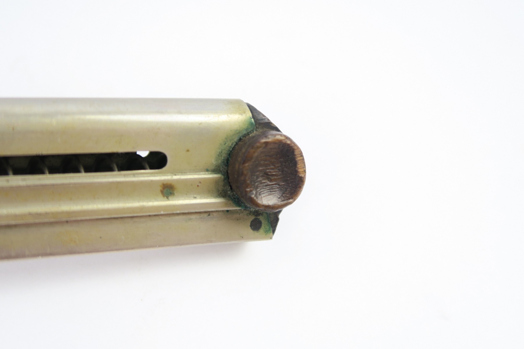 2/15/18 – This is an original WW1 Luger magazine. The magazine has a wood base with an Erfurt proof stamp (crown and gothic letter). The magazine base is also serial numbered 3749 n. The right side of the magazine base “ear” has some light wear / minor chips. See photos. The magazine frame is in excellent condition and the spring is excellent. Guaranteed original.