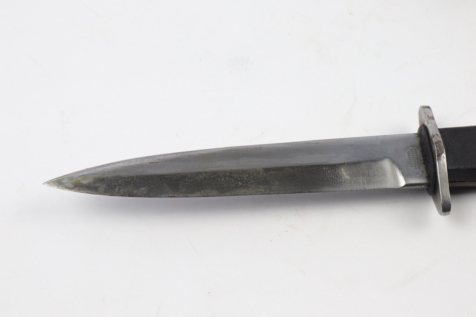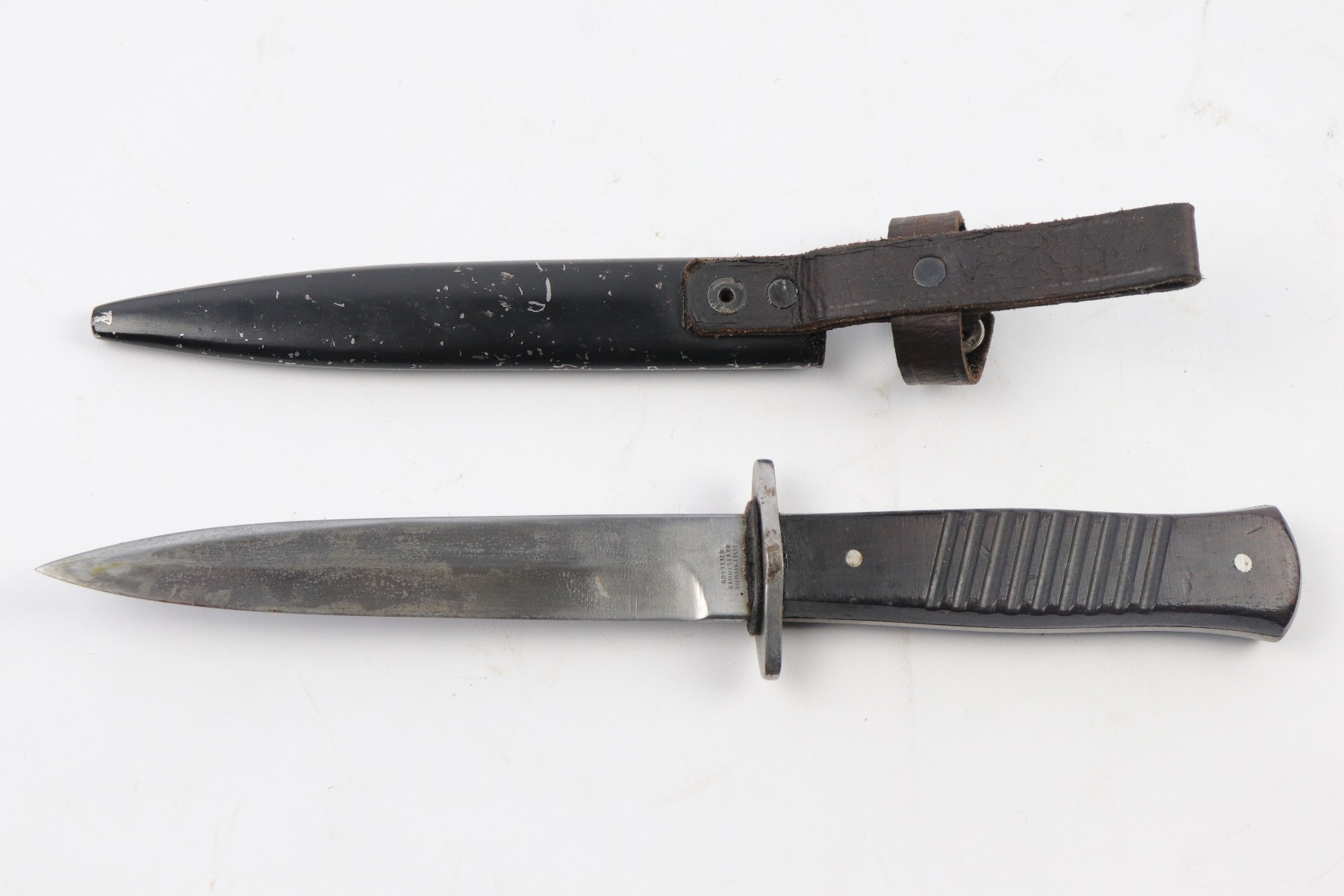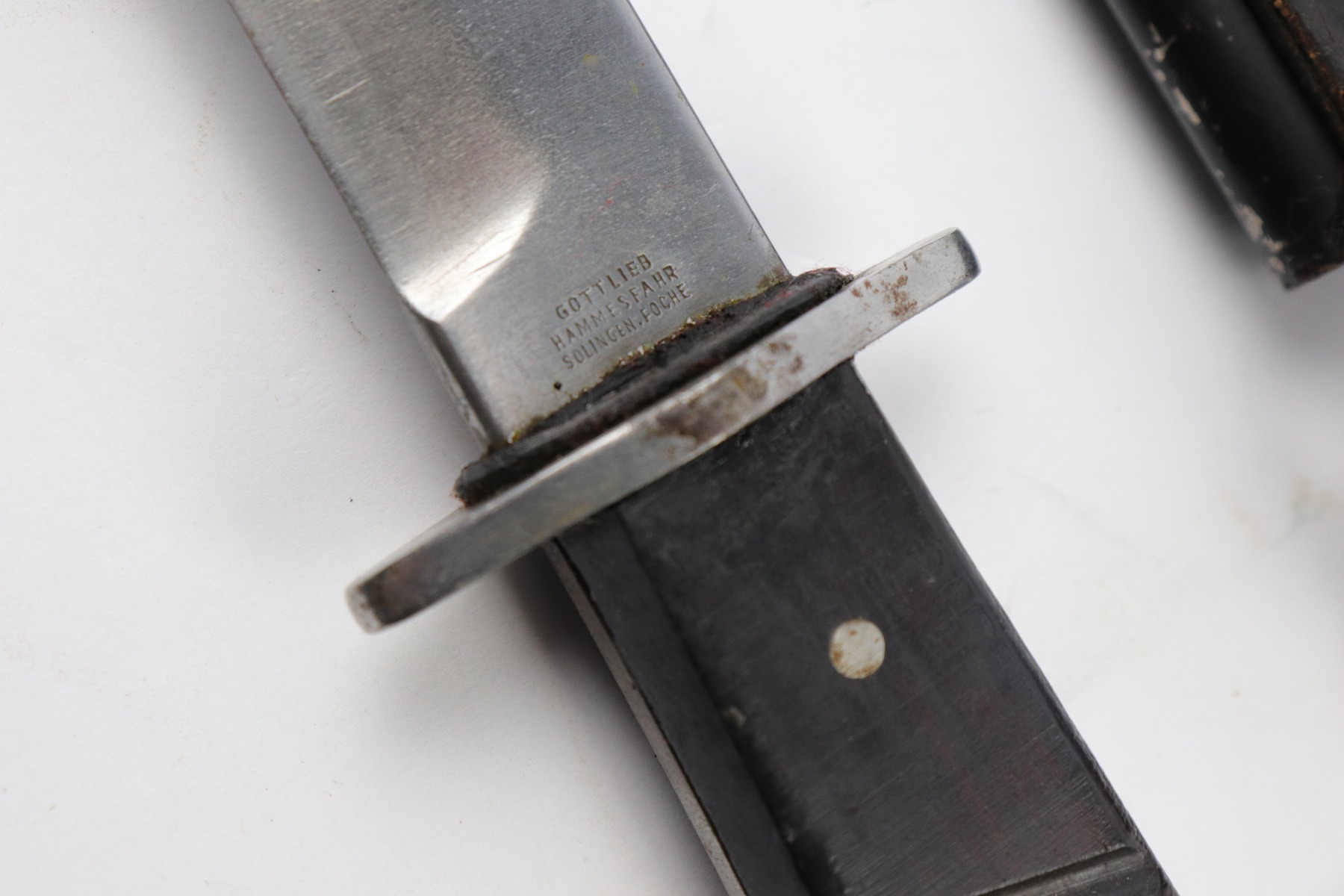 4/5/18 – This is an original WW1 era production German boot knife with an Imperial proof stamp. One side is proof stamped and the reverse side is Gottlieb Hammesfahr Solingen stamped. The blade has some discoloration and spottiness, but overall is in great condition. The wood grips are excellent and completely in tact. The scabbard is black painted and has minor chips but this is normal. No dents on the scabbard. Guaranteed original.