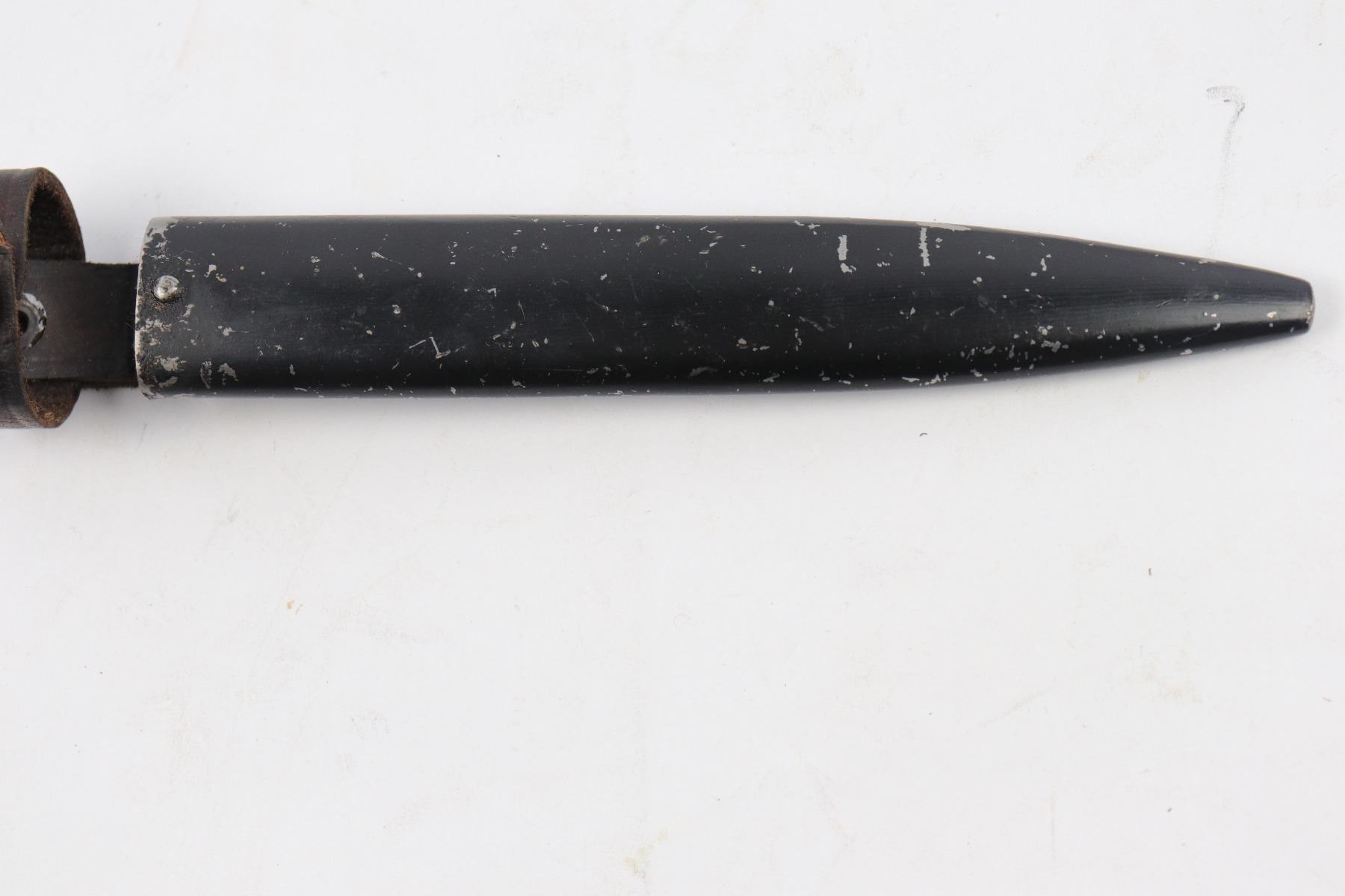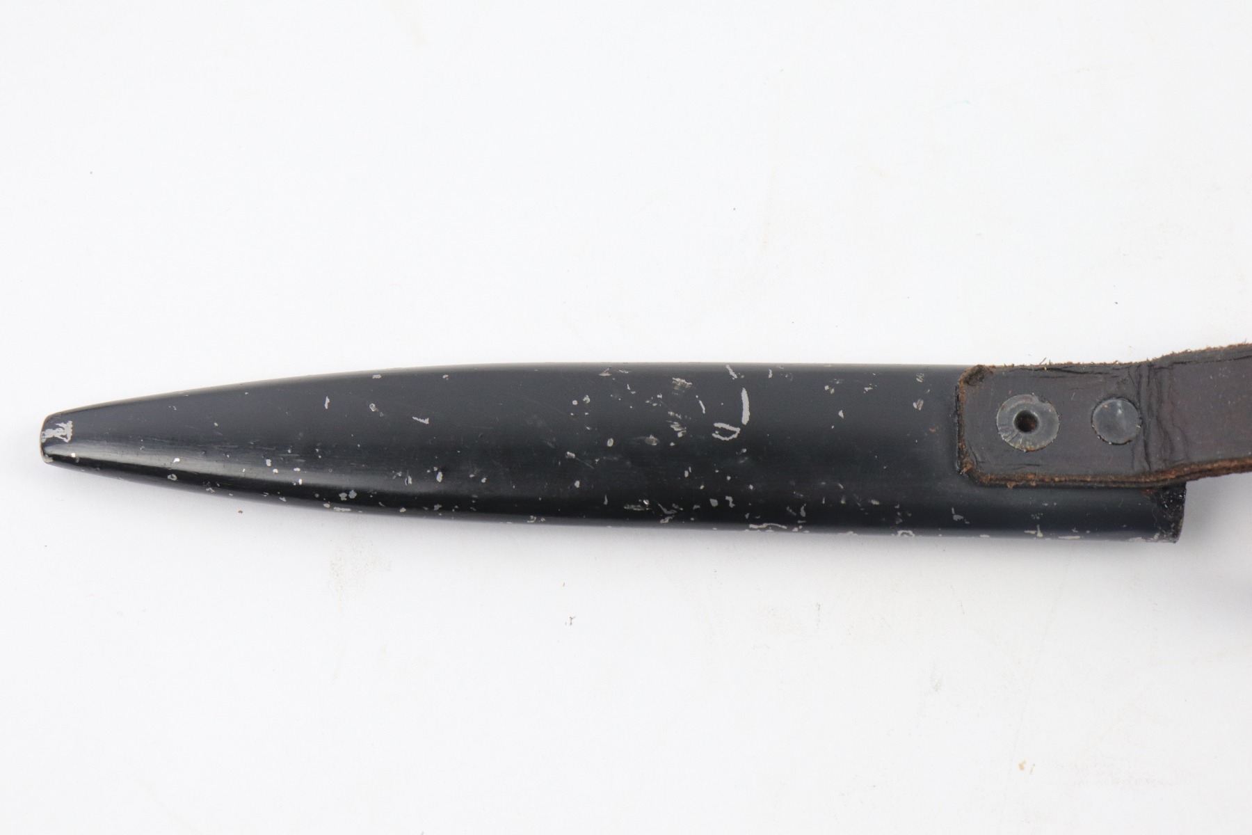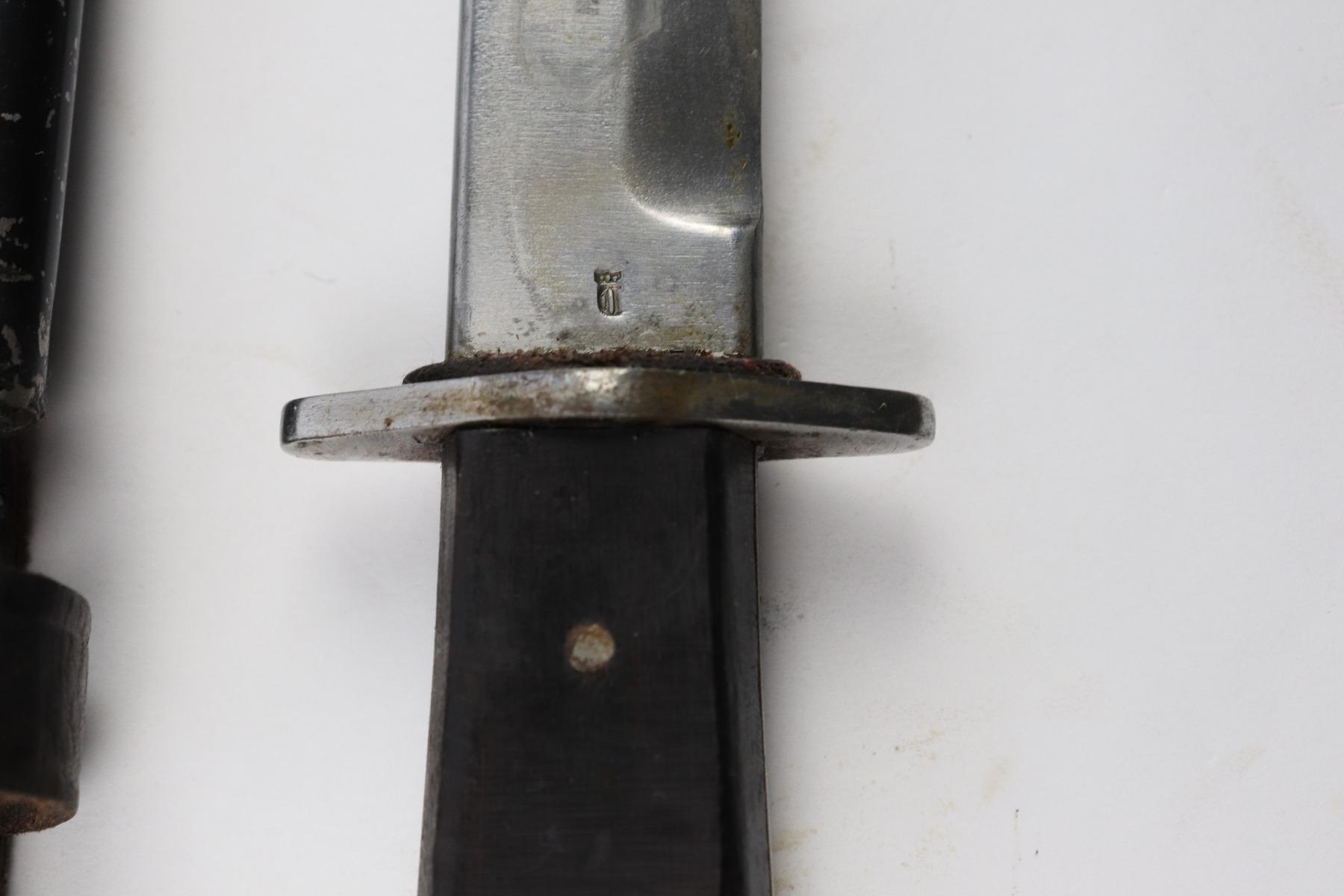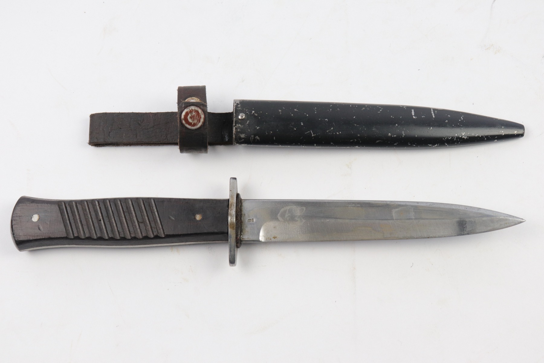 4/5/18 – This is an original WW1 era production German boot knife with an Imperial proof stamp. One side is proof stamped and the reverse side is Gottlieb Hammesfahr Solingen stamped. The blade has some discoloration and spottiness, but overall is in great condition. The wood grips are excellent and completely in tact. The scabbard is black painted and has minor chips but this is normal. No dents on the scabbard. Guaranteed original.