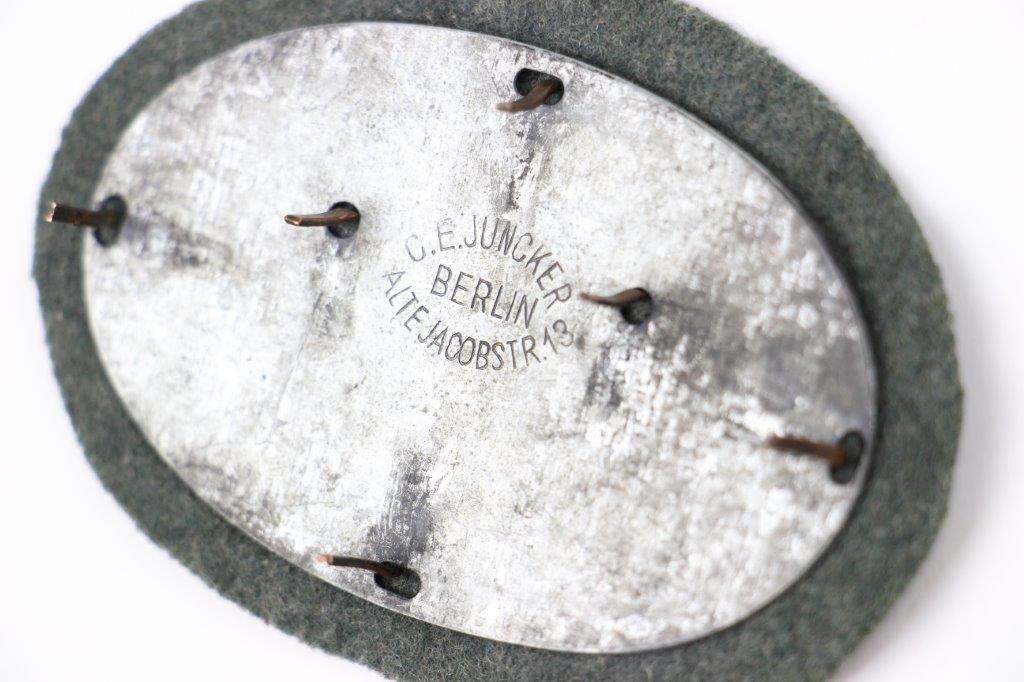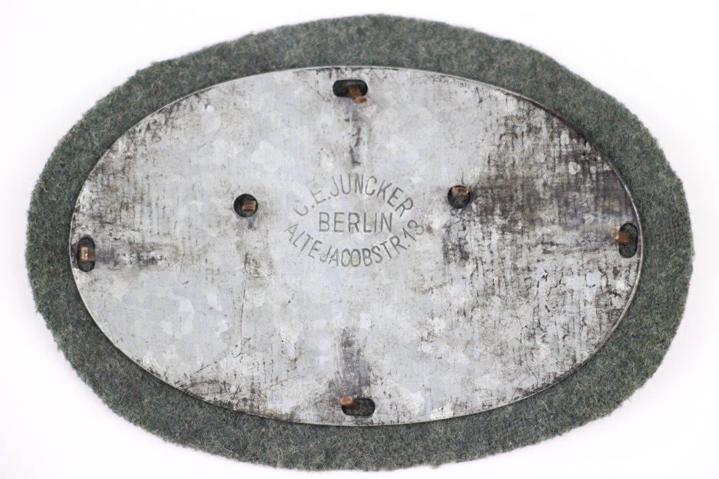 5/2/24 – This is an original WW1 German Machine Gunner’s Uniform Badge. These are rare and hard to find this well-marked. The badge is in great condition (excellent, considering its’ age). There’s natural patina throughout the exterior metal, and is mounted on field green-gray wool. The metal portions are correctly magnetic, and the reverse / holding plate is stamped by C.E. Juncker. Measures about 3.5 inches wide overall (including the wool border).