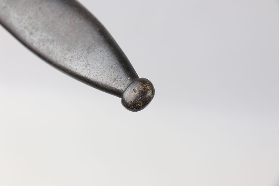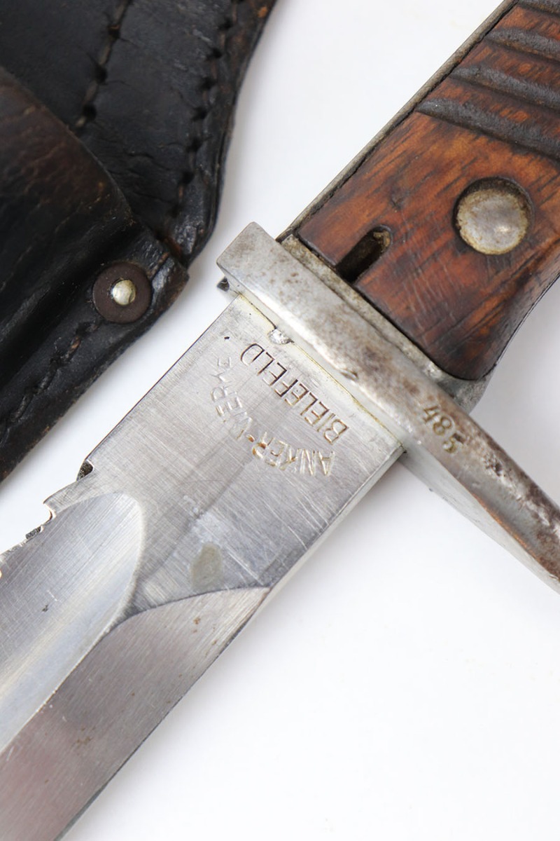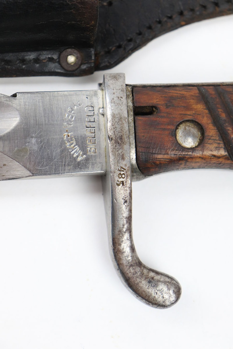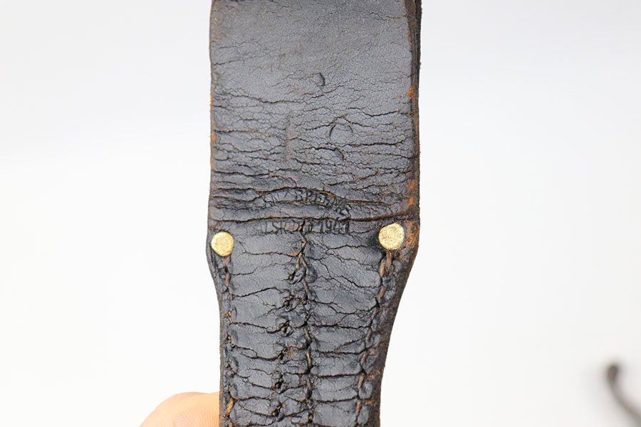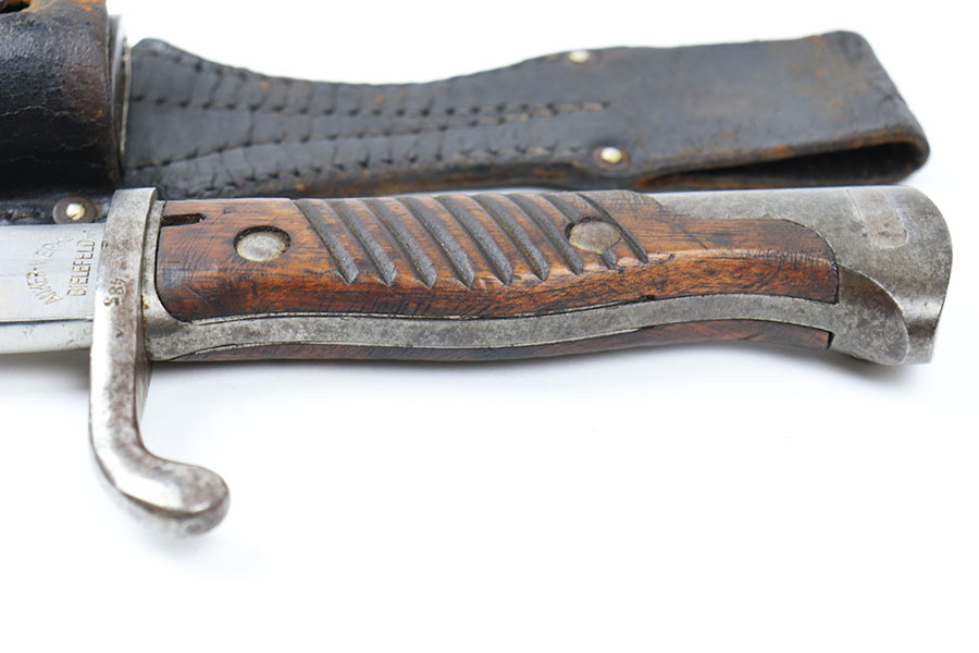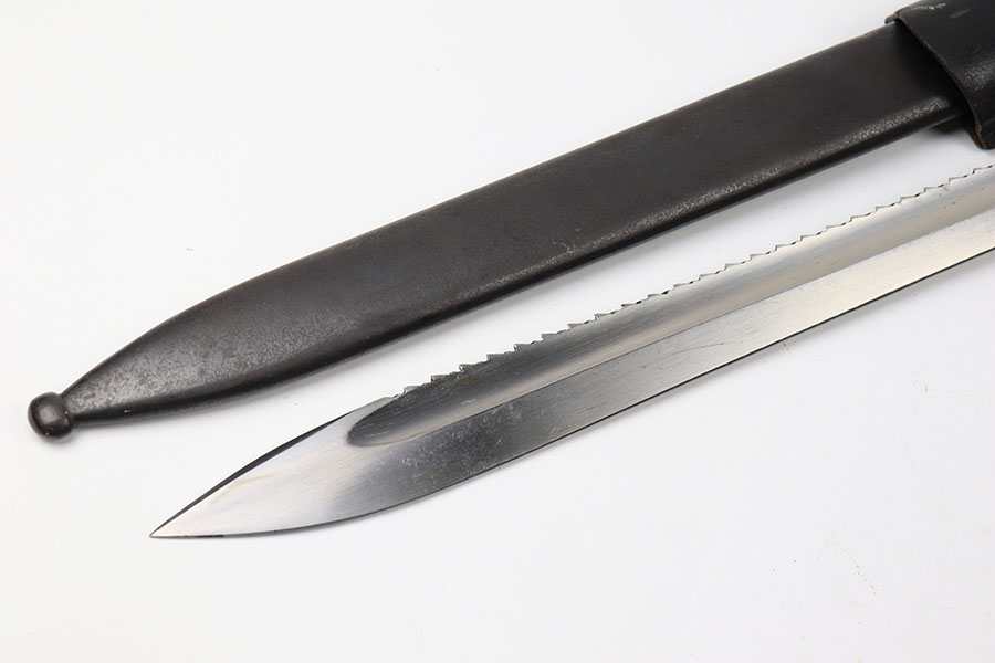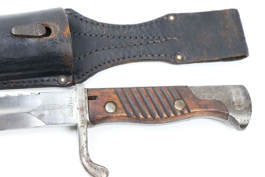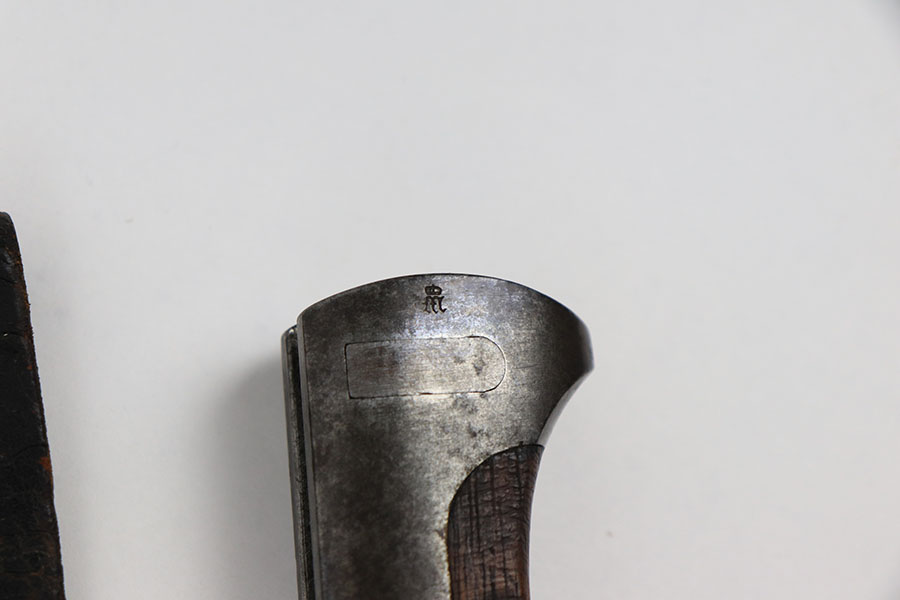 8/20/21 – This is a WW1 production M1898 Gewehr Sawback Bayonet. The bayonet is in great overall condition with a very nice, clean blade. The blade is maker stamped on one side. The hand guard is numbered “485” and has some mild patina throughout. The grips have no cracks or chips. The pommel is proof stamped as shown. The scabbard is covered with a light surface patina amidst the blued finish. No major dents or issues. The leather frog appears to be WW2 era, as it’s 1941 dated. A very nice piece overall.