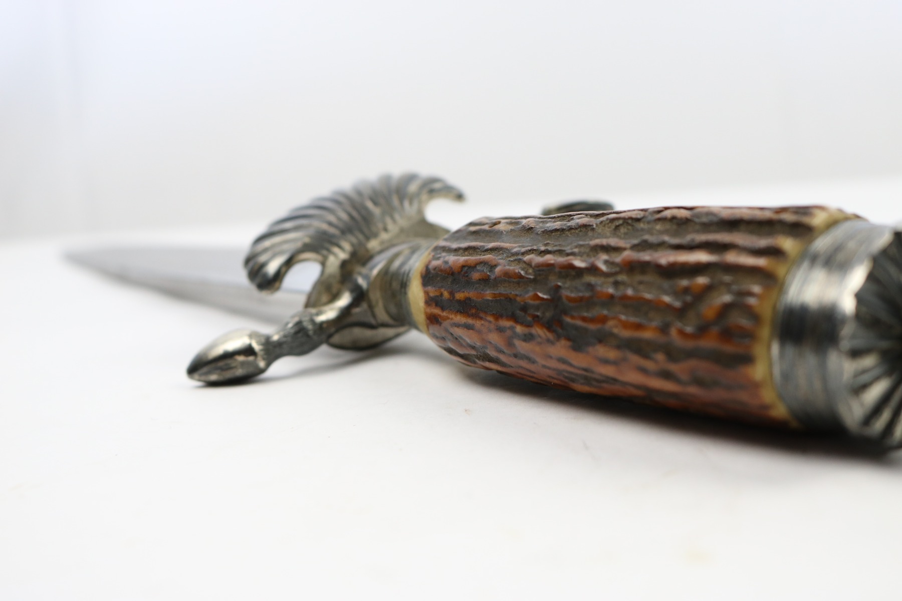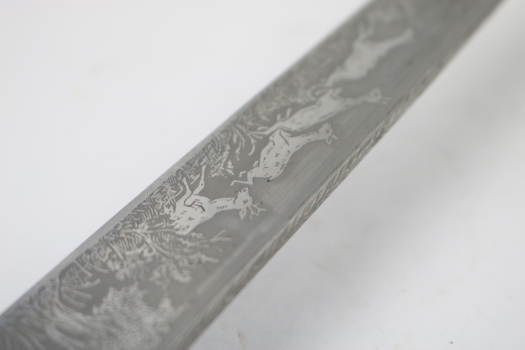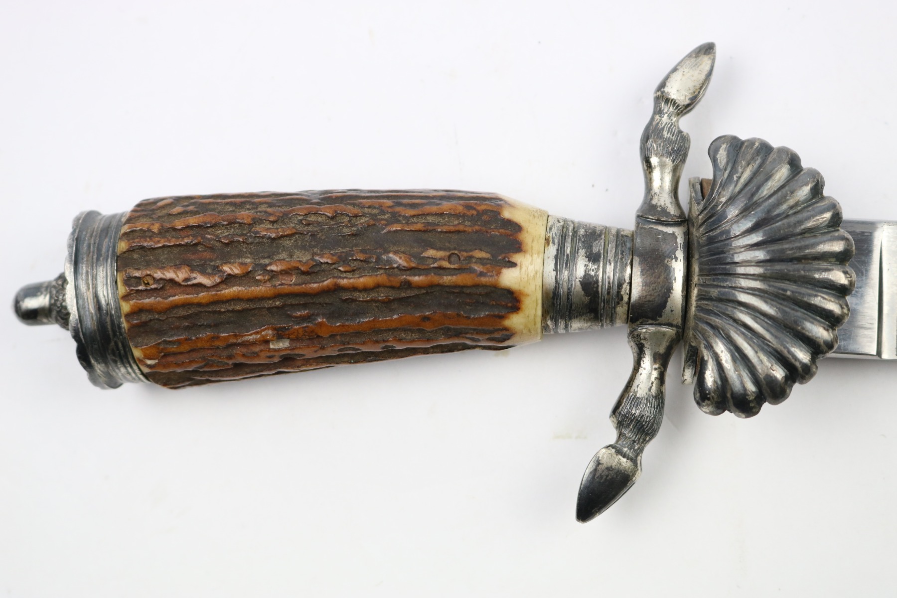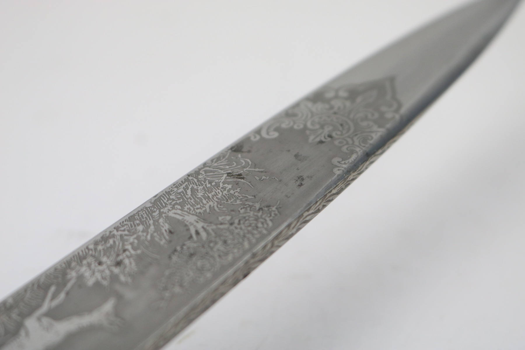 6/21/18 – This is an original WW1 era production German Hunting Association knife. The knife is beautifully engraved with two forestry scenes; one of deer and the other of a fox and dog. The spine of the blade has a leaf-like engraved pattern. The blade is WKC maker stamped and in excellent condition. The edge is not very sharp, but there are no signs of tampering or alteration throughout the blade. The stag handle is excellent. Both the pommel and hand guard show normal dark patina. The leather scabbard stop is excellent and original. The scabbard has normal patina and finish wear but there’s not rust or pitting, and the stretched leather body of the scabbard is excellent and in tact. Beautiful craftsmanship and quality. These are very hard to find in this condition. Guaranteed original and authentic.