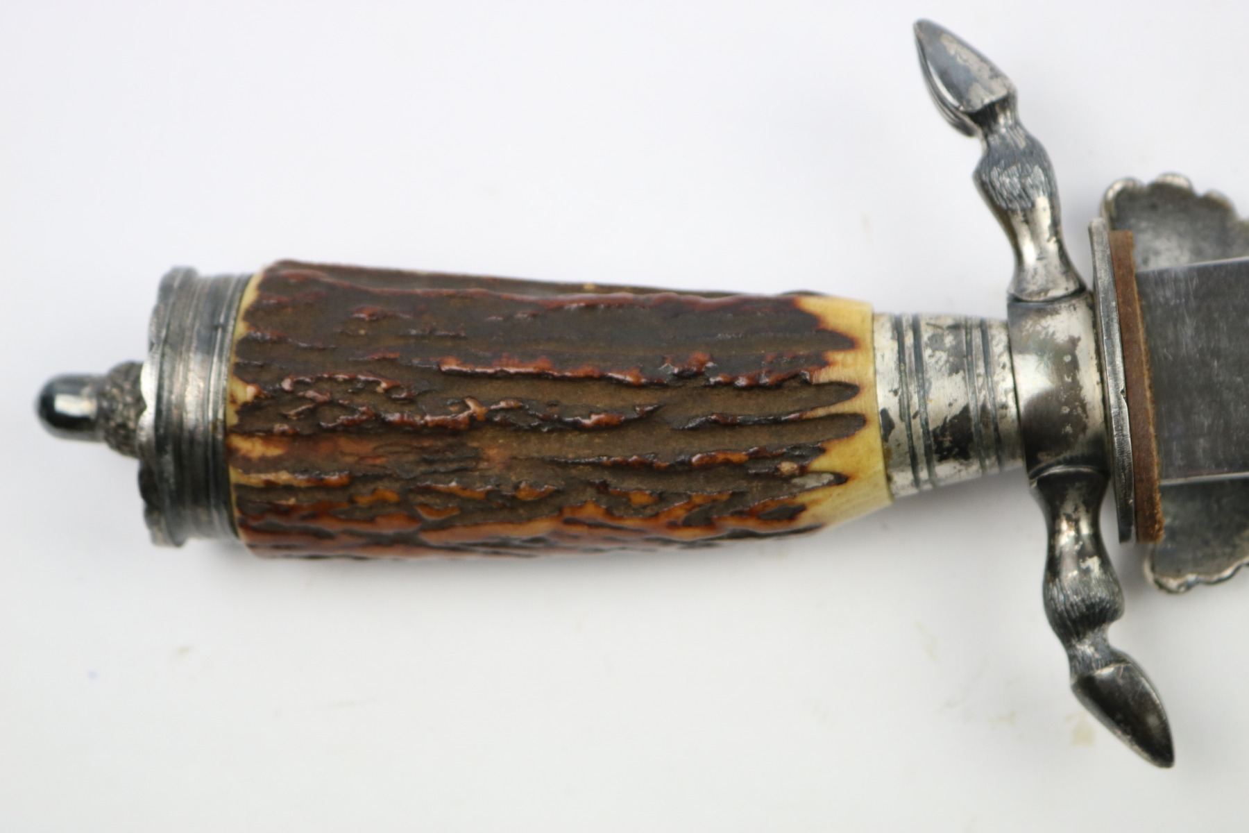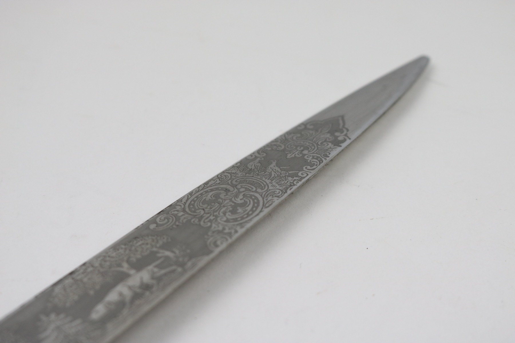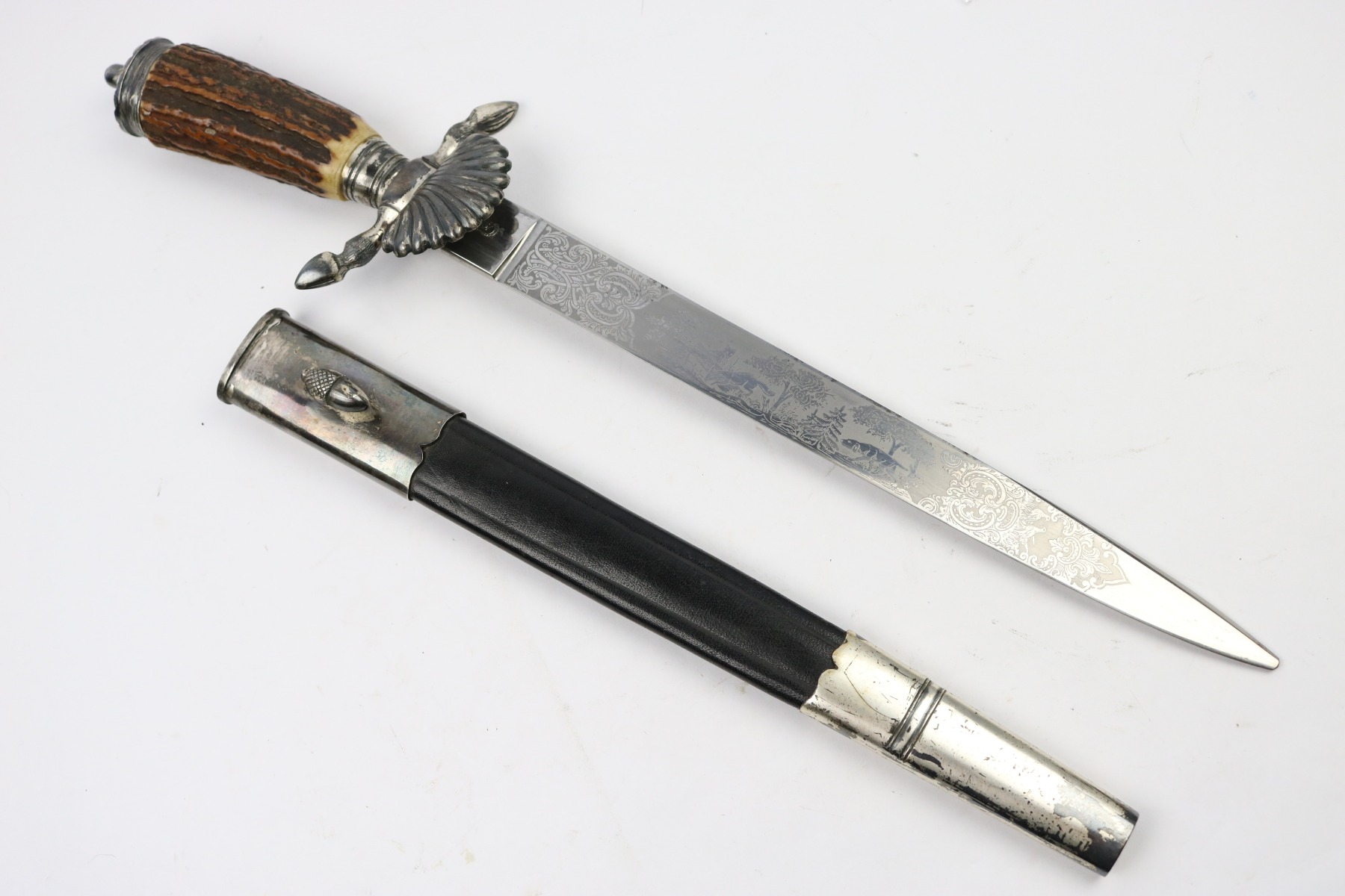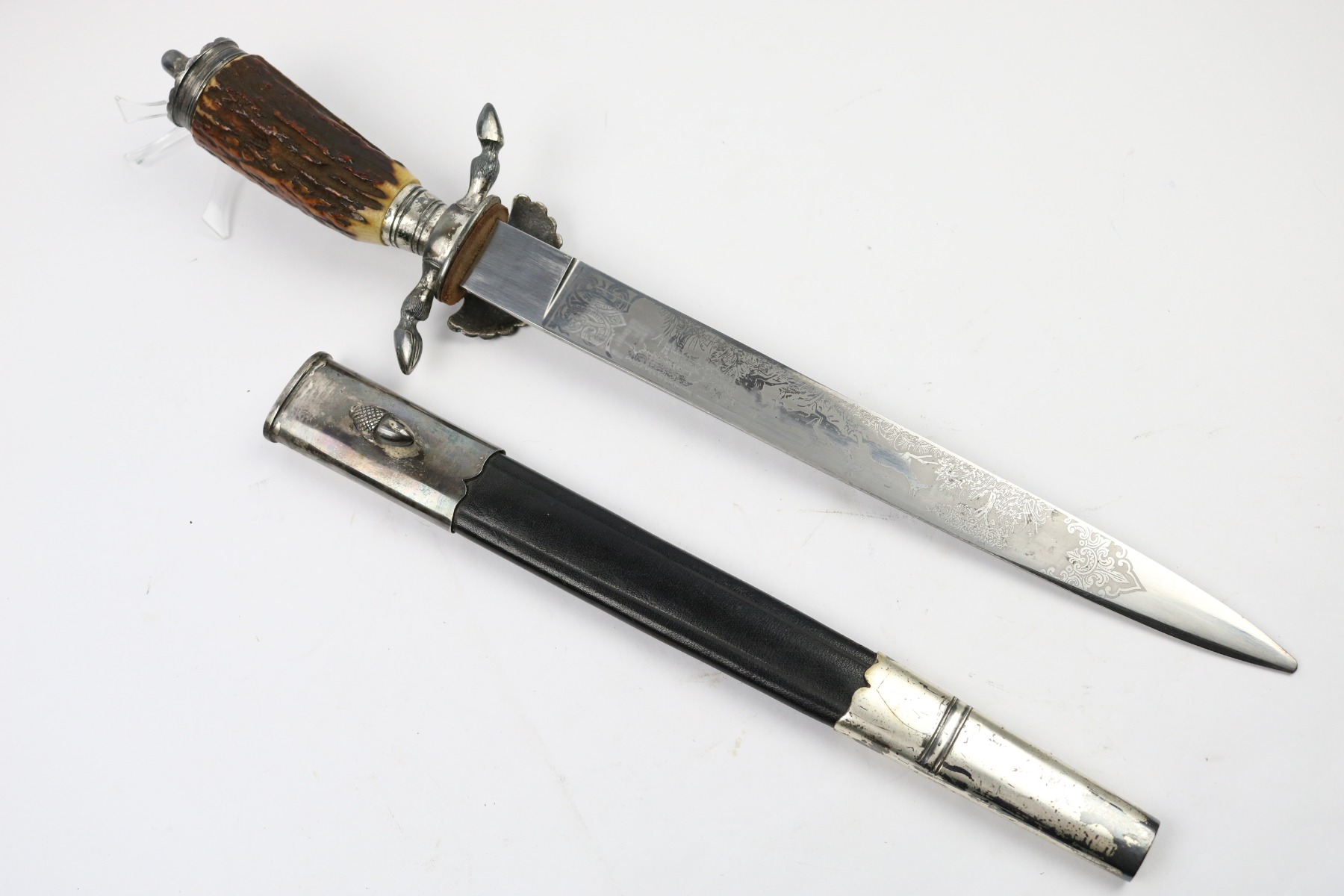 6/21/18 – This is an original WW1 era production German Hunting Association knife. The knife is beautifully engraved with two forestry scenes; one of deer and the other of a fox and dog. The spine of the blade has a leaf-like engraved pattern. The blade is WKC maker stamped and in excellent condition. The edge is not very sharp, but there are no signs of tampering or alteration throughout the blade. The stag handle is excellent. Both the pommel and hand guard show normal dark patina. The leather scabbard stop is excellent and original. The scabbard has normal patina and finish wear but there’s not rust or pitting, and the stretched leather body of the scabbard is excellent and in tact. Beautiful craftsmanship and quality. These are very hard to find in this condition. Guaranteed original and authentic.