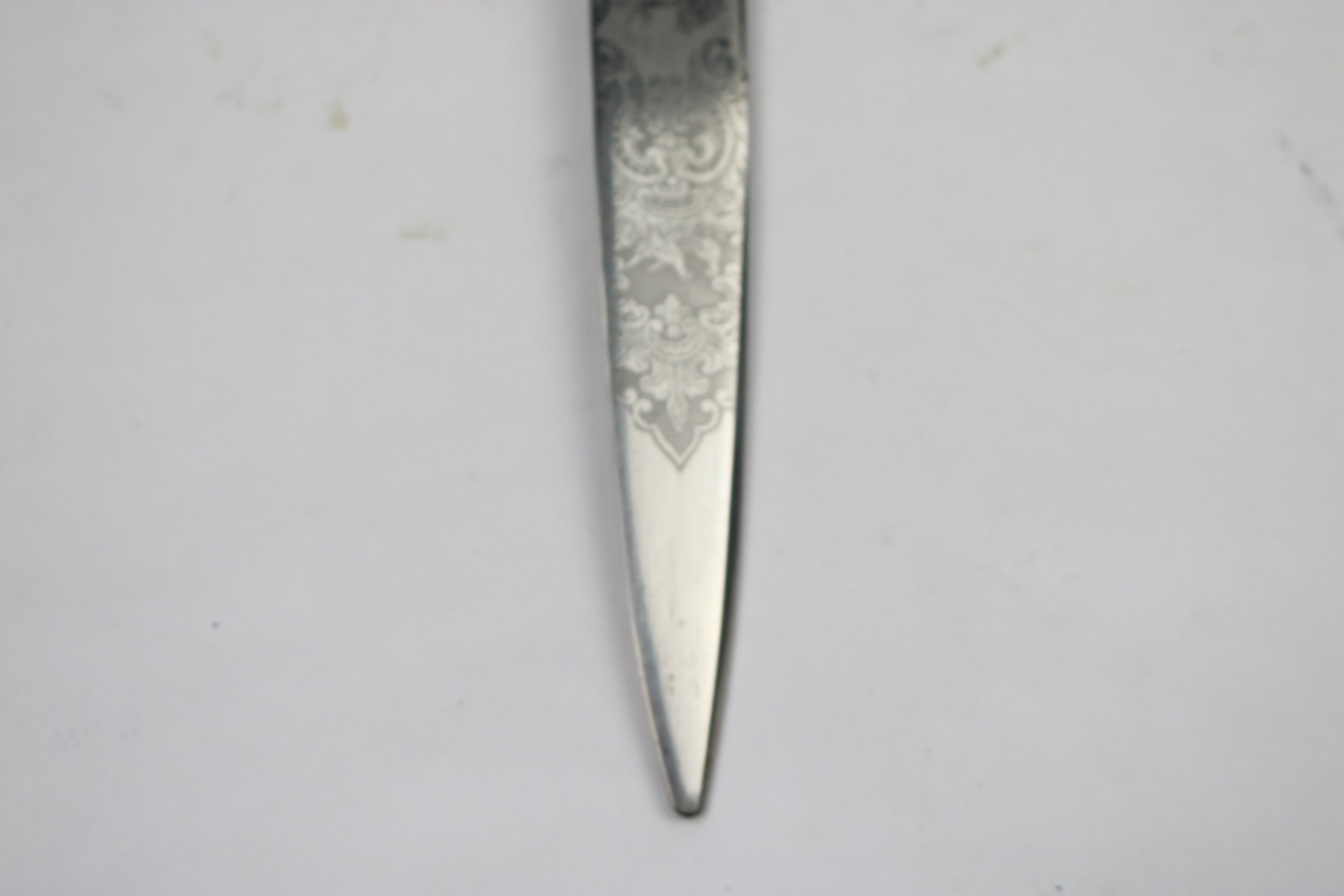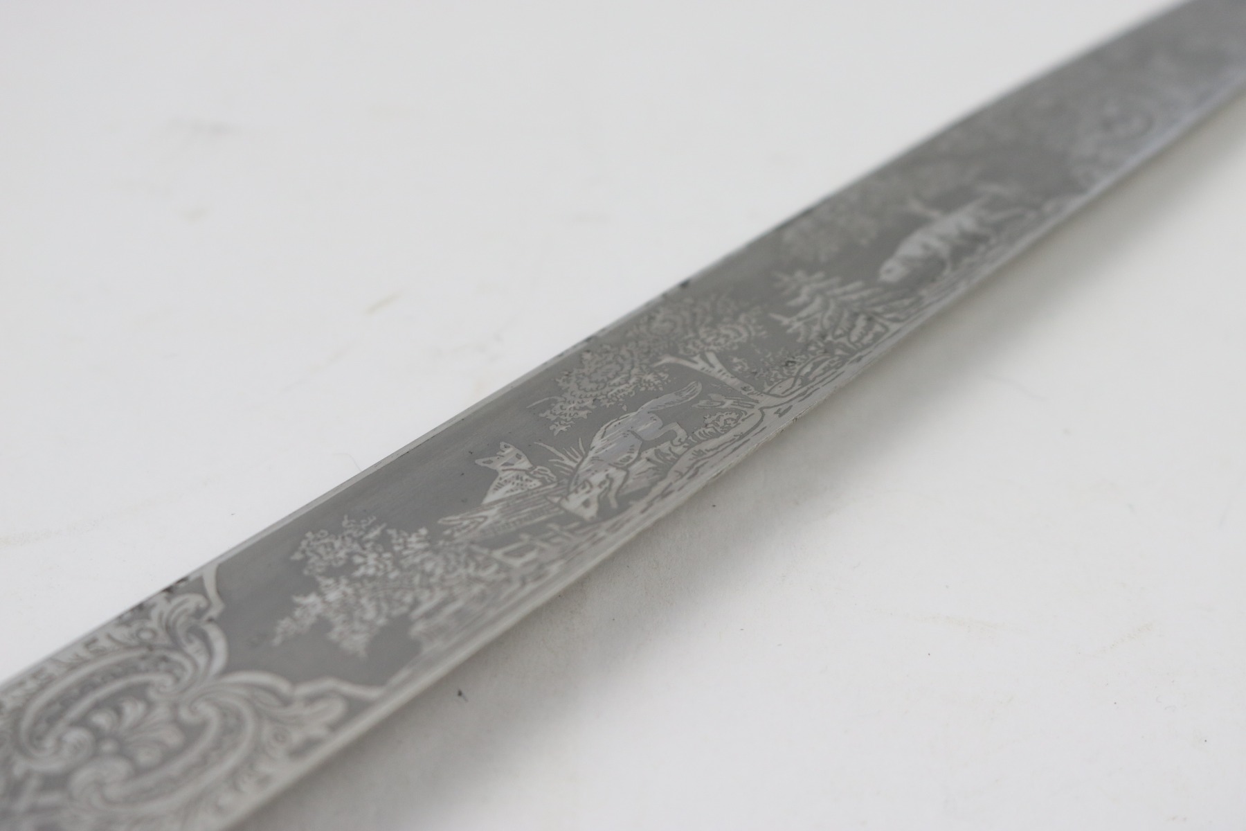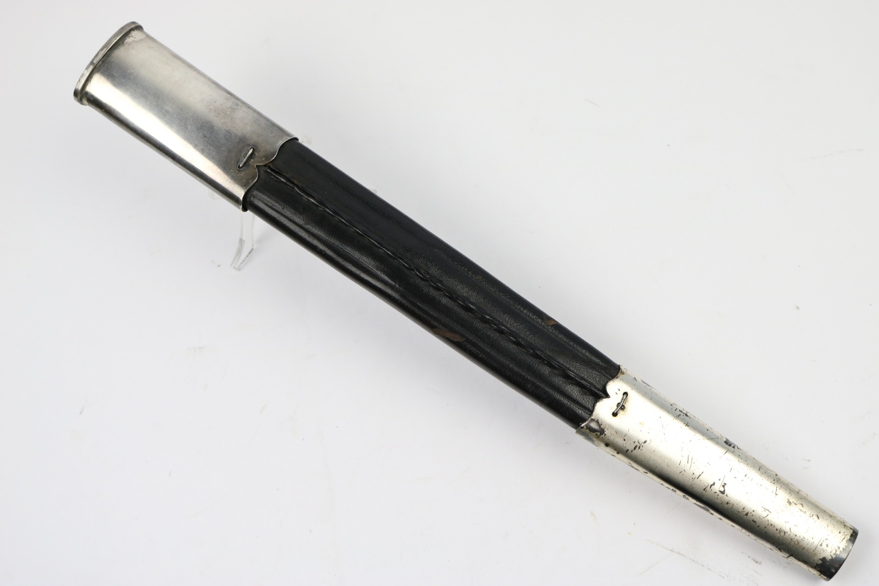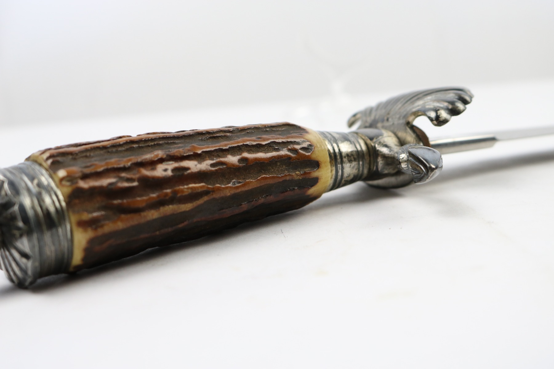 6/21/18 – This is an original WW1 era production German Hunting Association knife. The knife is beautifully engraved with two forestry scenes; one of deer and the other of a fox and dog. The spine of the blade has a leaf-like engraved pattern. The blade is WKC maker stamped and in excellent condition. The edge is not very sharp, but there are no signs of tampering or alteration throughout the blade. The stag handle is excellent. Both the pommel and hand guard show normal dark patina. The leather scabbard stop is excellent and original. The scabbard has normal patina and finish wear but there’s not rust or pitting, and the stretched leather body of the scabbard is excellent and in tact. Beautiful craftsmanship and quality. These are very hard to find in this condition. Guaranteed original and authentic.