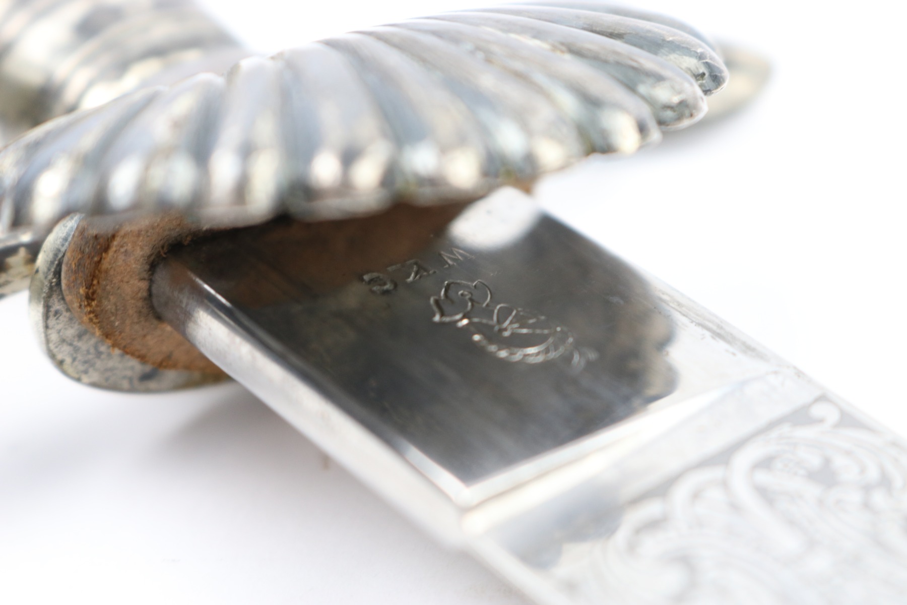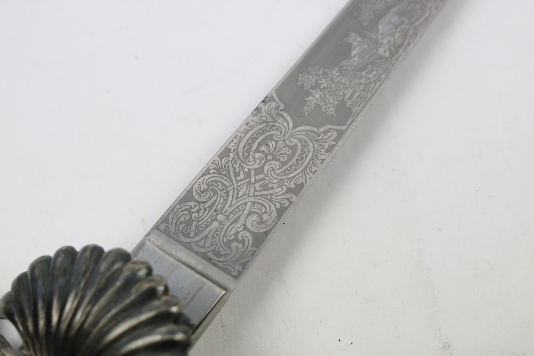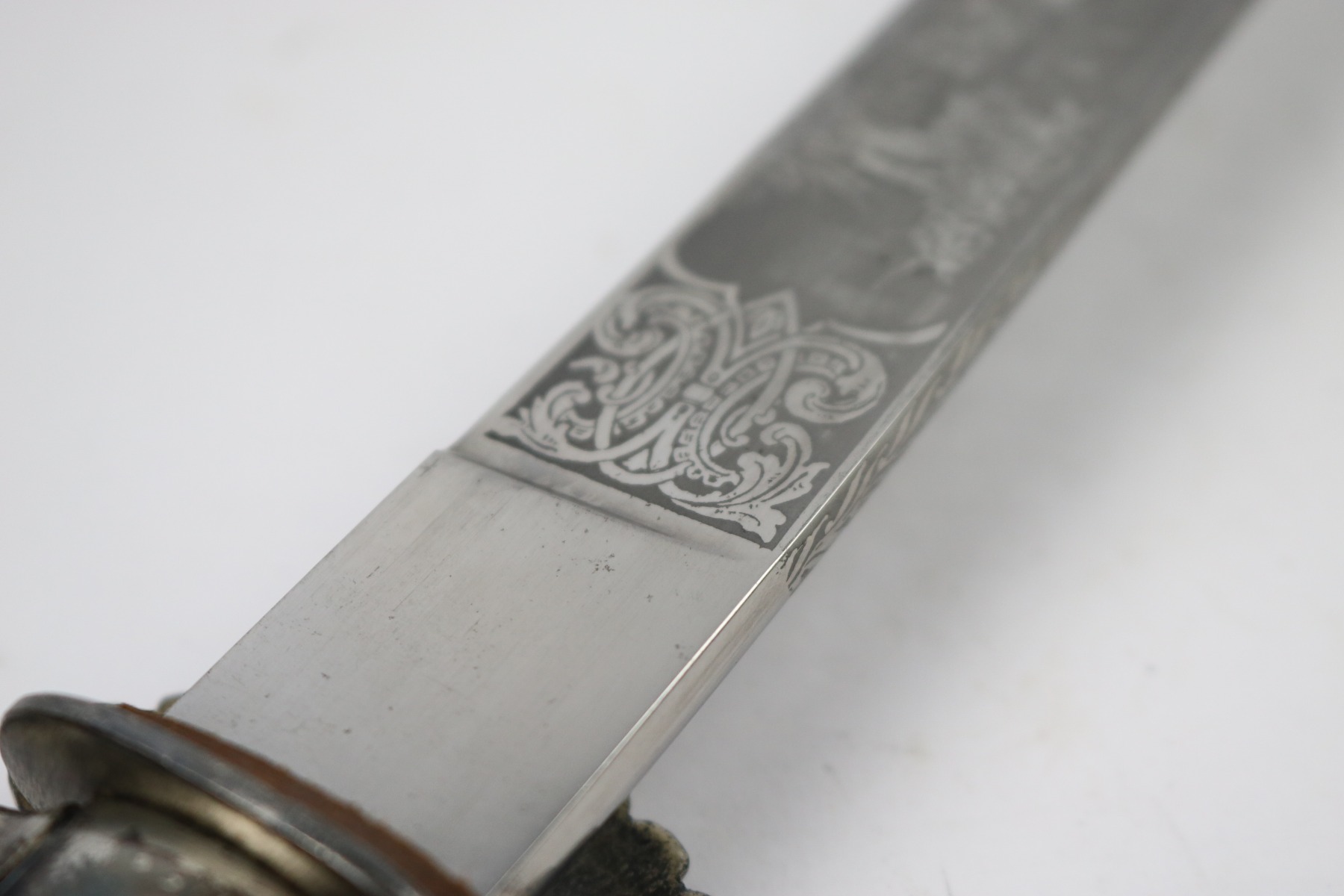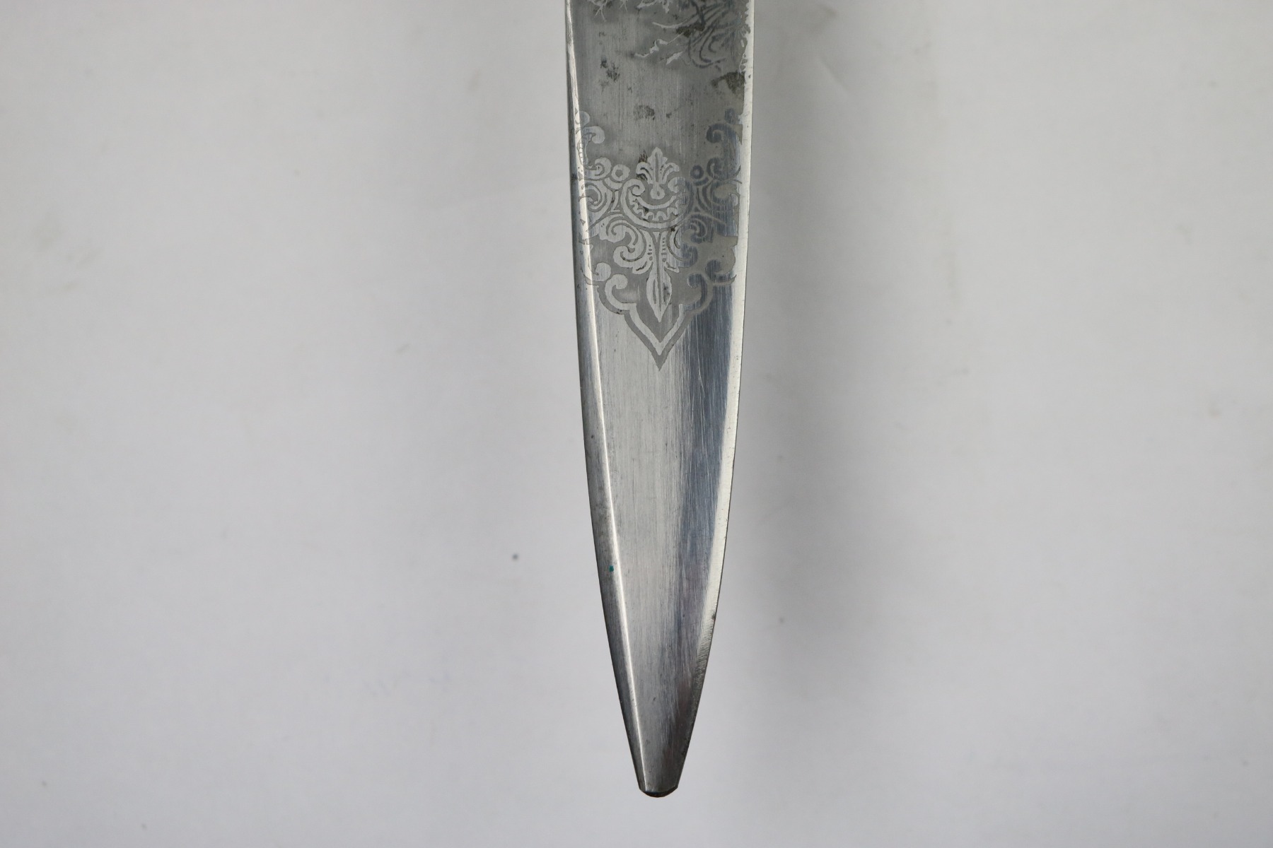 6/21/18 – This is an original WW1 era production German Hunting Association knife. The knife is beautifully engraved with two forestry scenes; one of deer and the other of a fox and dog. The spine of the blade has a leaf-like engraved pattern. The blade is WKC maker stamped and in excellent condition. The edge is not very sharp, but there are no signs of tampering or alteration throughout the blade. The stag handle is excellent. Both the pommel and hand guard show normal dark patina. The leather scabbard stop is excellent and original. The scabbard has normal patina and finish wear but there’s not rust or pitting, and the stretched leather body of the scabbard is excellent and in tact. Beautiful craftsmanship and quality. These are very hard to find in this condition. Guaranteed original and authentic.