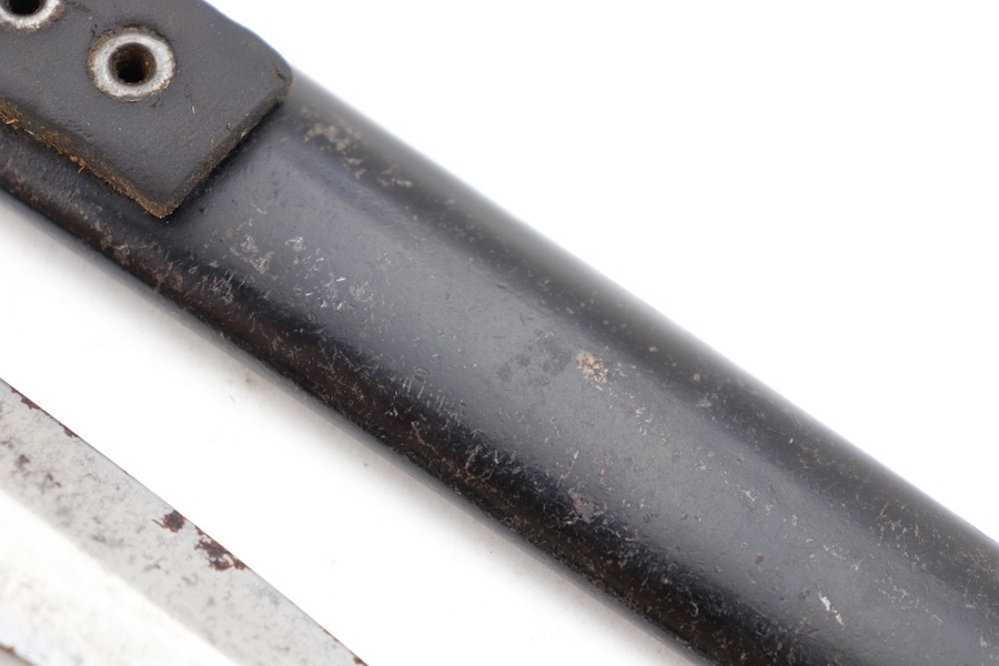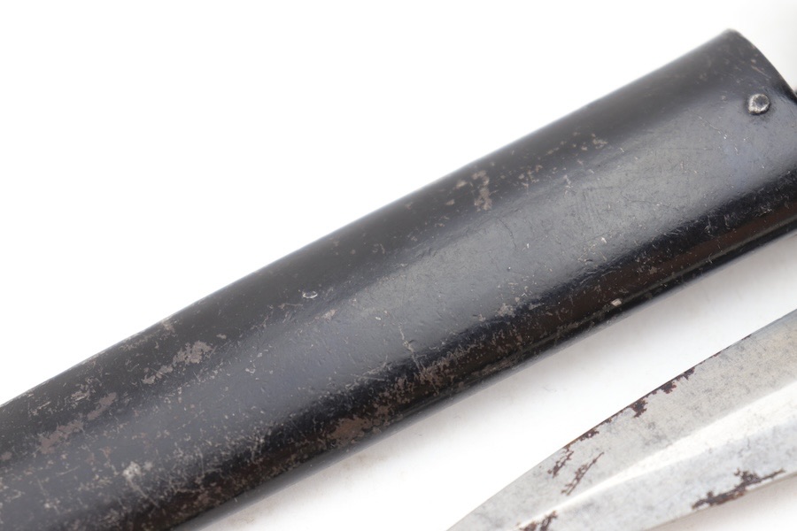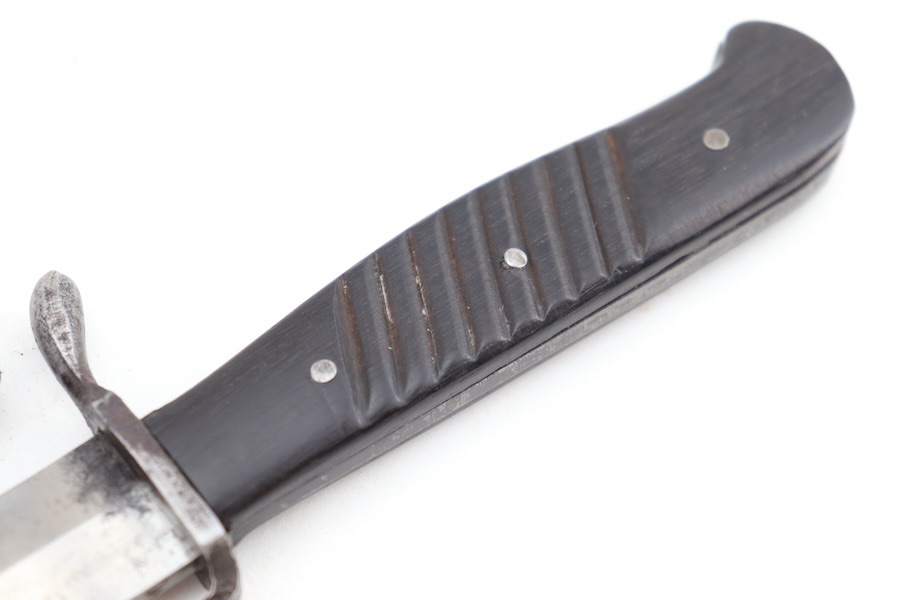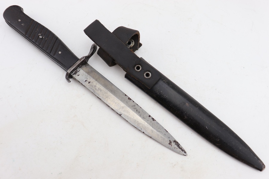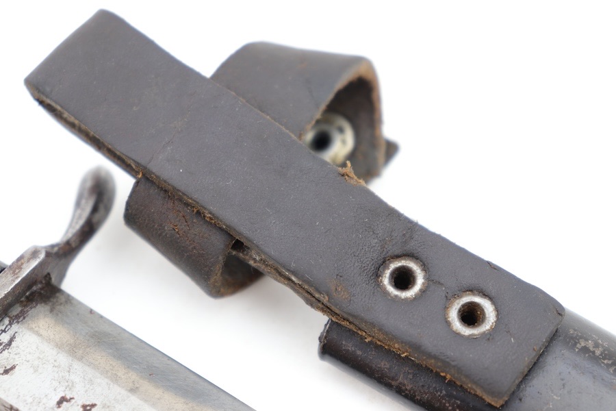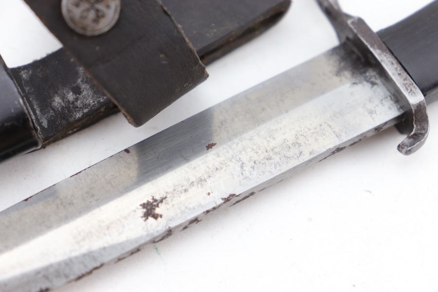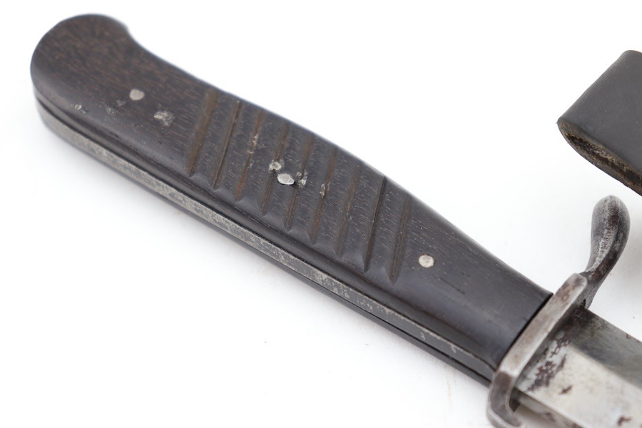8/28/24 – For sale is a great and original condition WW1 Imperial German trench knife is for sale. This knife comes with an original metal scabbard and a fully intact leather belt hanger. The blade has some patches of dark discoloration but with no deep pitting. The edge has a very light amount of post-factory sharpening but is hardly noticeable. The right side wood scale is very slightly pushed away from the tang but does not feel loose when in the hand. There are no maker stamps on the knife or scabbard. Overall a very cool piece of history.