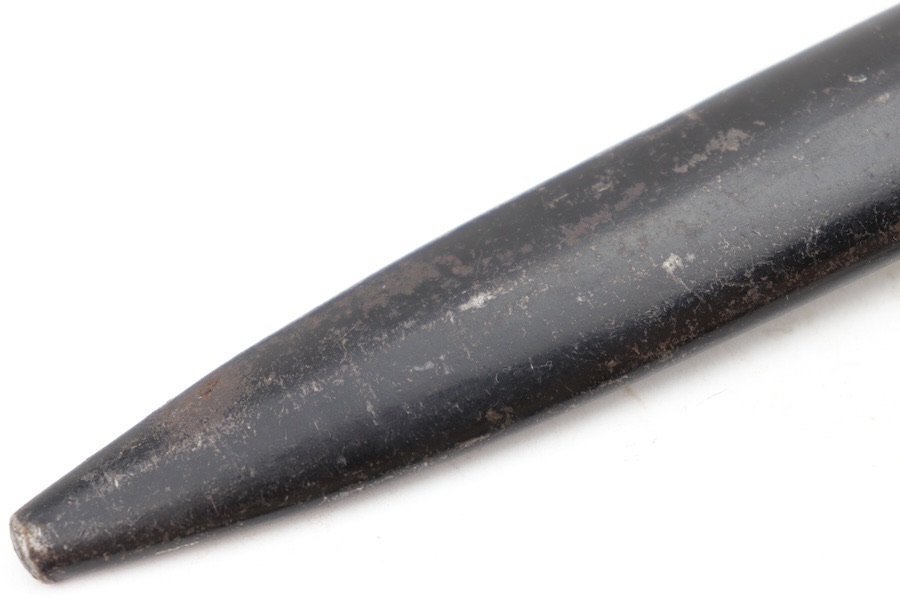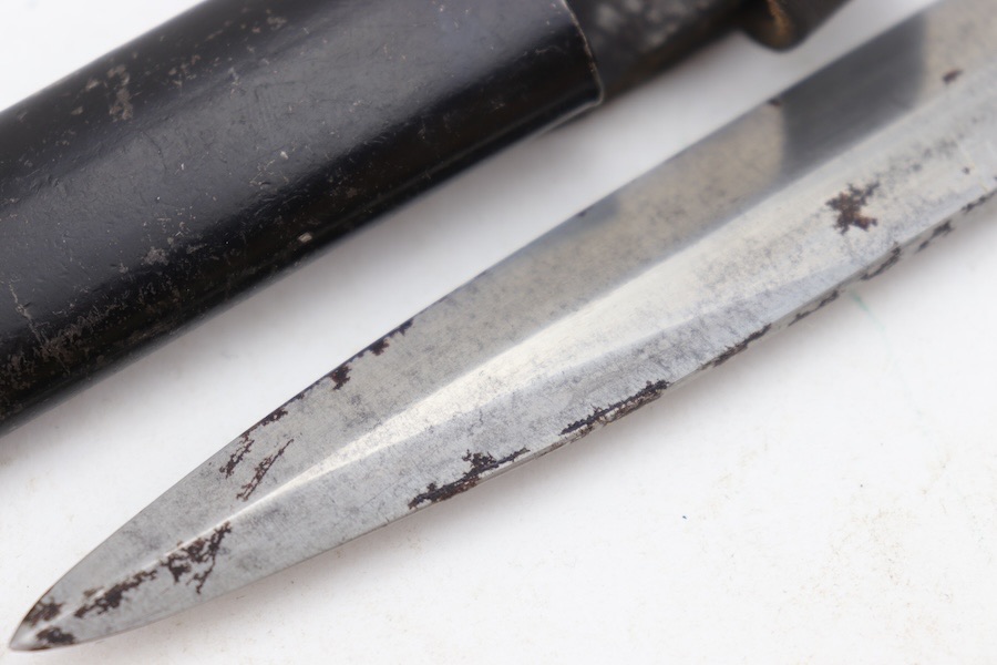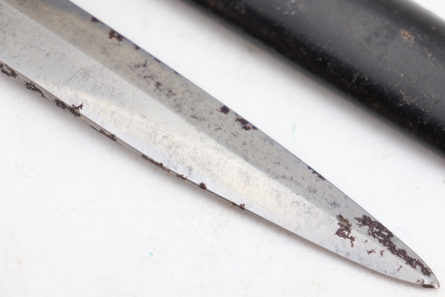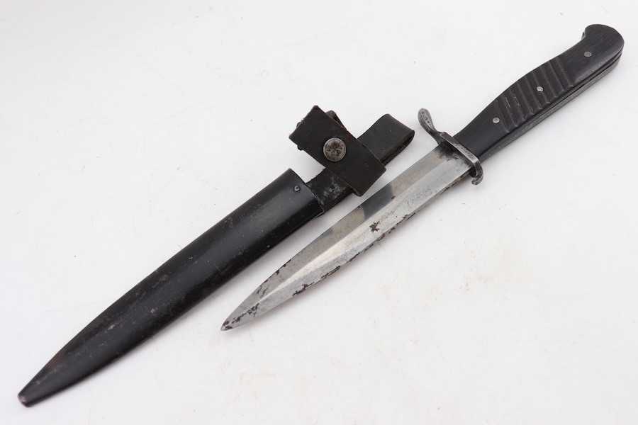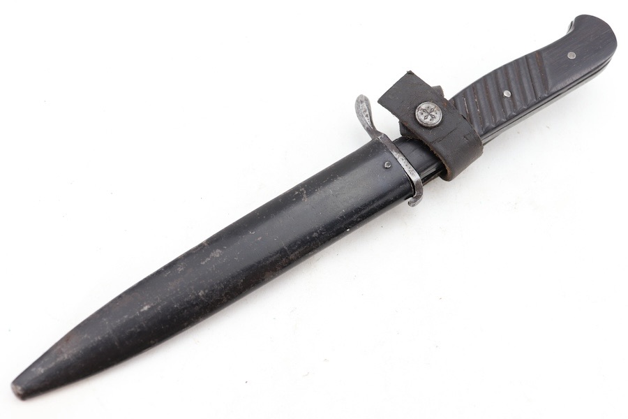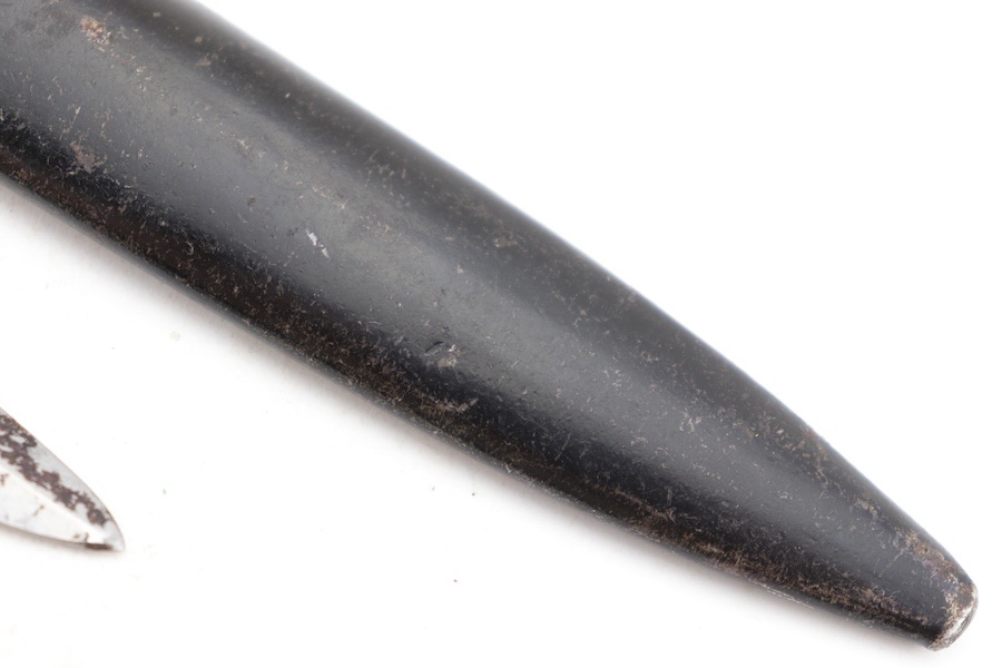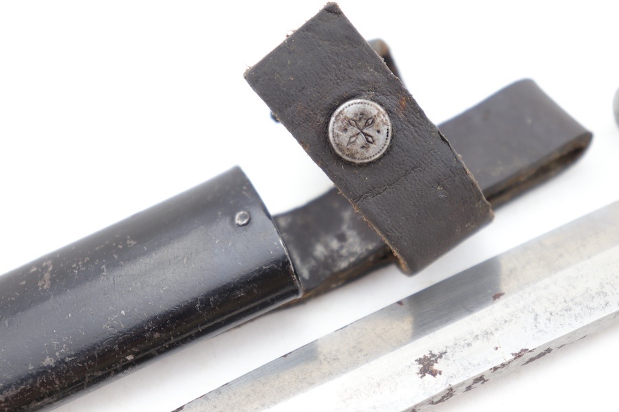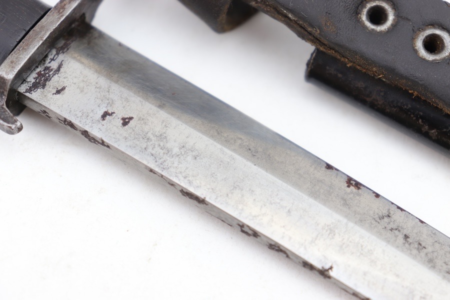 8/28/24 – For sale is a great and original condition WW1 Imperial German trench knife is for sale. This knife comes with an original metal scabbard and a fully intact leather belt hanger. The blade has some patches of dark discoloration but with no deep pitting. The edge has a very light amount of post-factory sharpening but is hardly noticeable. The right side wood scale is very slightly pushed away from the tang but does not feel loose when in the hand. There are no maker stamps on the knife or scabbard. Overall a very cool piece of history.