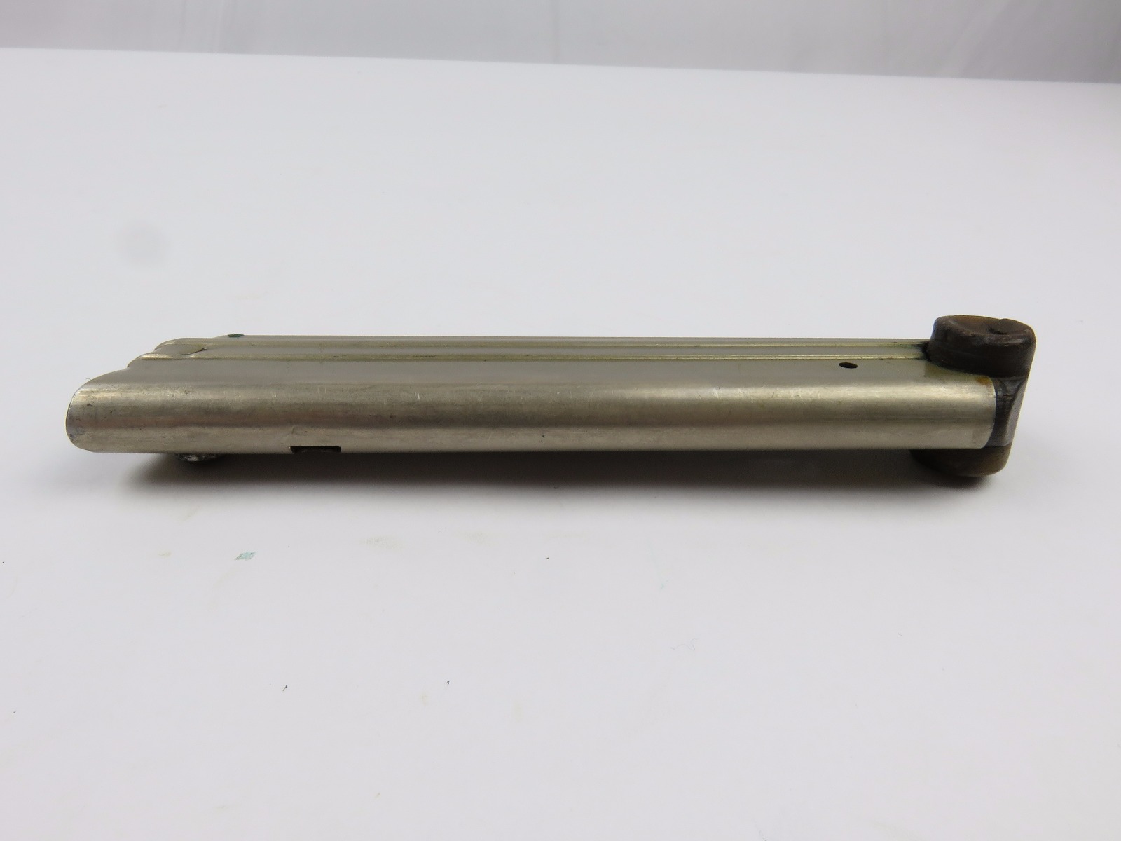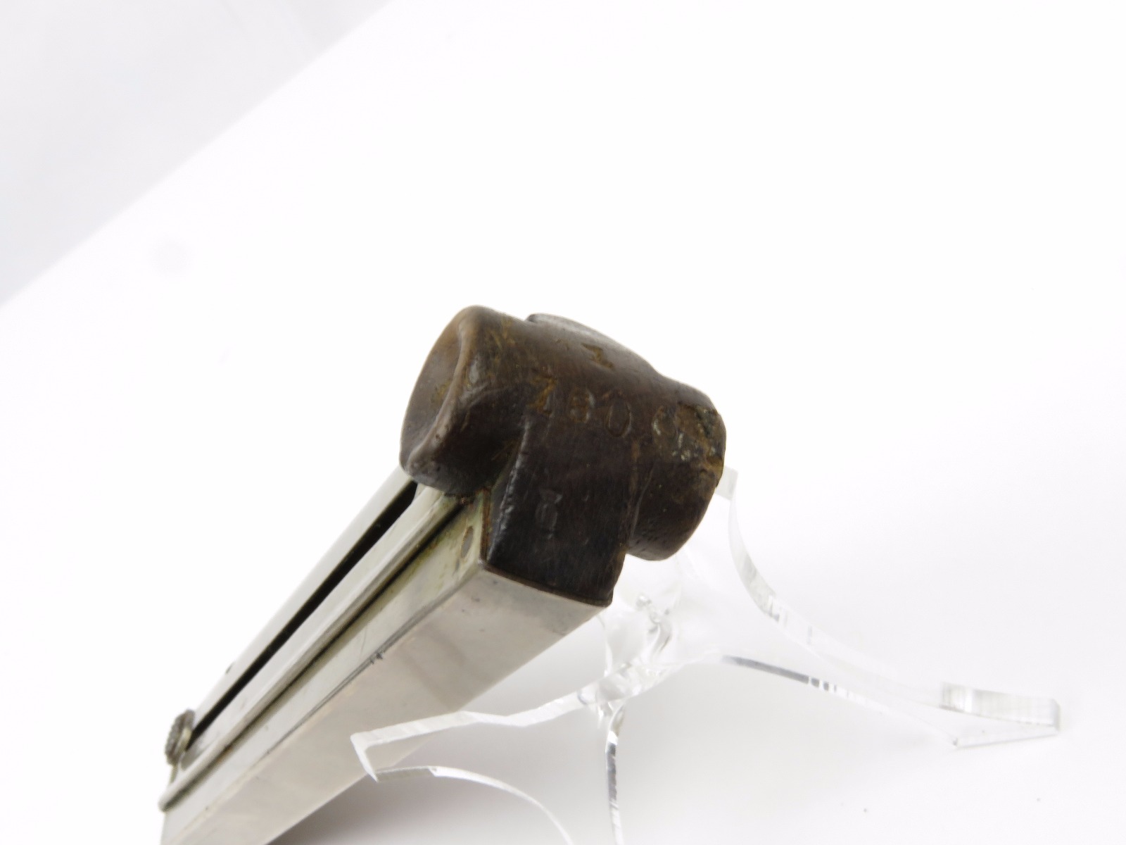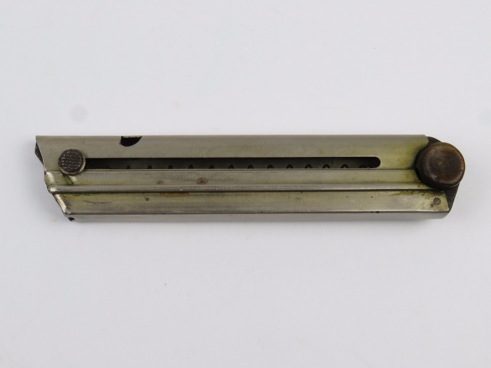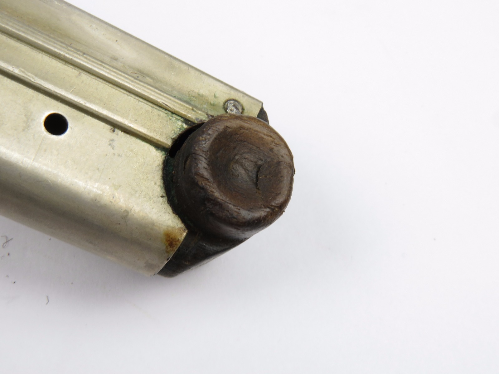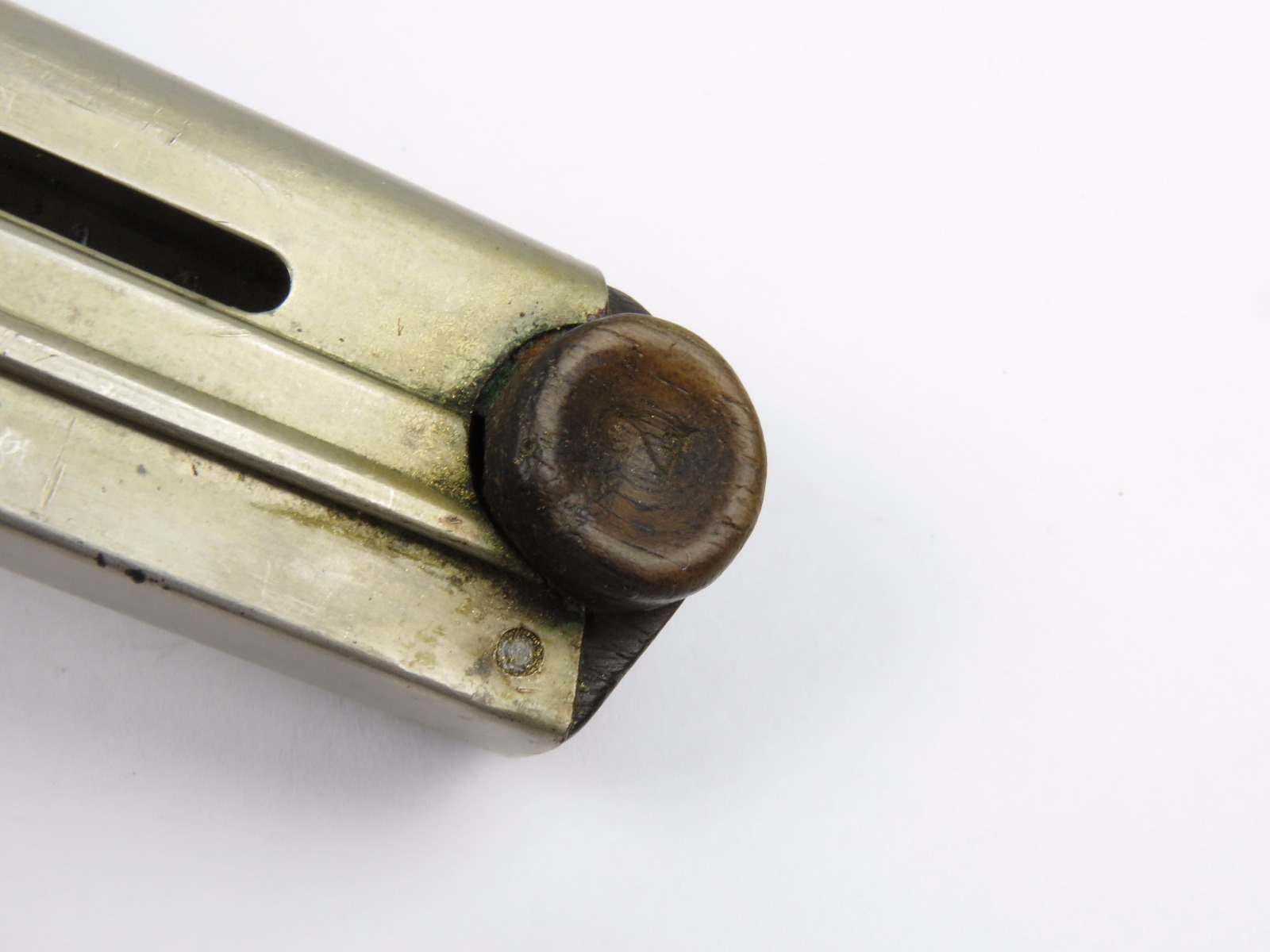 11/8/17 – This is an original WW1 Luger magazine. The magazine has a beautiful frame with light yellowing due to age. There is no rust or pitting. The wood base has some minor chew marks and flaws throughout – as shown in photos. The magazine appears to be marked “1” over “780” with an imperial proof at the base. Either side or “ear” of the wood bottom is marked with a “2”. Guaranteed original and fully functional.