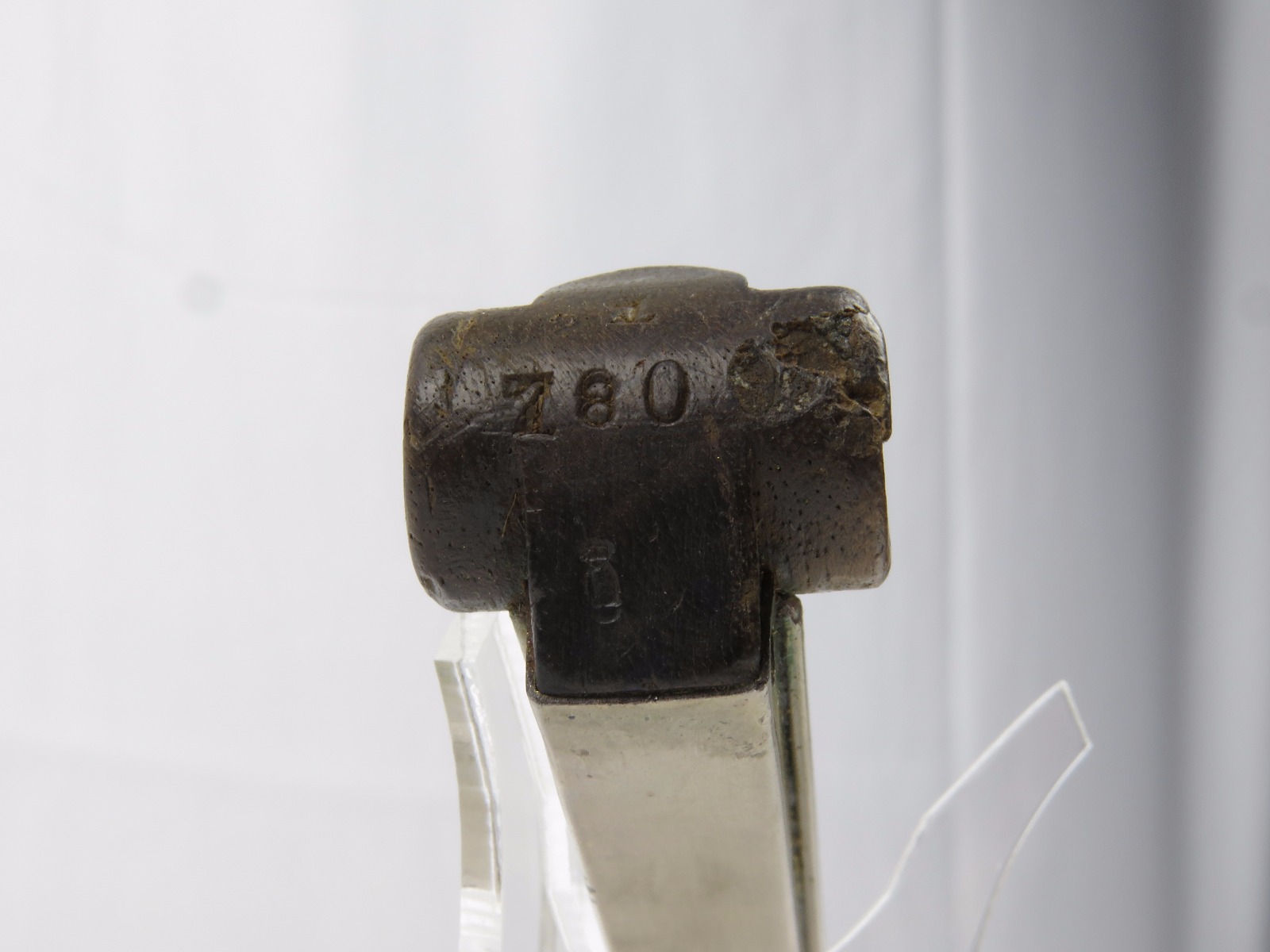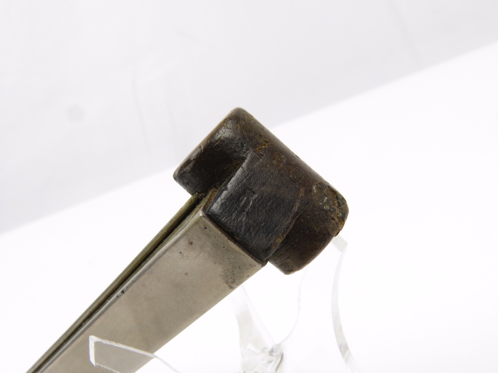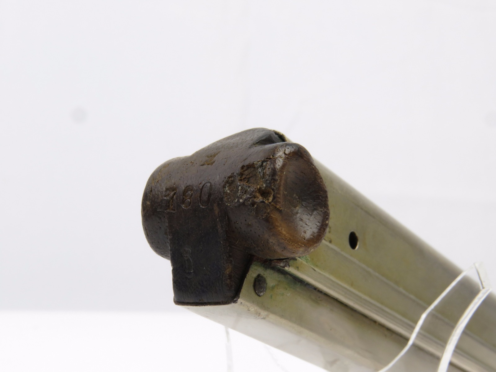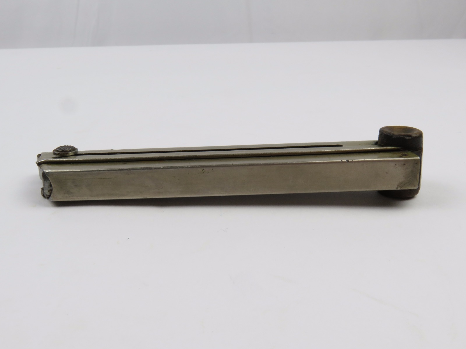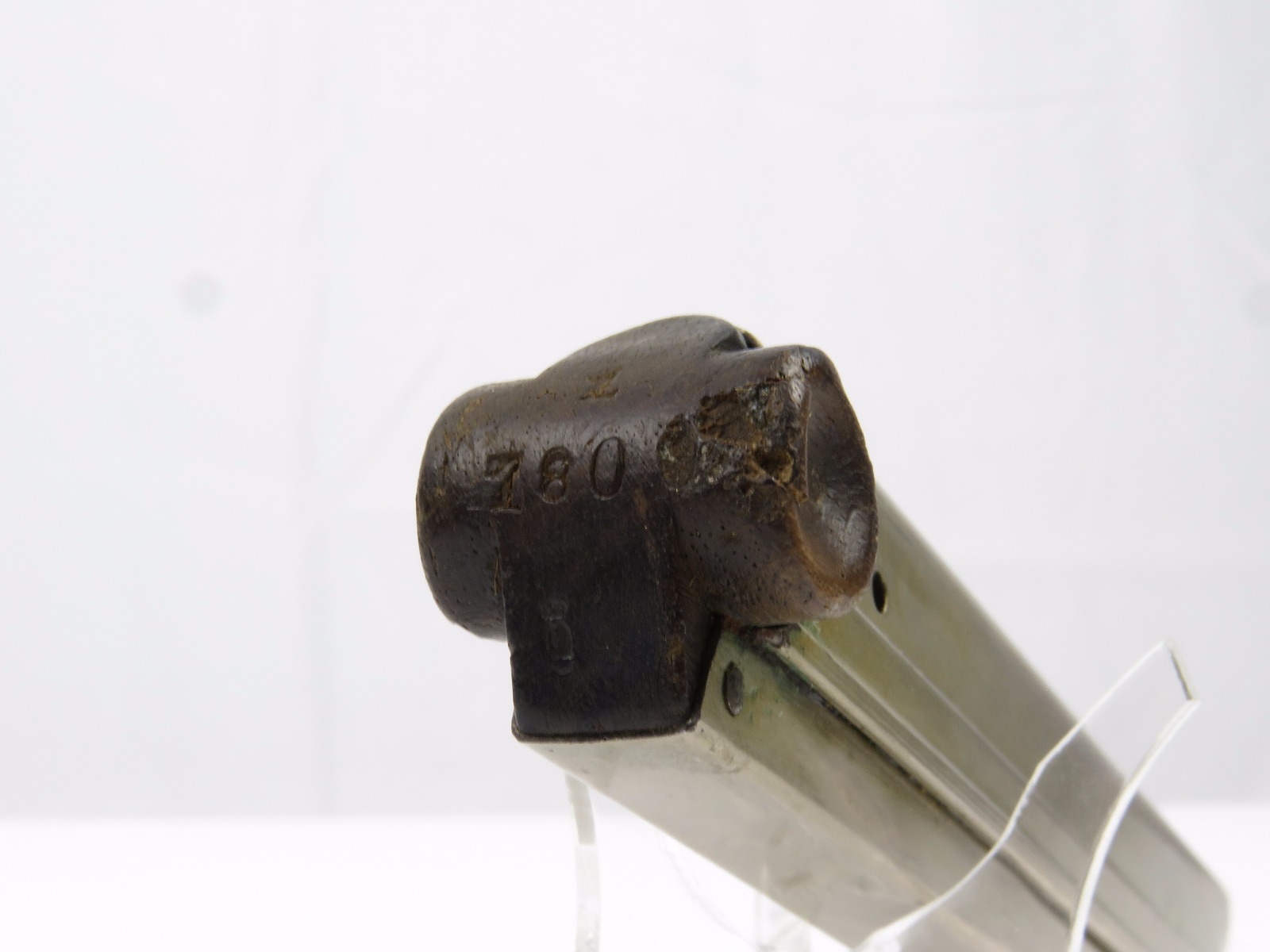 11/8/17 – This is an original WW1 Luger magazine. The magazine has a beautiful frame with light yellowing due to age. There is no rust or pitting. The wood base has some minor chew marks and flaws throughout – as shown in photos. The magazine appears to be marked “1” over “780” with an imperial proof at the base. Either side or “ear” of the wood bottom is marked with a “2”. Guaranteed original and fully functional.